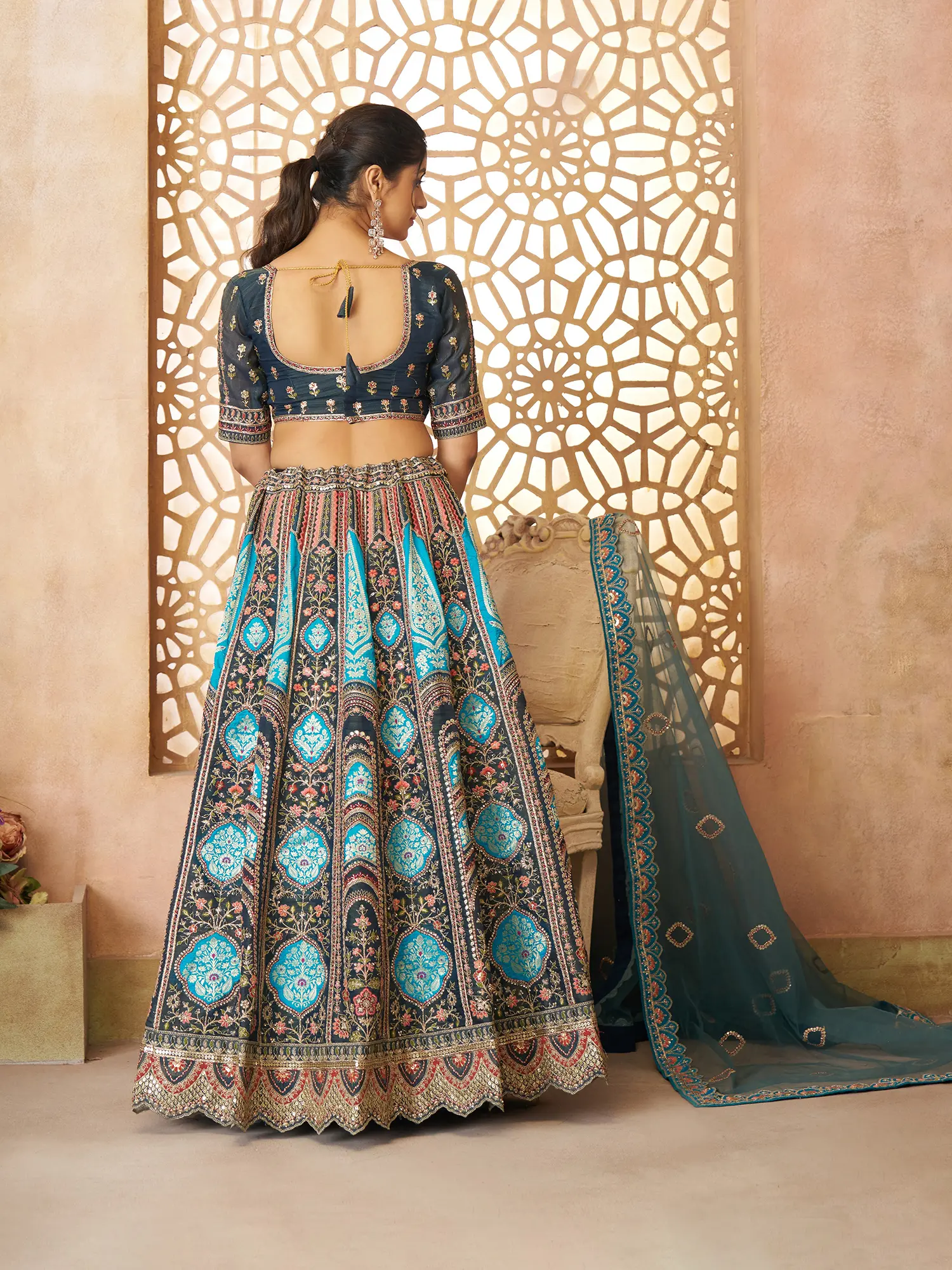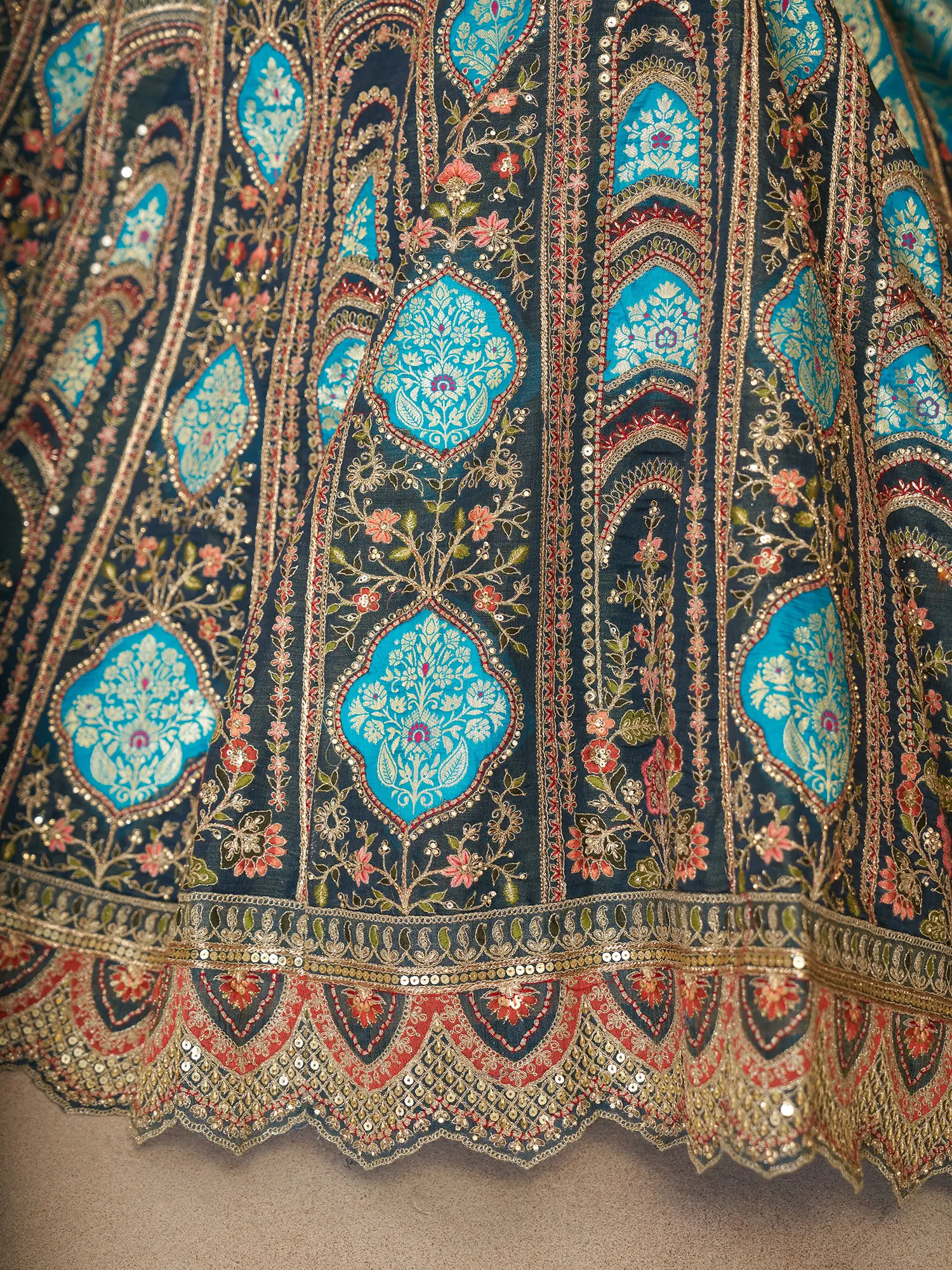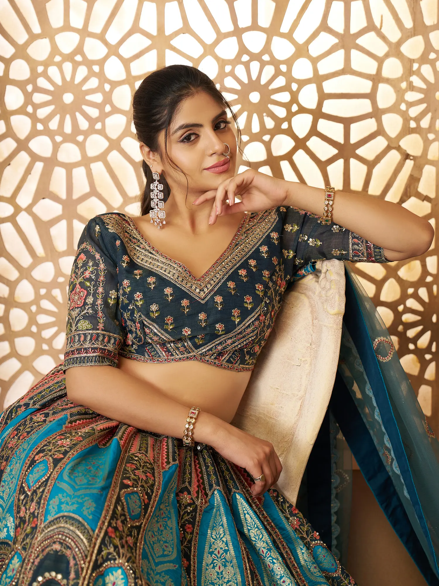 Teal Taffeta Silk Beautiful Floral Zari Embroidery Lehenga Choli with Beige Sheer Dupatta
