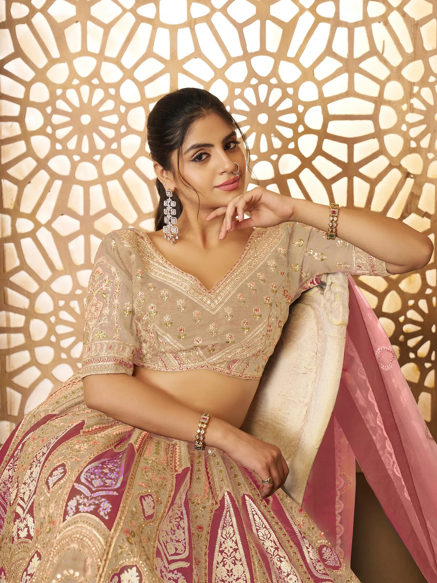 Step into a realm of timeless beauty with this exquisite lehenga choli, a masterpiece of traditional craftsmanship designed for unforgettable wedding celebrations. This ensemble is more than just clothing; it's a statement of grace, heritage, and sophisticated style. The intricate detailing and luxurious fabrics create a captivating allure, ensuring you'll be the center of attention.