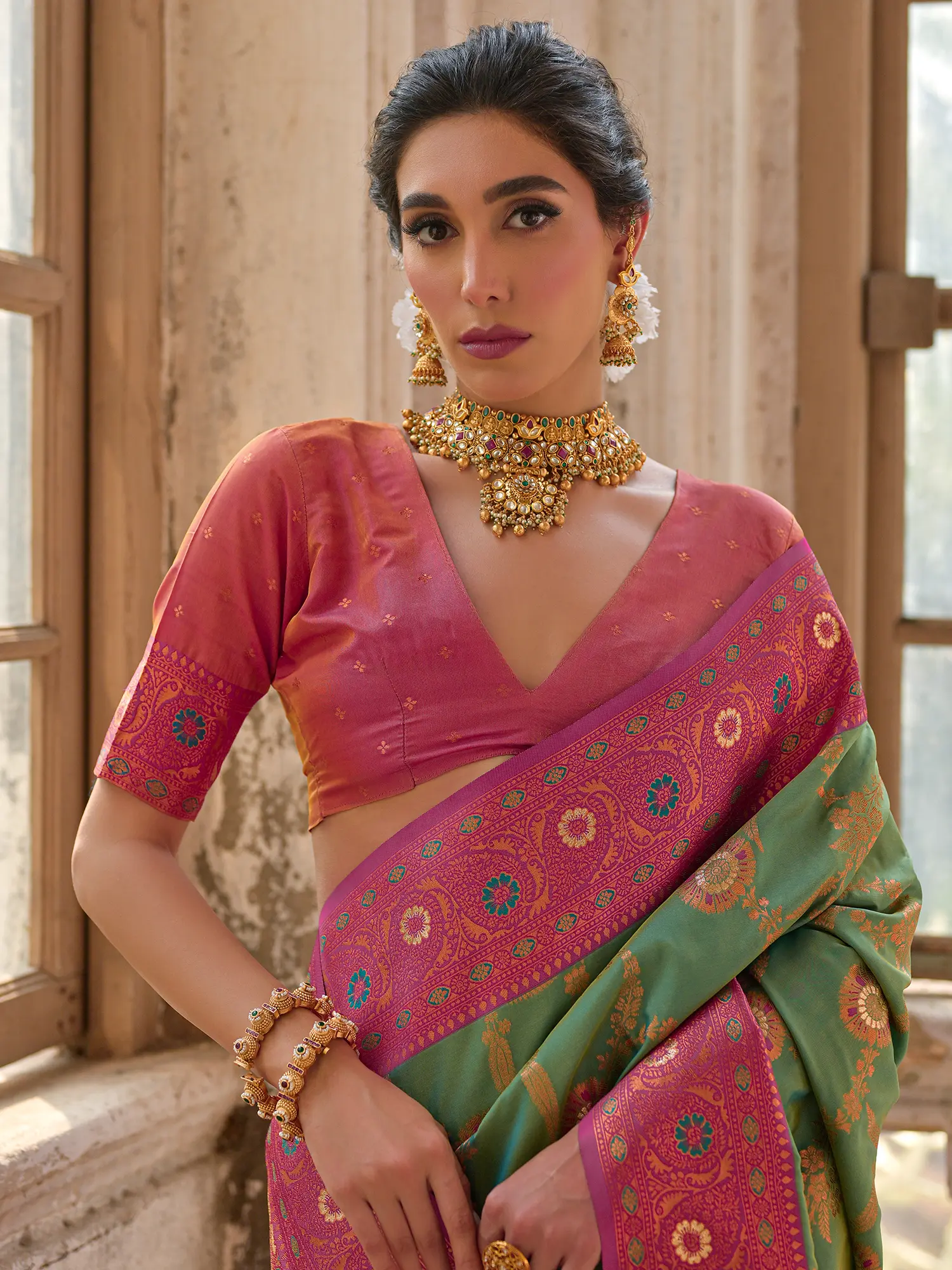 The olive green and fuchsia pink combination creates a visual masterpiece. The deep, rich olive green provides a sophisticated backdrop, allowing the fuchsia pink accents to pop with vibrant energy. This striking contrast is meticulously balanced, resulting in a saree that is both elegant and bold. The interplay of colours is further enhanced by the shimmering zari work, which adds depth and dimension to the design. The subtle shimmer of the zari complements the soft sheen of the silk, creating a mesmerizing effect that captures the light beautifully.