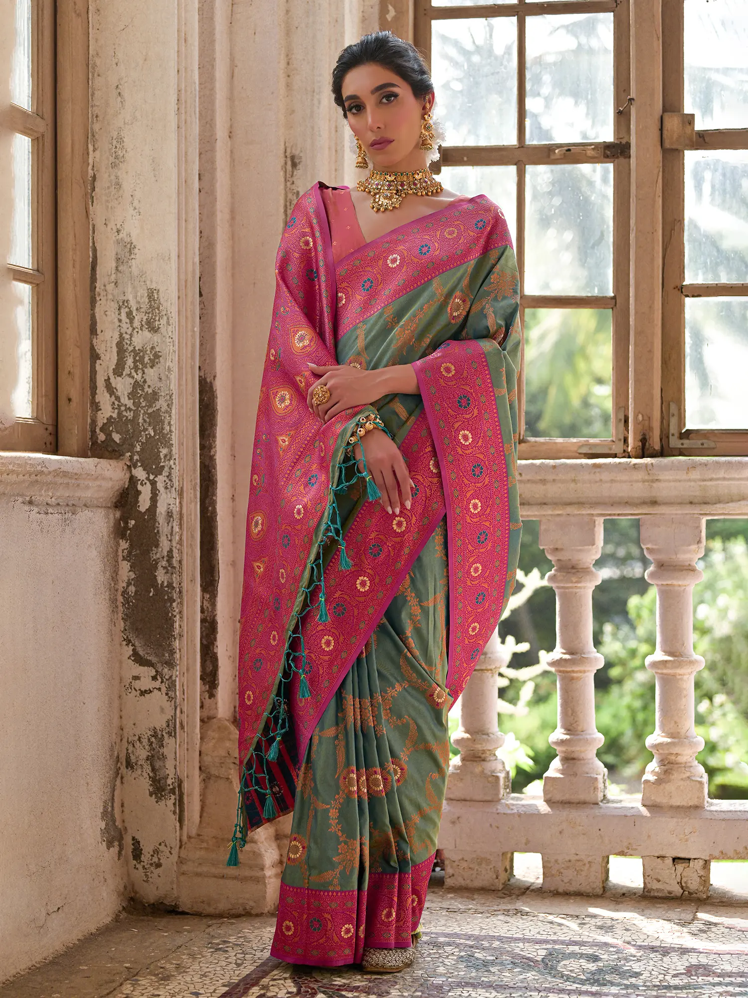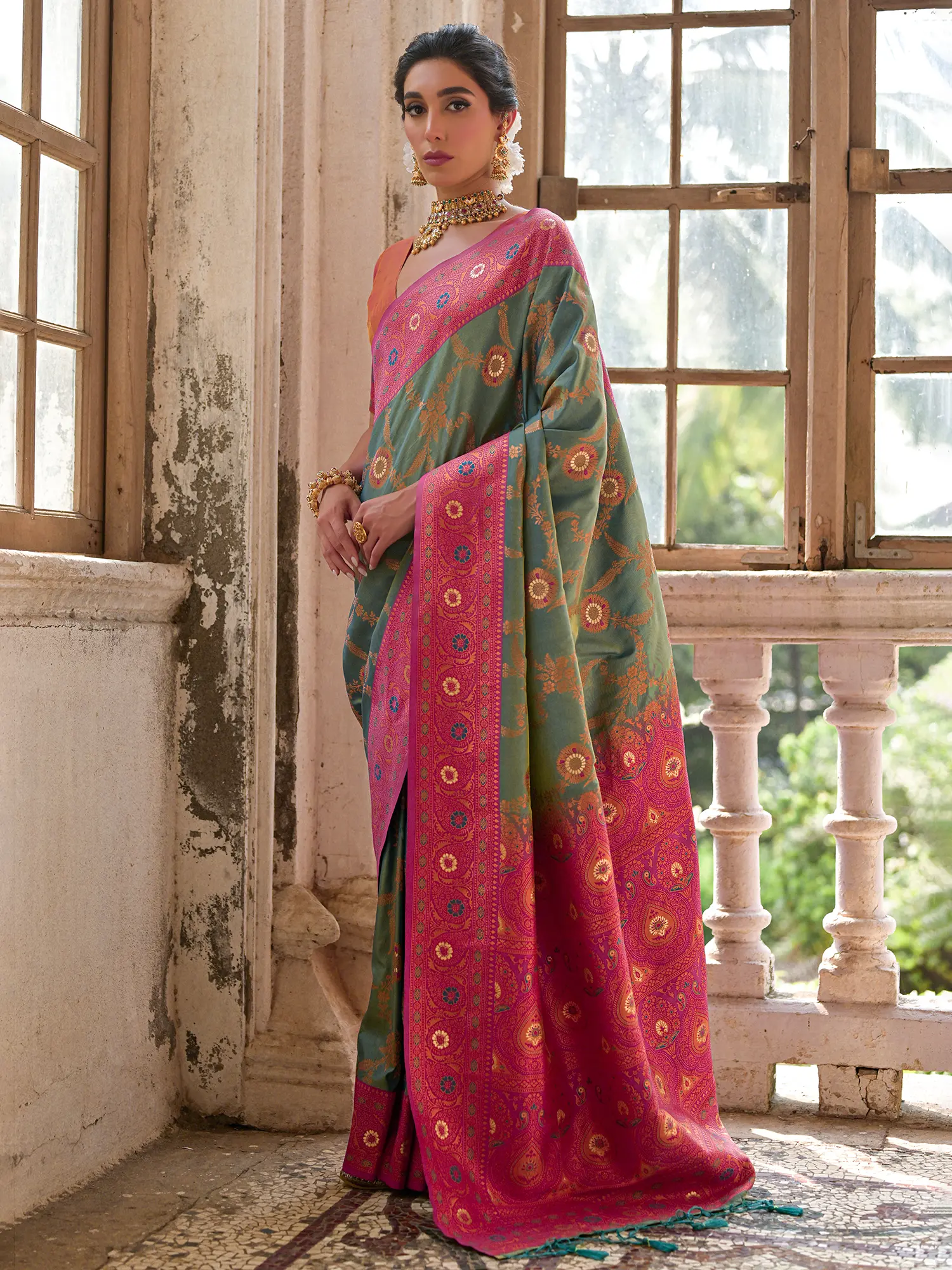 Sea Green Banarasi Saree with Magenta Pink Border and Golden Zari Motifs