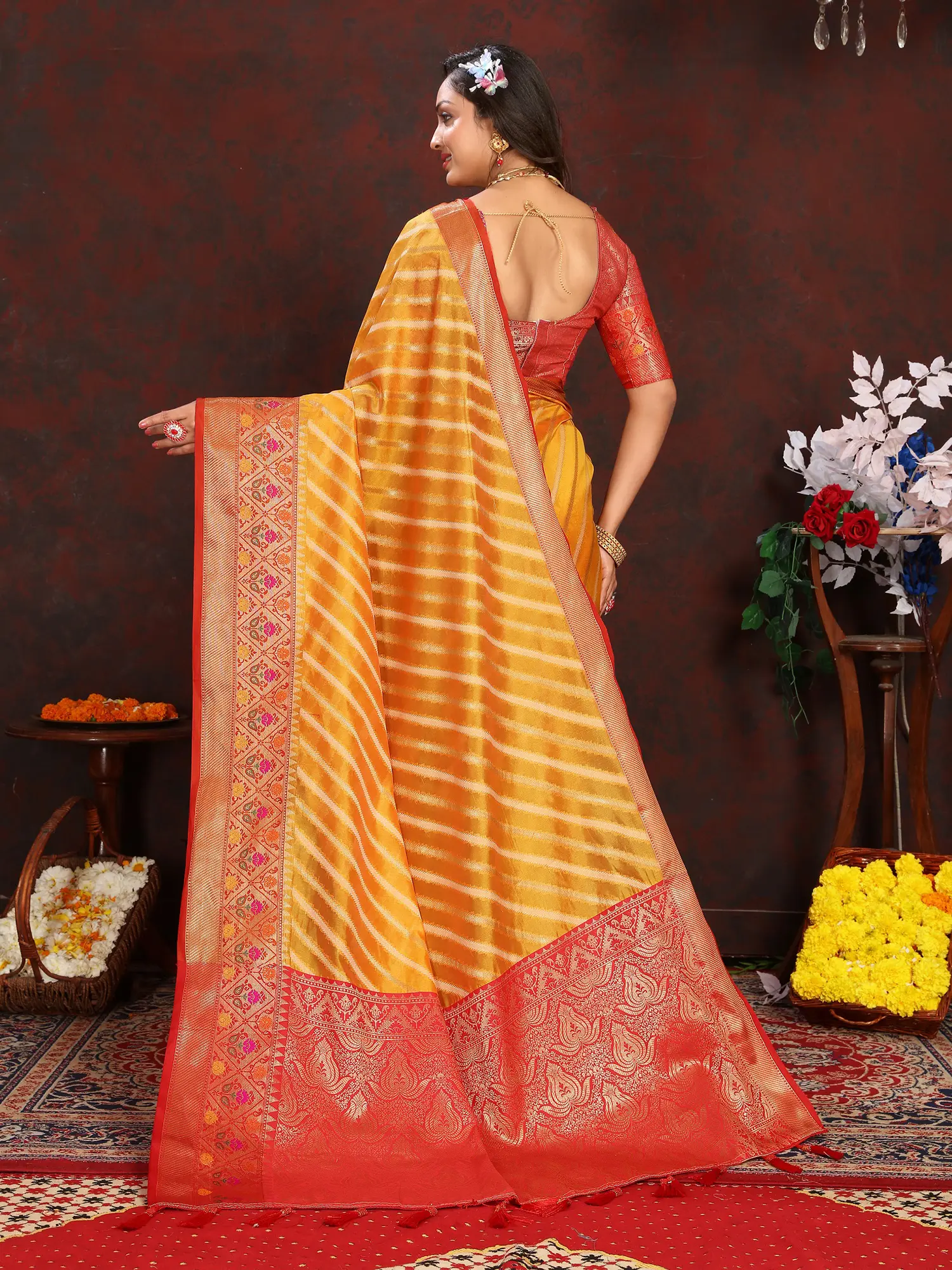 Designed to make a statement, this saree is the epitome of traditional festive and wedding wear for women. Its resplendent charm makes it an ideal choice for grand occasions such as weddings, receptions, festivals, and celebratory gatherings. Imagine gracing a wedding ceremony, turning heads as the sunlight catches the exquisite weave, or celebrating a joyous festival with an outfit that perfectly embodies the spirit of the occasion. The vibrant yellow, coupled with the deep red border, creates a harmonious blend that is both eye-catching and deeply traditional. This saree is a celebration of womanhood, designed to accentuate grace and beauty.