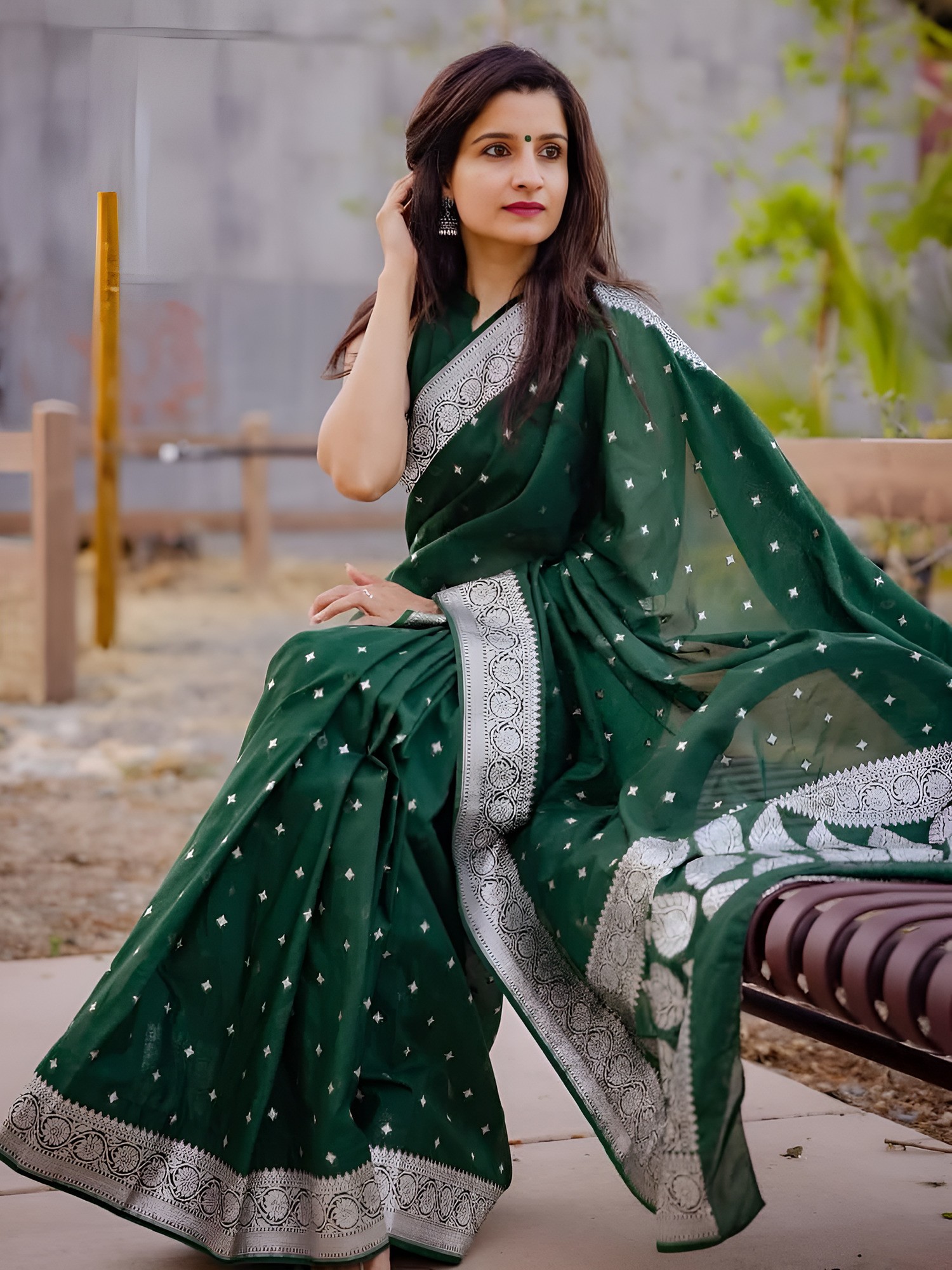 Banarasi Saree with All-over Zari Woven Bootis and Floral Vine Contrast Border-Pallu