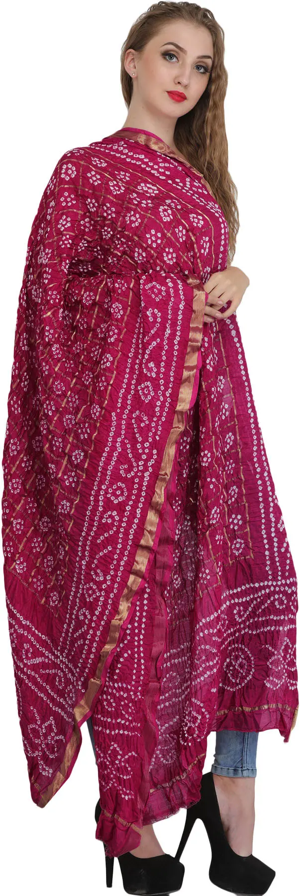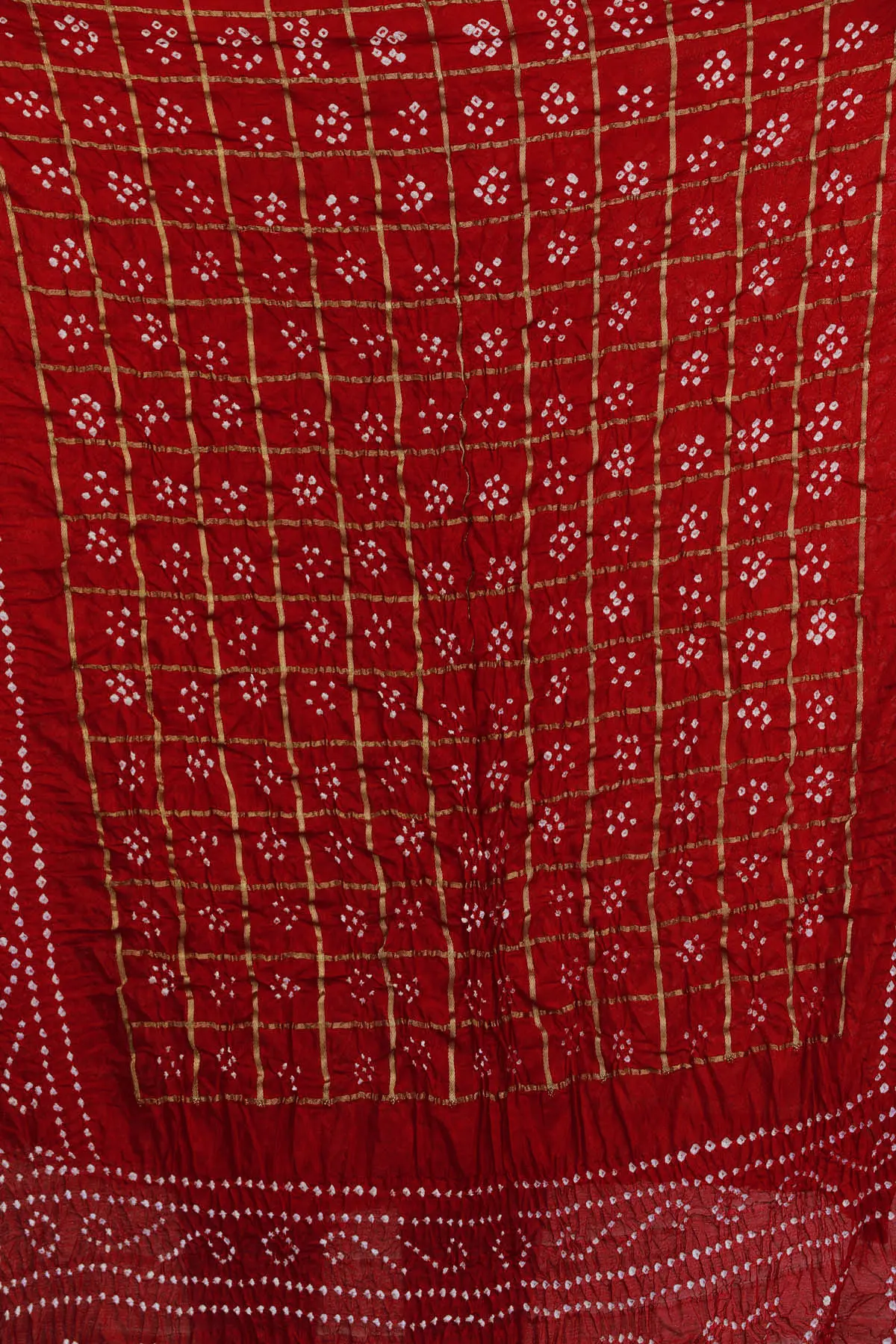 Gharchola- a traditional ladies’ apparel of the Gujarat region in India is a part of women’s wear closely associated with marriage and the welcoming of the bride into her new home. Ghar (home) and Chola (cloth) thus is the garment worn by the lady when she enters her husband’s home. Designed in the traditional style of Gujarat and Rajasthan, with a grid pattern, typical dot pattern of Bandhani, and golden border, this dupatta perfectly captures the beauty of Bandhani. Available colors auspicious and striking, this dupatta can be added to your Indian or Indo-ethnic outfit to instantly add a classic Indian touch to your look.