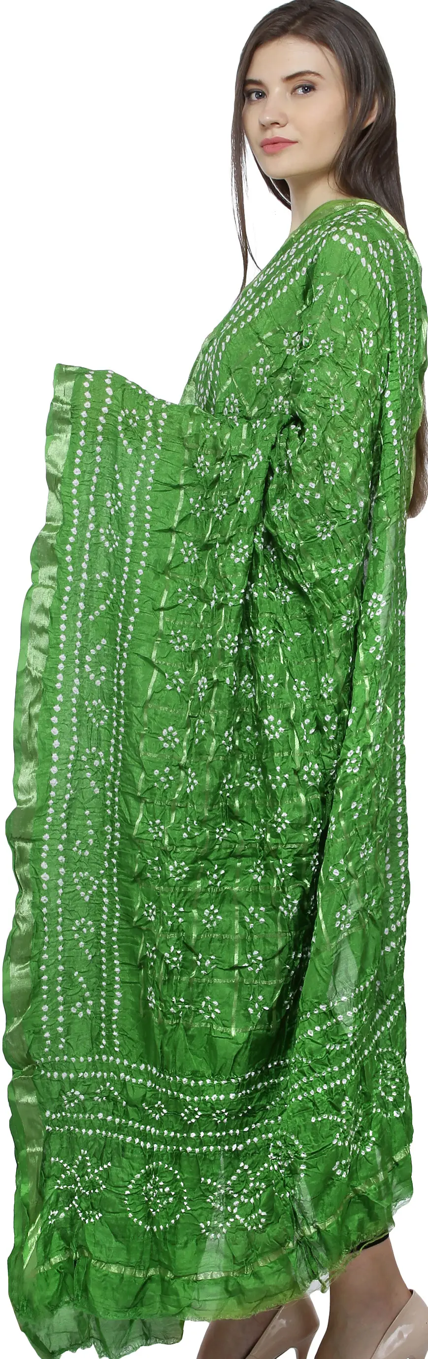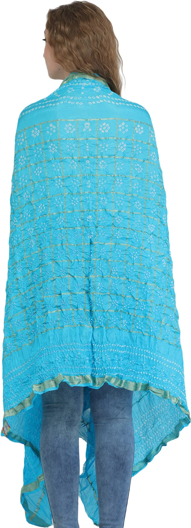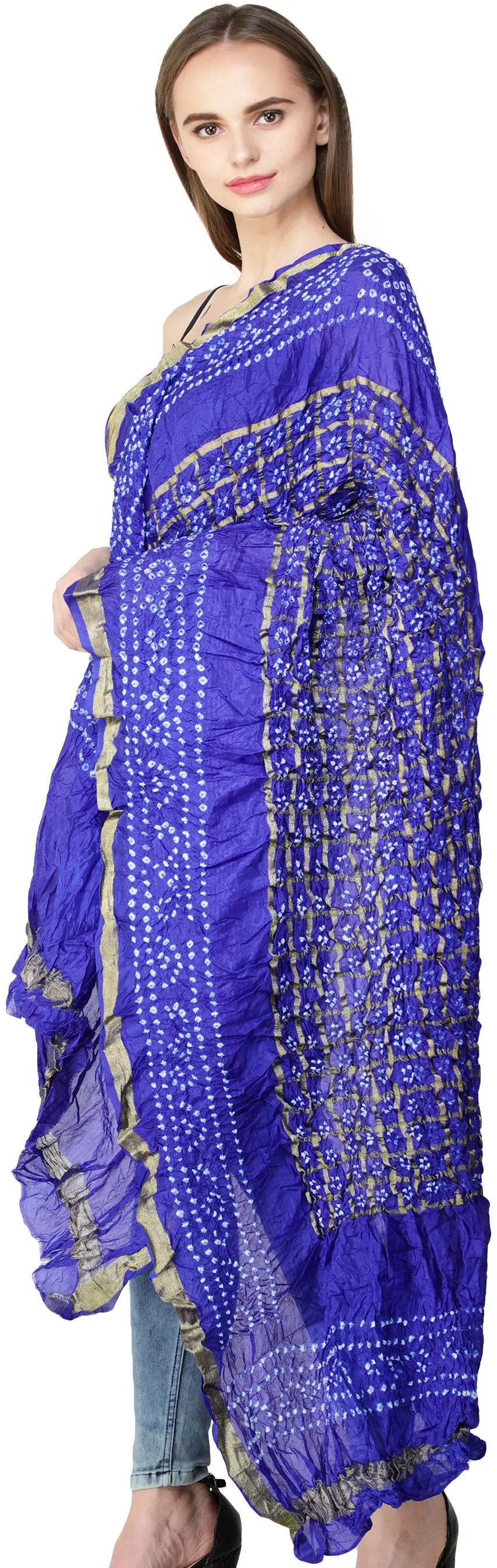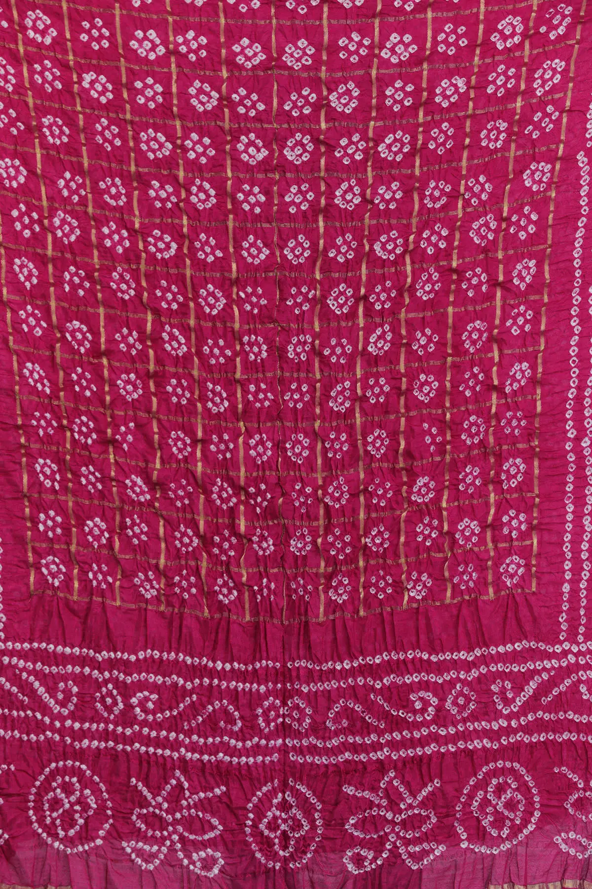 Gharchola- a traditional ladies’ apparel of the Gujarat region in India is a part of women’s wear closely associated with marriage and the welcoming of the bride into her new home. Ghar (home) and Chola (cloth) thus is the garment worn by the lady when she enters her husband’s home. Designed in the traditional style of Gujarat and Rajasthan, with a grid pattern, typical dot pattern of Bandhani, and golden border, this dupatta perfectly captures the beauty of Bandhani. Available colors auspicious and striking, this dupatta can be added to your Indian or Indo-ethnic outfit to instantly add a classic Indian touch to your look.