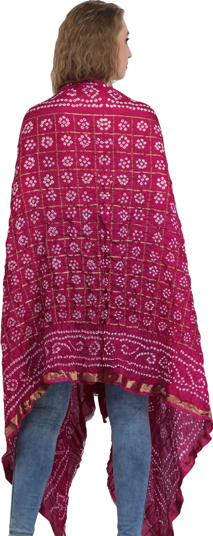 Gharchola- a traditional ladies’ apparel of the Gujarat region in India is a part of women’s wear closely associated with marriage and the welcoming of the bride into her new home. Ghar (home) and Chola (cloth) thus is the garment worn by the lady when she enters her husband’s home. Designed in the traditional style of Gujarat and Rajasthan, with a grid pattern, typical dot pattern of Bandhani, and golden border, this dupatta perfectly captures the beauty of Bandhani. Available colors auspicious and striking, this dupatta can be added to your Indian or Indo-ethnic outfit to instantly add a classic Indian touch to your look.