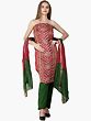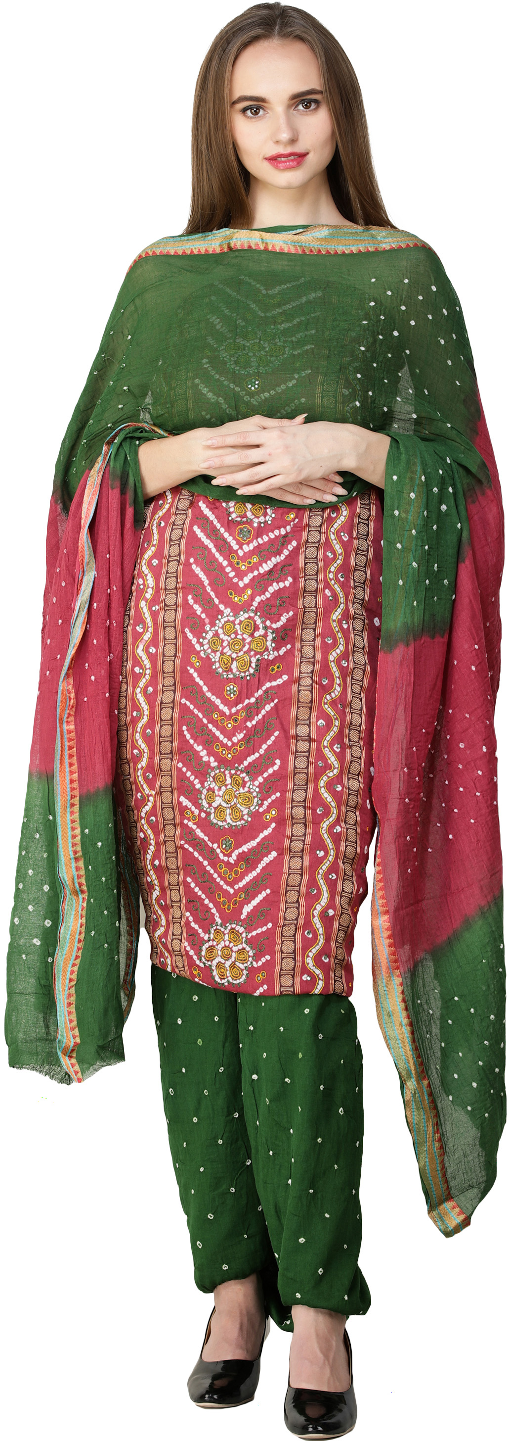 From the vibrant landscapes of Gujarat, the Bandhani Tie-Dyed Salwar Kameez Fabric with Floral Embroidery and Mirrors becomes a celebration of color and craftsmanship. The bandhani tie-dye patterns, combined with floral embroidery and mirrors, create a vibrant canvas. Draping oneself in this fabric is like wearing a piece of Gujarat's rich textile legacy, where tradition and contemporary allure meet in perfect harmony.