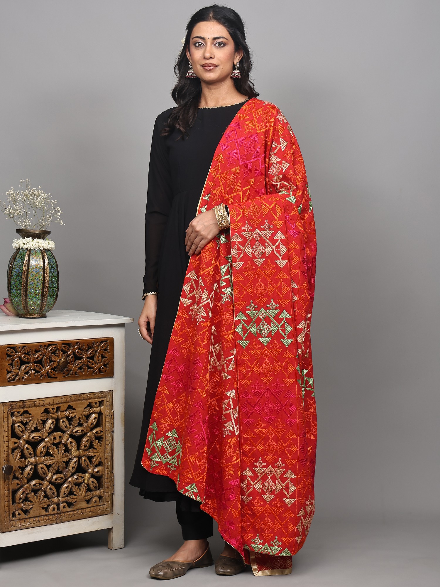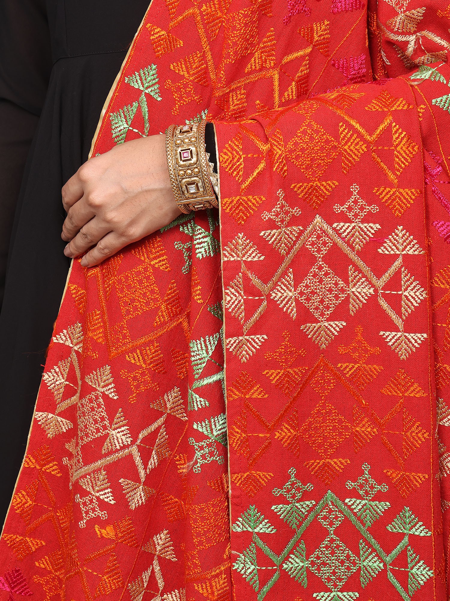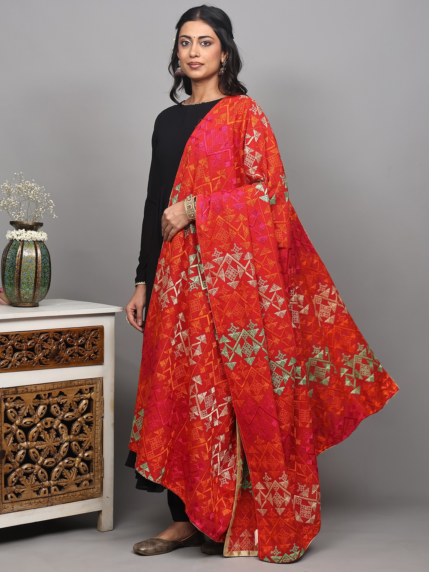 Fiesta-Red Phulkari Dupatta from Punjab with Multicolor Floral Patterns and Zari Border