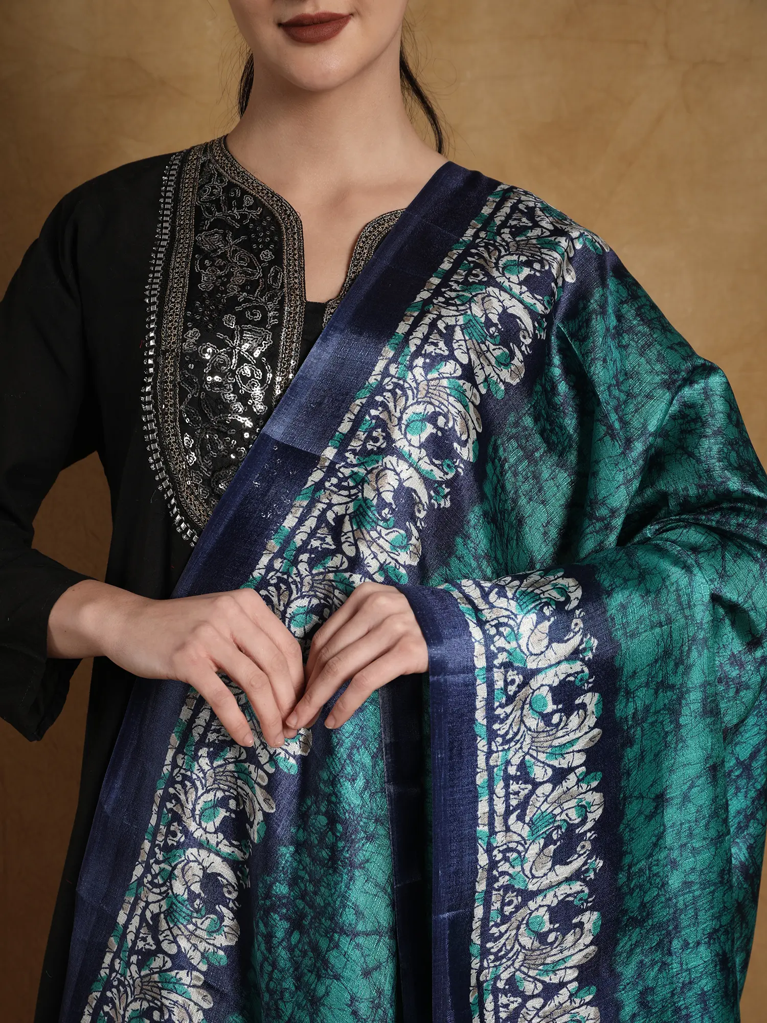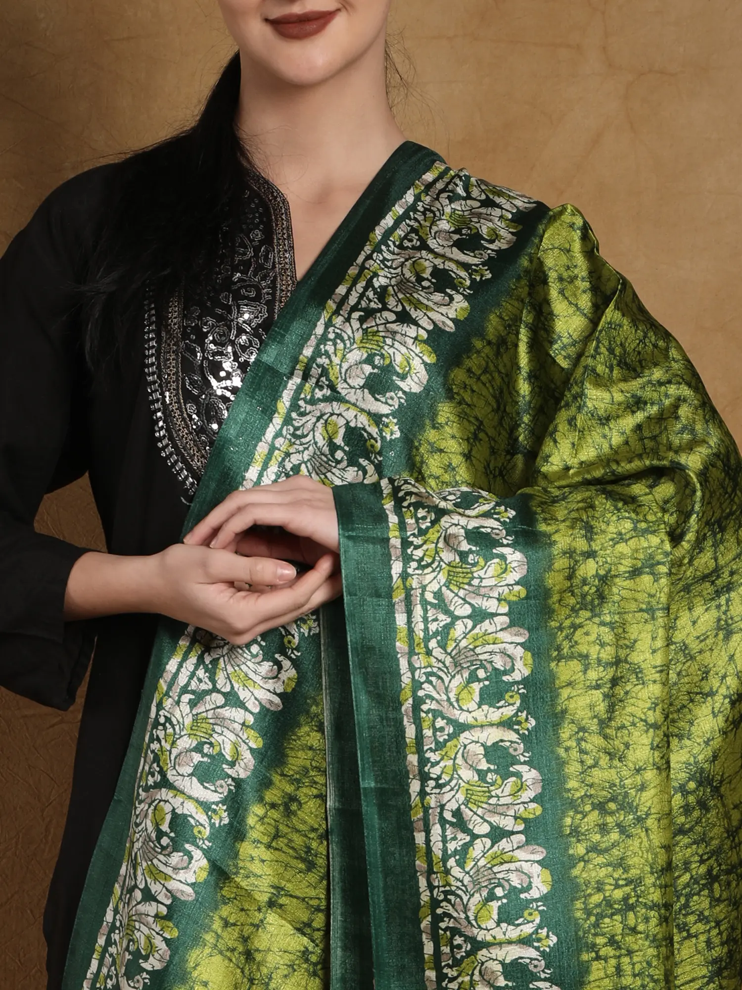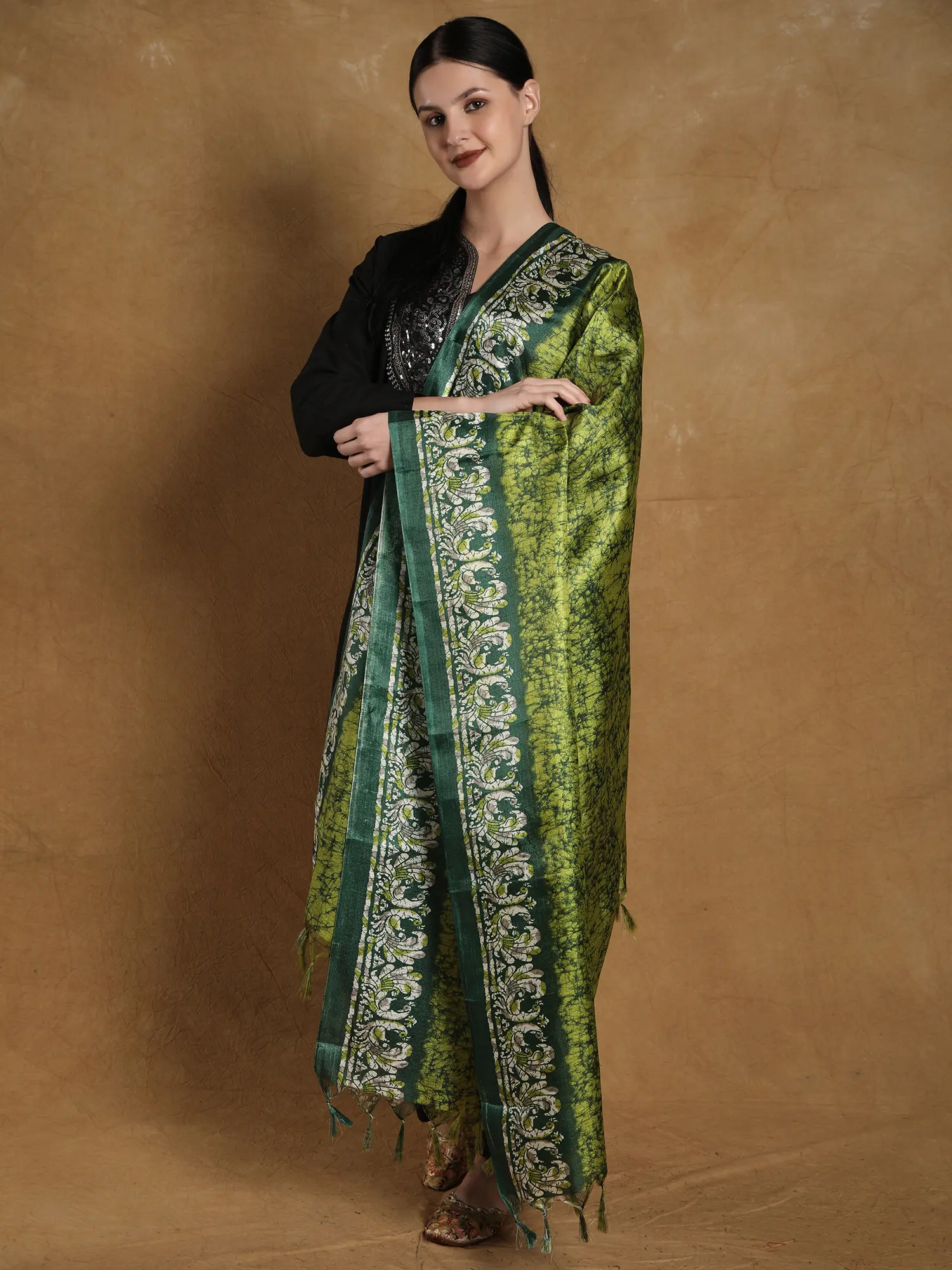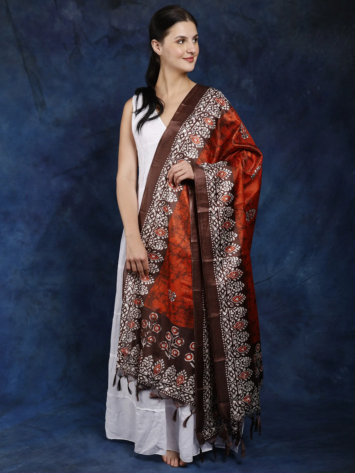 The meshed magic of Batik patterns is recreated in this art silk dupatta, covered in classic Batik technique-inspired elements. Tassels on the length of the dupatta and beautiful peacock motifs on the border add a stylish beauty to the gorgeousness of the fabric, making it a fashionable addition to your wardrobe.