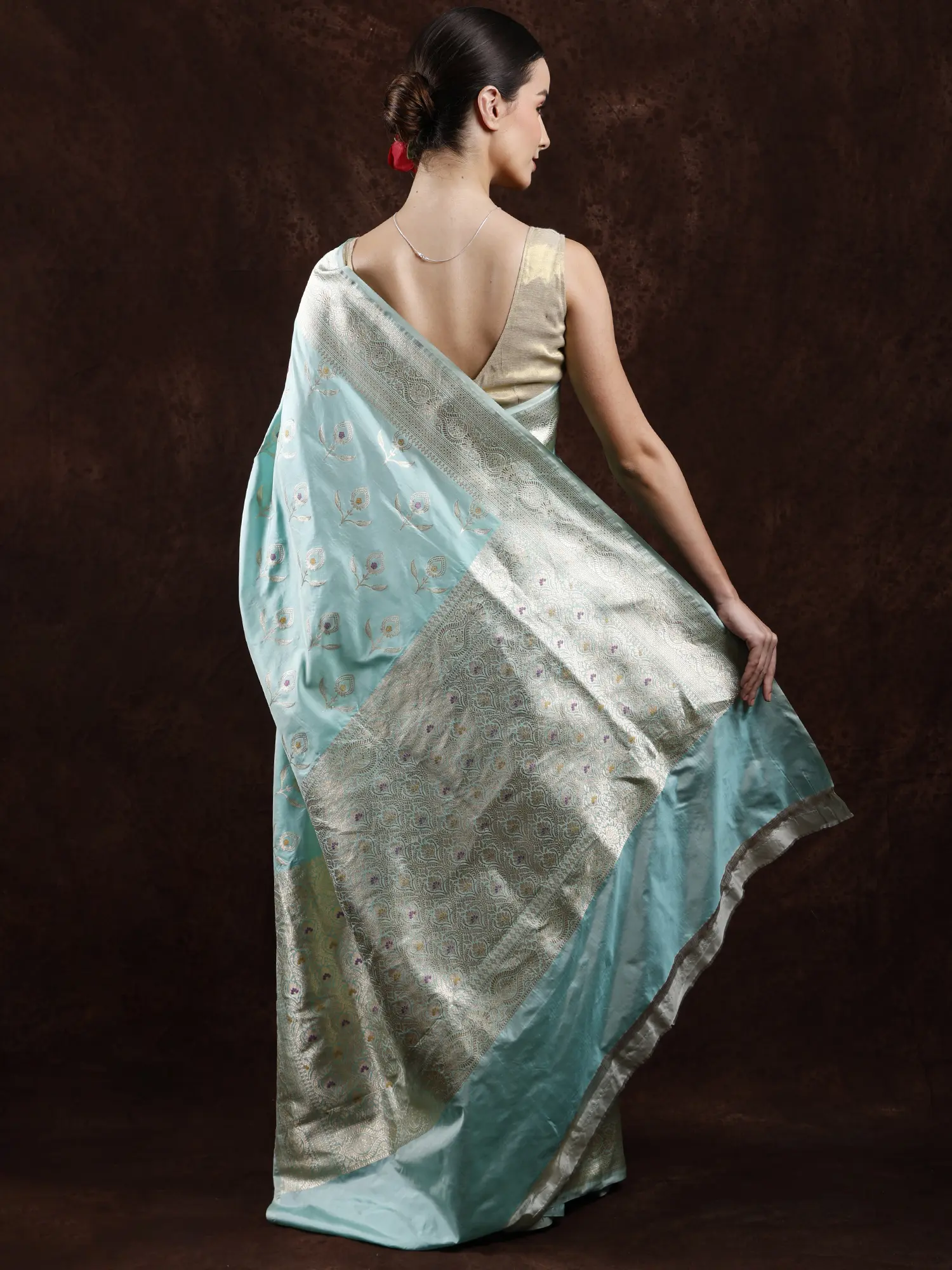 Become a vision of etherealness draped in this pure silk Banarasi saree, with the most gentle shade of blue!