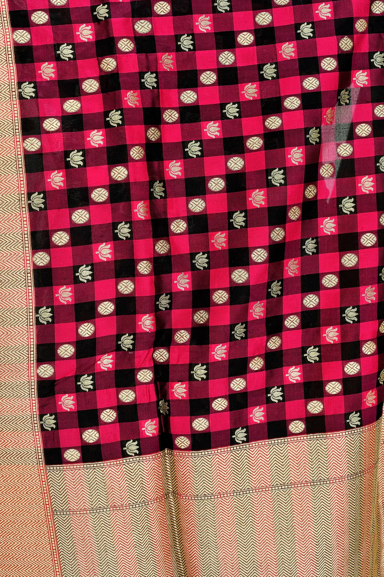 A chic chequered background with bold black lines looks striking on the pink silk sari, in which the auspicious Kamala or lotus and Rudraksha motifs are encased in diagonally running lines.