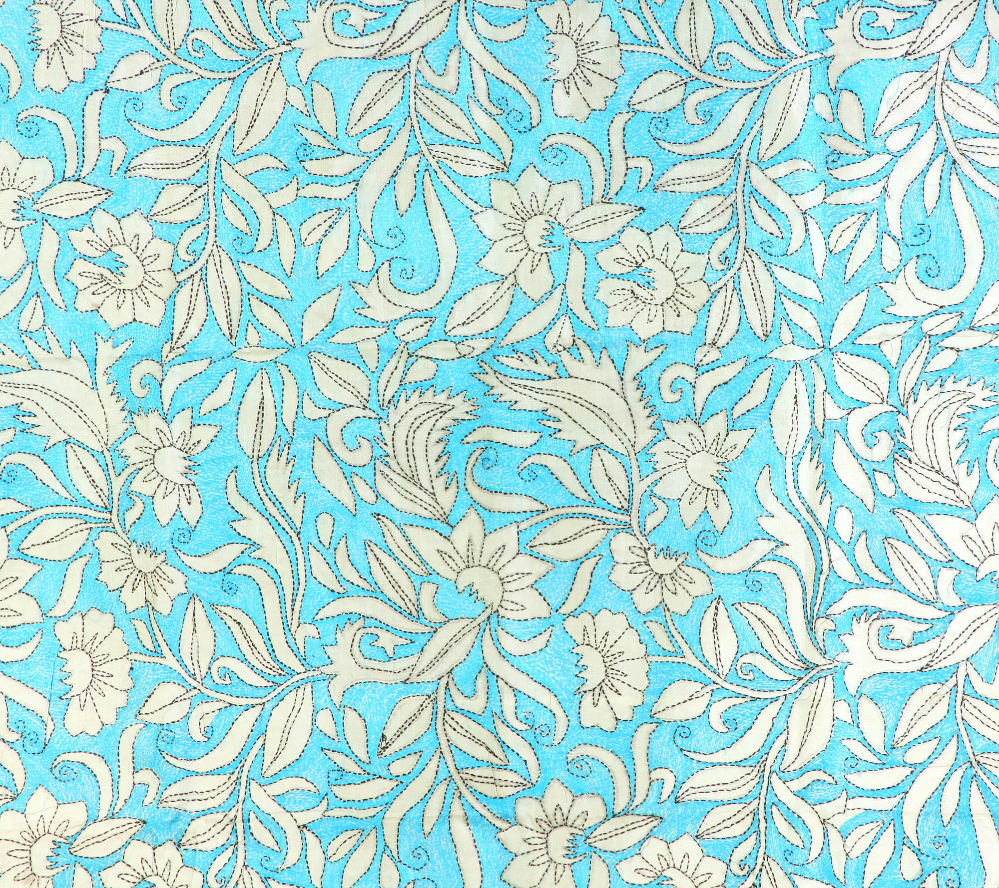 Immerse yourself in the artistry of Kolkata with this exquisite Kantha shawl, a true testament to traditional Indian textile heritage. Crafted from the finest pure silk, this piece offers a luxurious drape and a soft, natural feel against the skin. The vibrant sky blue serves as a breathtaking backdrop for a captivating floral tapestry, meticulously rendered through the age-old Kantha embroidery technique. Each stitch is a whisper of history, passed down through generations of skilled artisans, transforming simple fabric into a wearable work of art.