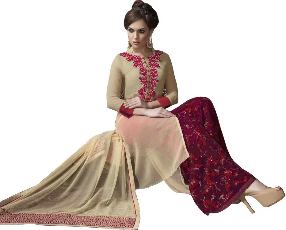 Rich-Carmine Fancy Embroidery Work And Sequins Work Full Sleeve Round Neck Salwar Suit With Matching Dupatta
