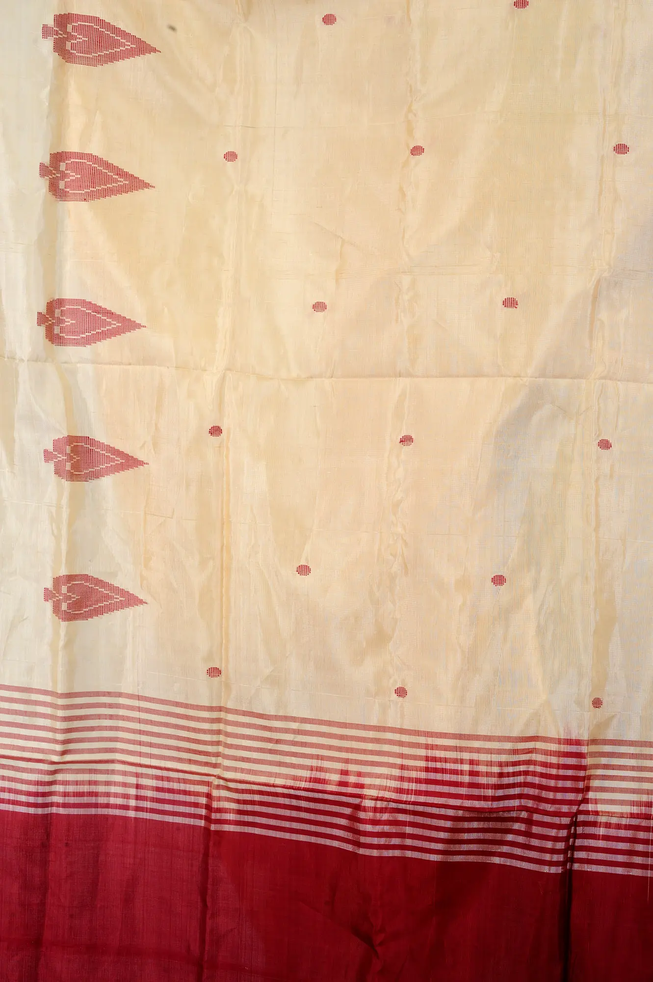 Beige and Red Sari from Tamil Nadu with Large Woven Bootis in Golden Thread