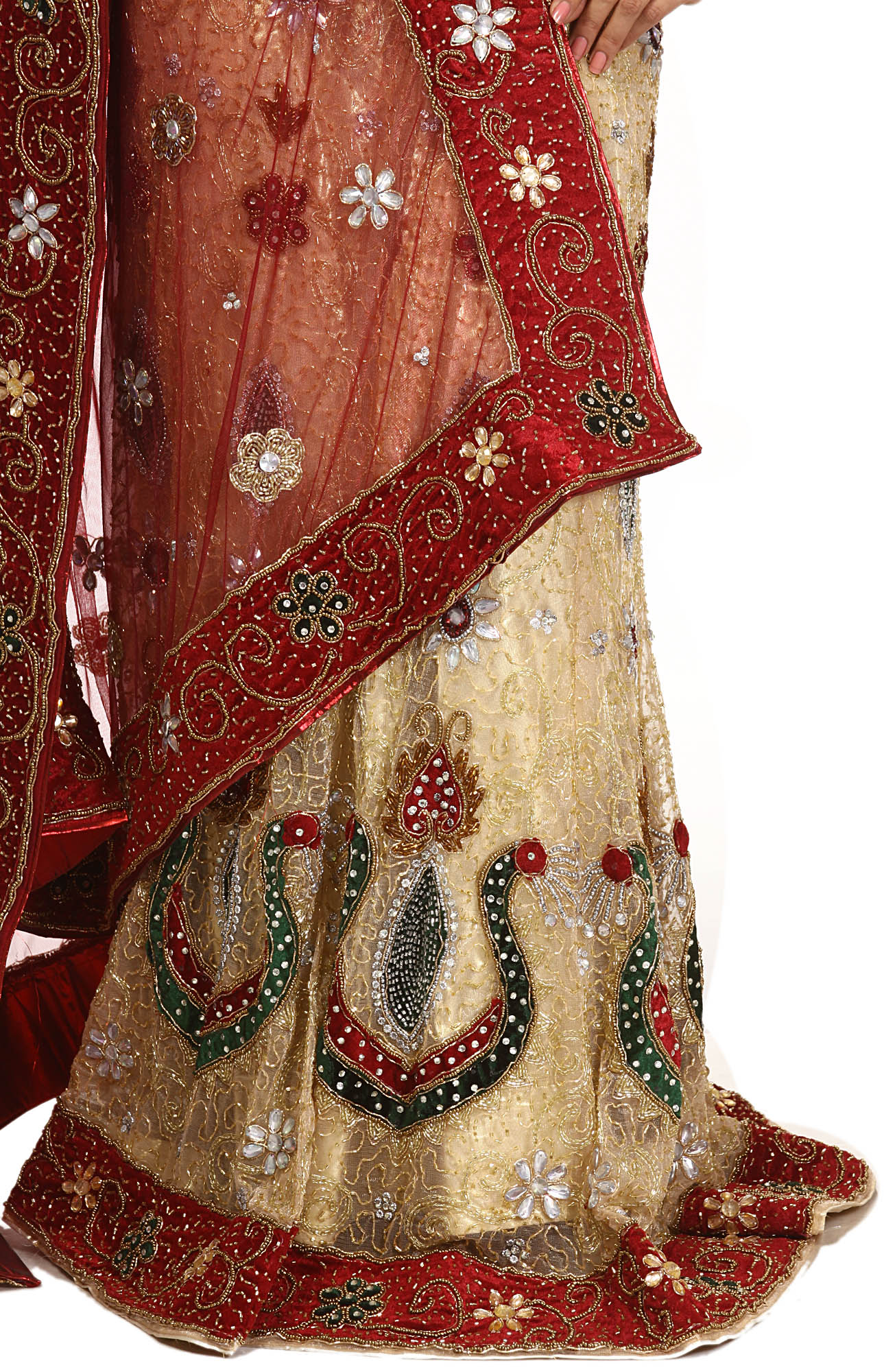 Completing the ensemble is a sheer, deep red net dupatta, edged with a coordinating border that mirrors the richness of the lehenga. The dupatta is also adorned with Zardozi embroidery and delicate floral patterns, ensuring a cohesive and stunning look. The vibrant contrast of the red against the beige creates a striking visual appeal, perfect for framing your face and adding a touch of drama. The soft, flowing nature of the net allows the dupatta to drape beautifully, adding an ethereal quality to your bridal appearance.