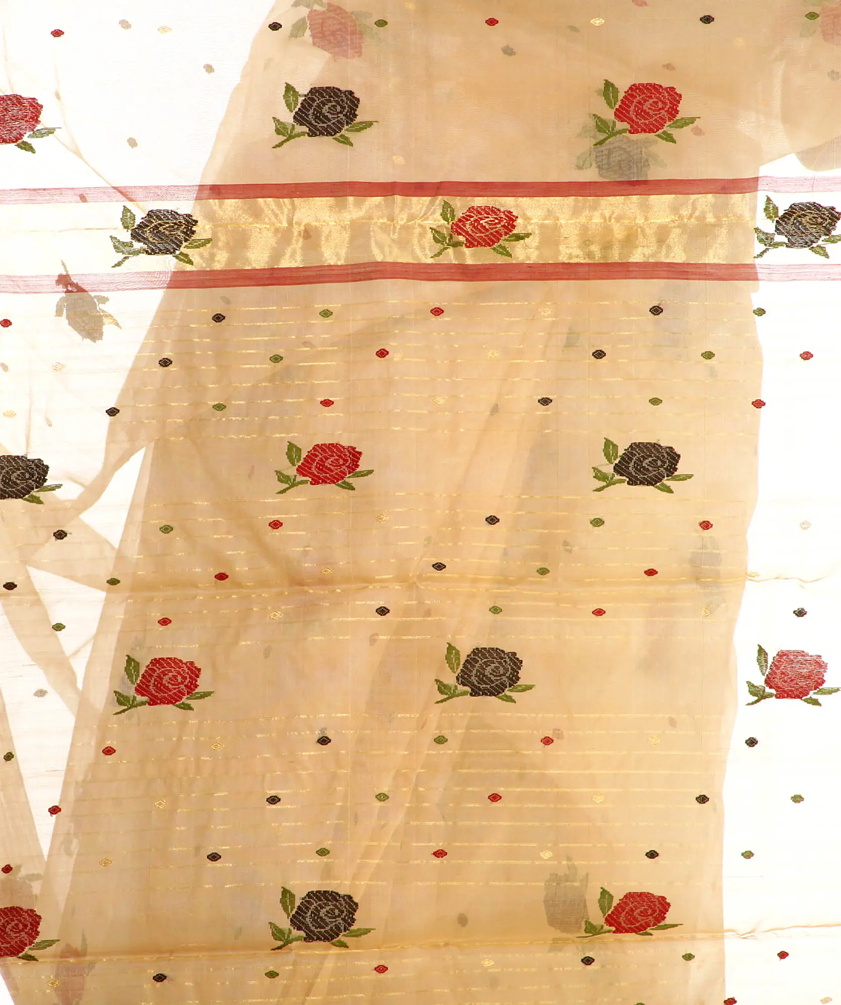 Experience the epitome of grace and sophistication with this exquisite pure silk Chanderi sari. Crafted from the finest silk, this sari drapes beautifully, offering a luxurious feel against the skin. The delicate beige hue serves as a perfect canvas for the intricate all-over woven bootis, each meticulously detailed with floral motifs in charming shades of red and black. These charming floral patterns are scattered across the fabric, creating a visually captivating effect that is both subtle and striking.