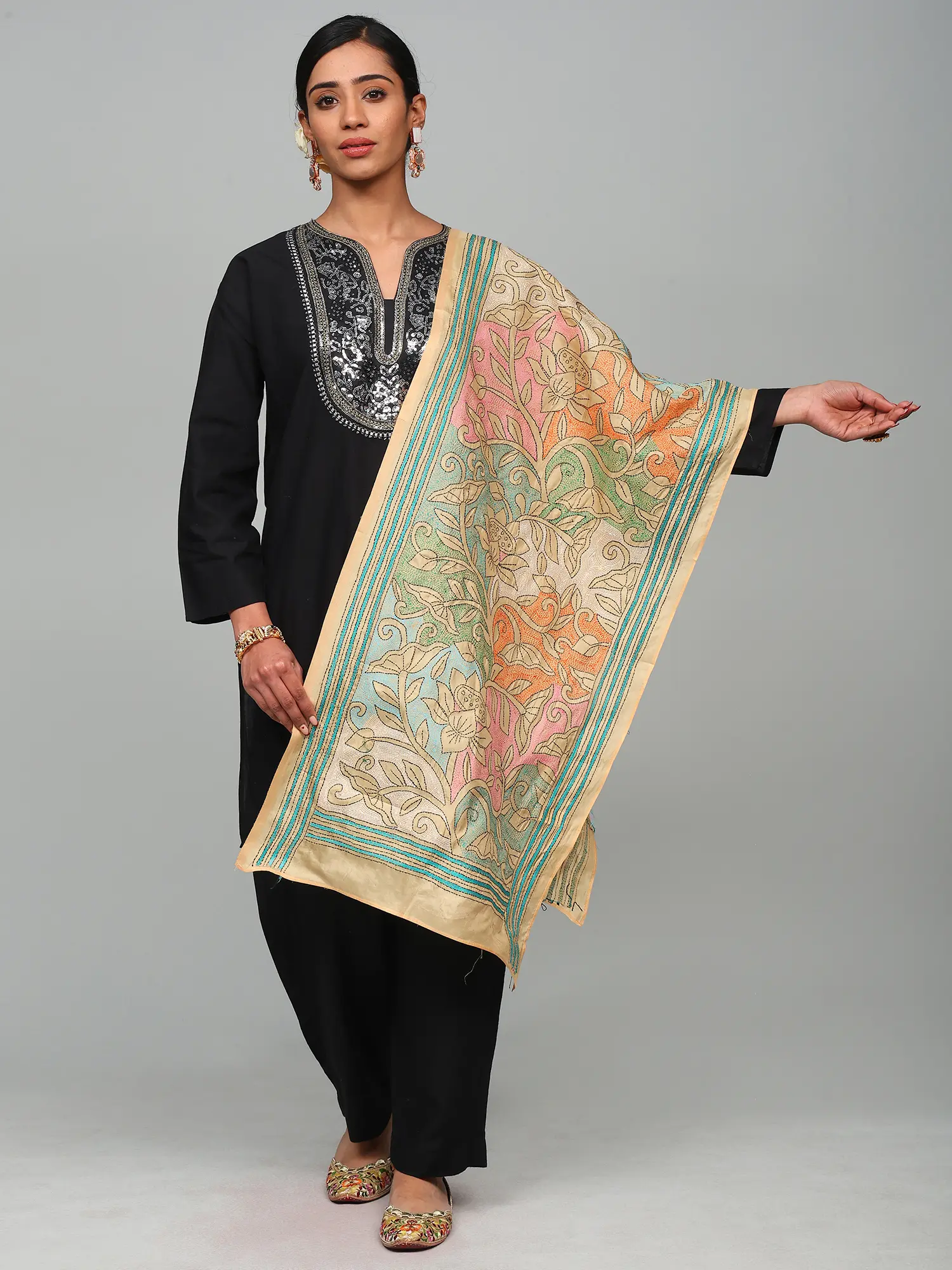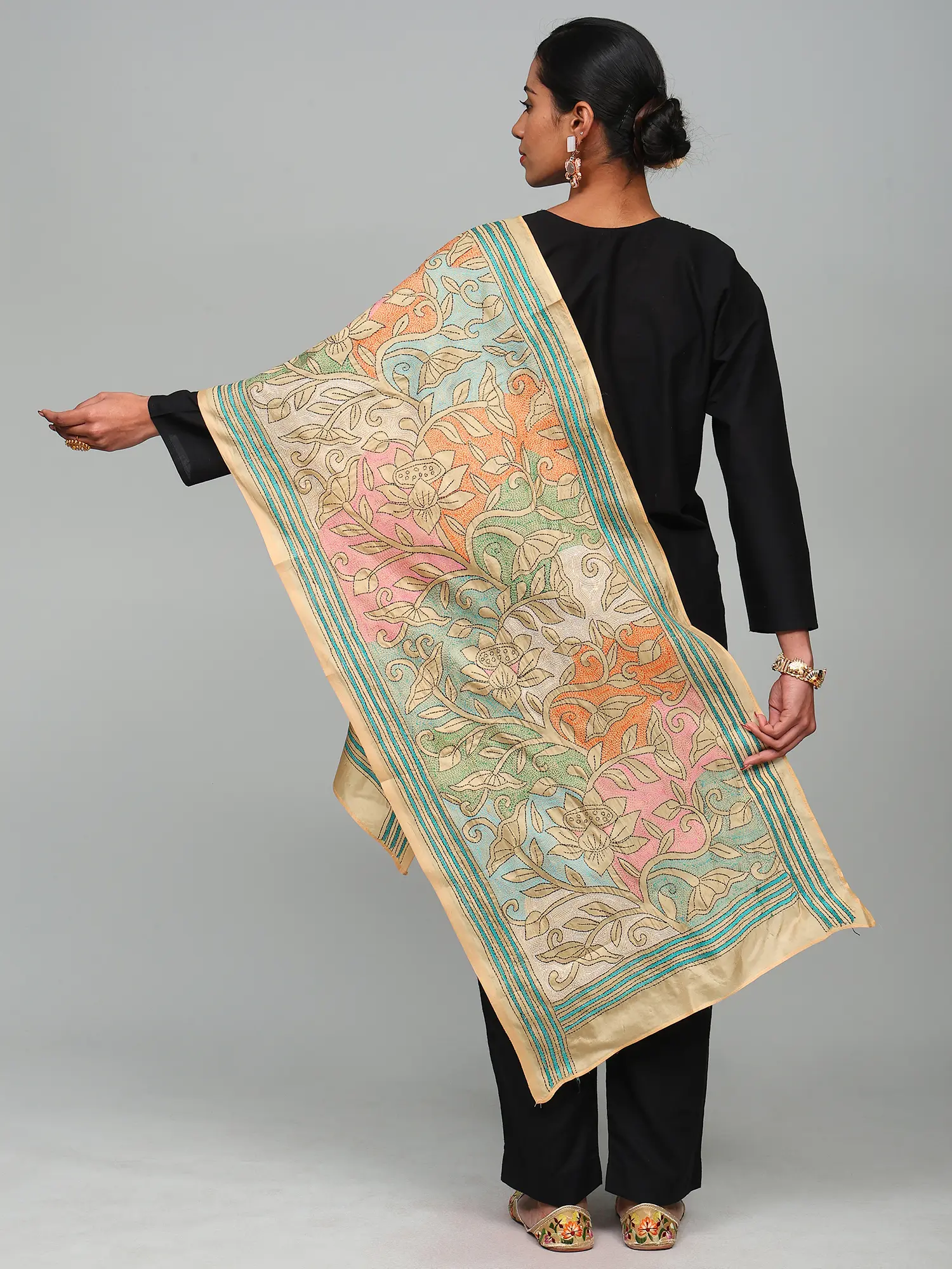 Beige Pure Silk Stole from Bengal with Kantha Embroidered Flowers