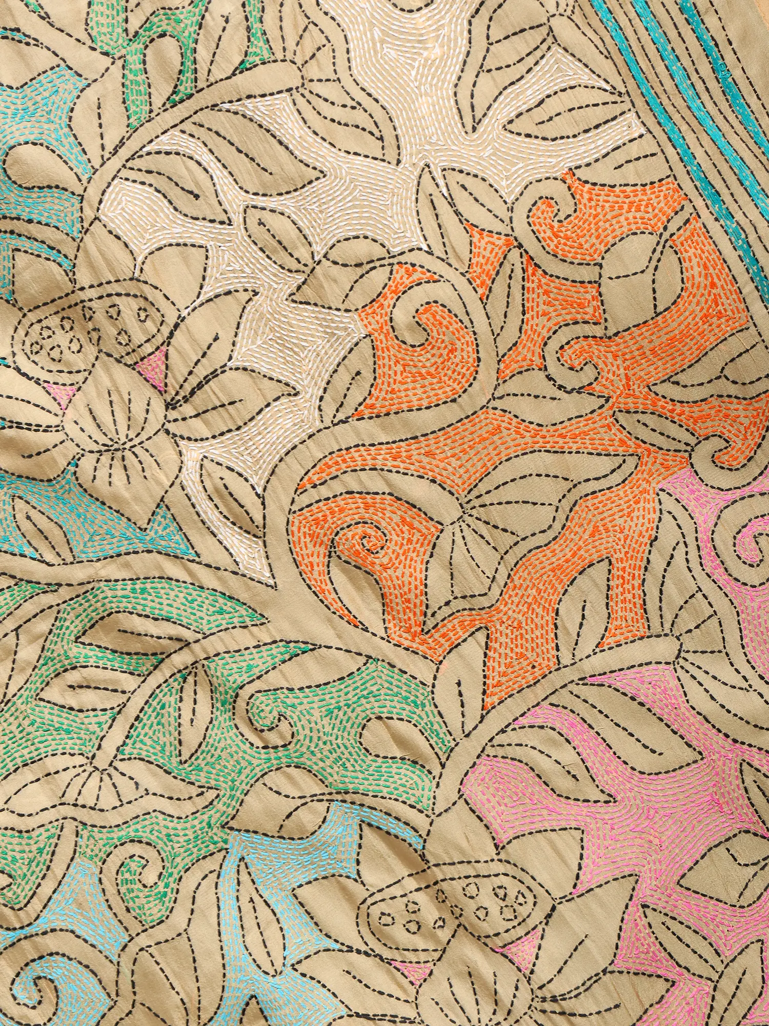 Almond-Buff Saree from Kolkata with Kantha Hand-Embroidered Paisleys and Giant Mandala