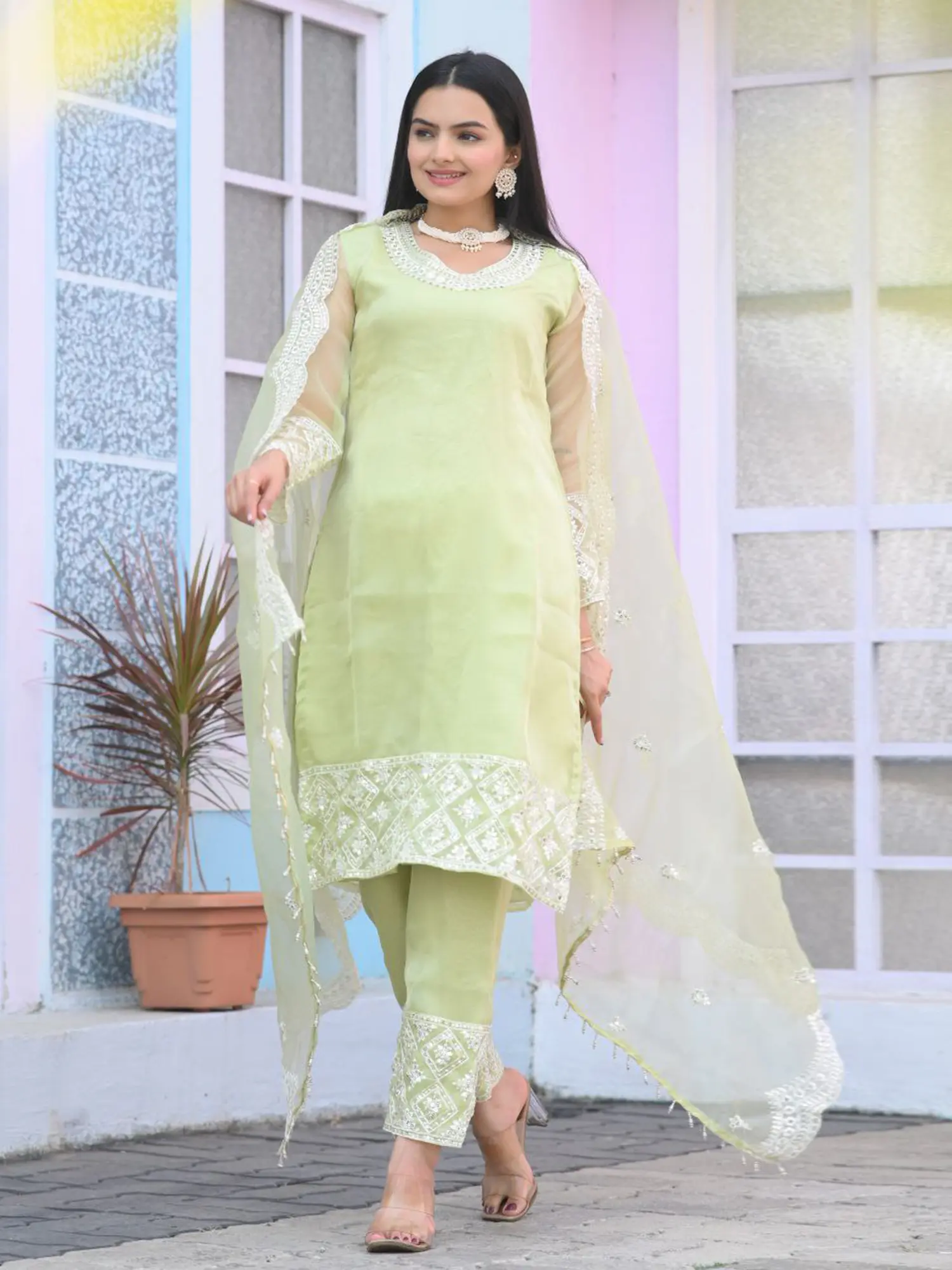 Completing this stunning set is a sheer organza duppata that adds an ethereal touch. The duppata mirrors the delicate embroidery found on the kurta and trousers, featuring a beautiful border and scattered motifs that enhance its overall charm. The lightweight nature of the organza allows the duppata to flow gracefully, adding a touch of drama and elegance as you move. The subtle shine of the organza combined with the intricate detailing makes this duppata a true statement piece.
