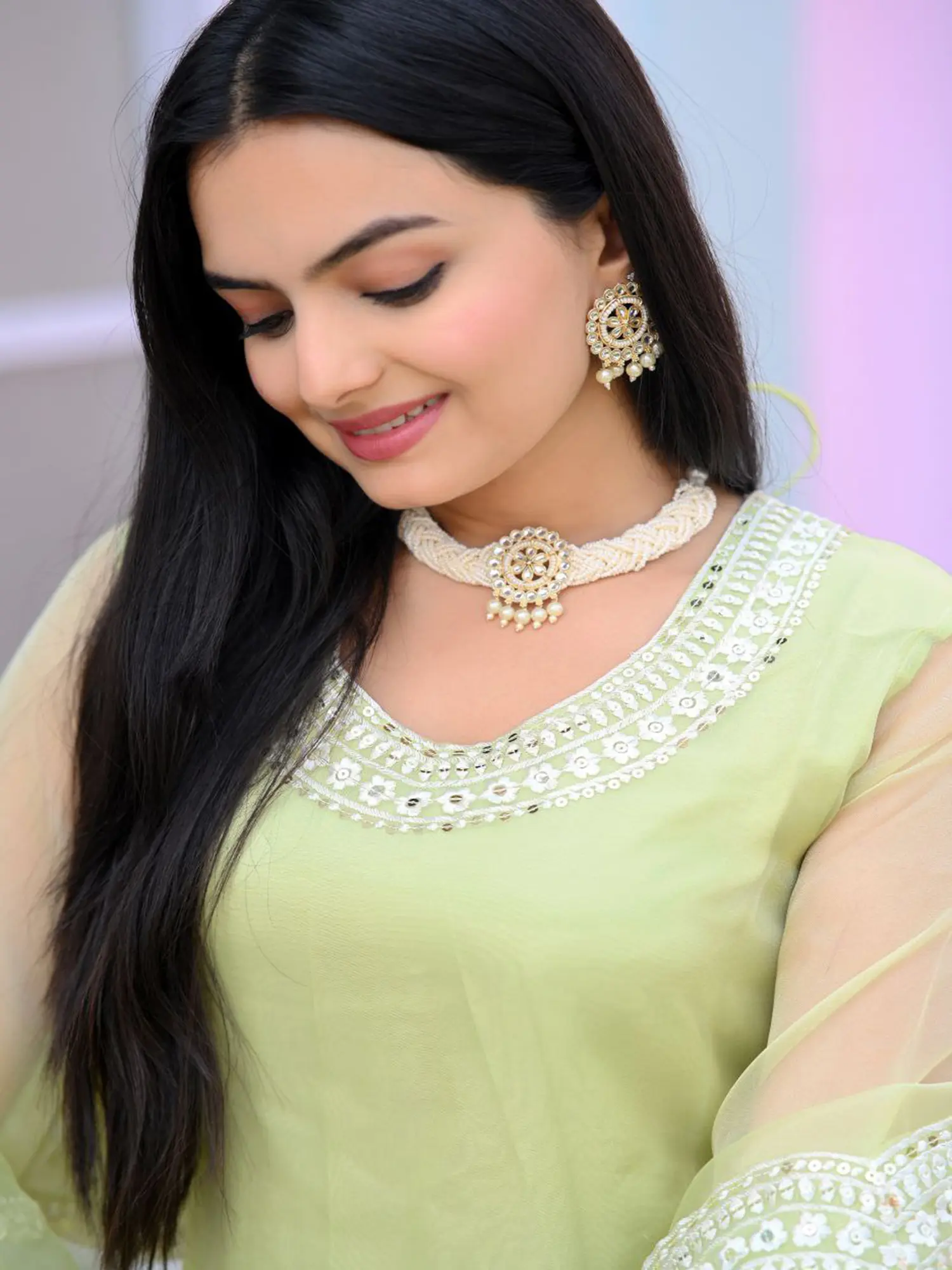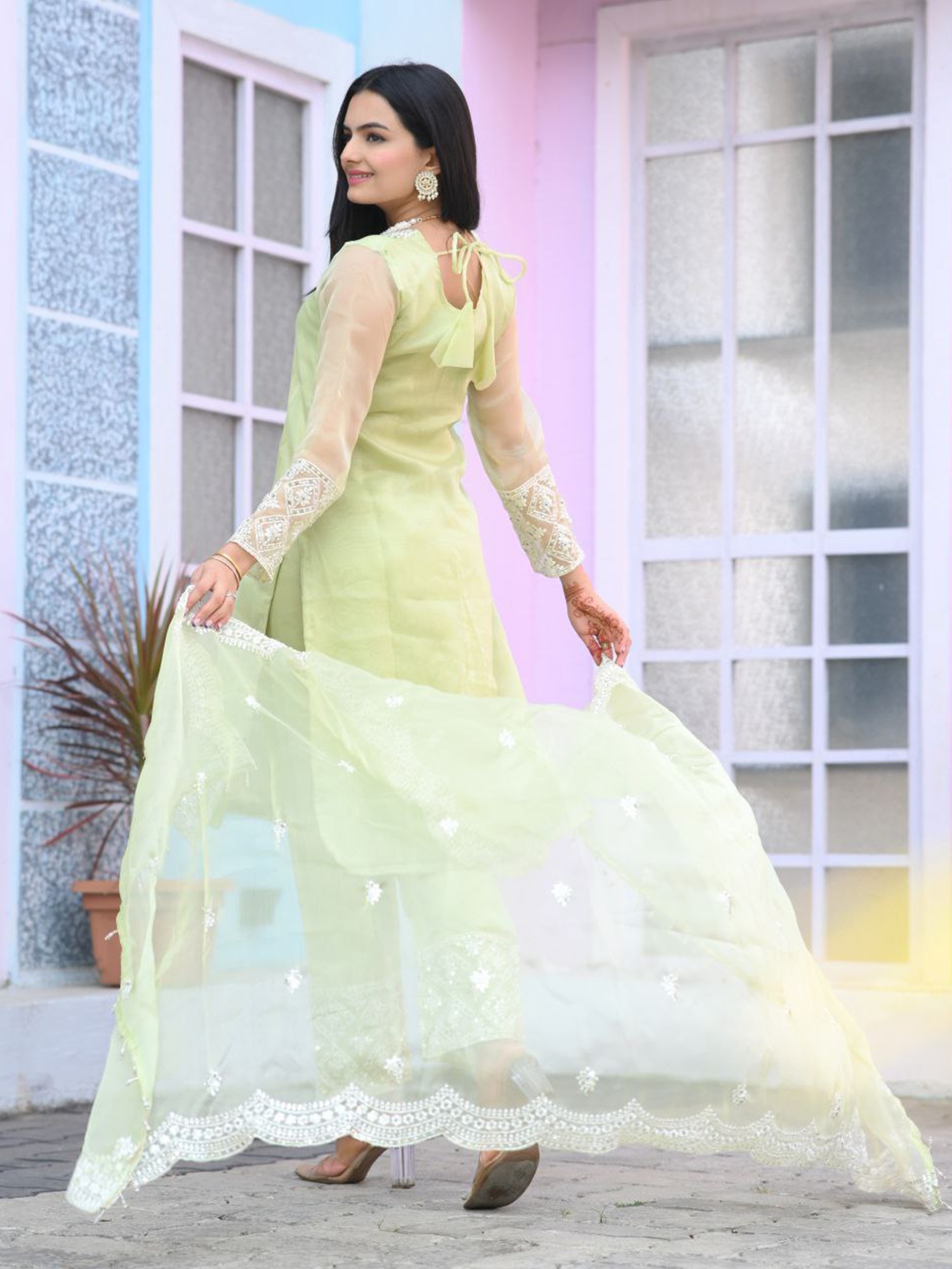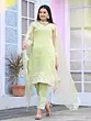 This designer kurta set is more than just an outfit; it's an experience in refined style. The combination of the refreshing beryl green organza and the detailed white embroidery creates a look that is both timeless and on-trend. It's the perfect choice for anyone looking to elevate their festive wardrobe with a piece that exudes grace, elegance, and impeccable craftsmanship. Pair it with statement jewelry and heels to complete a look that is sure to turn heads.