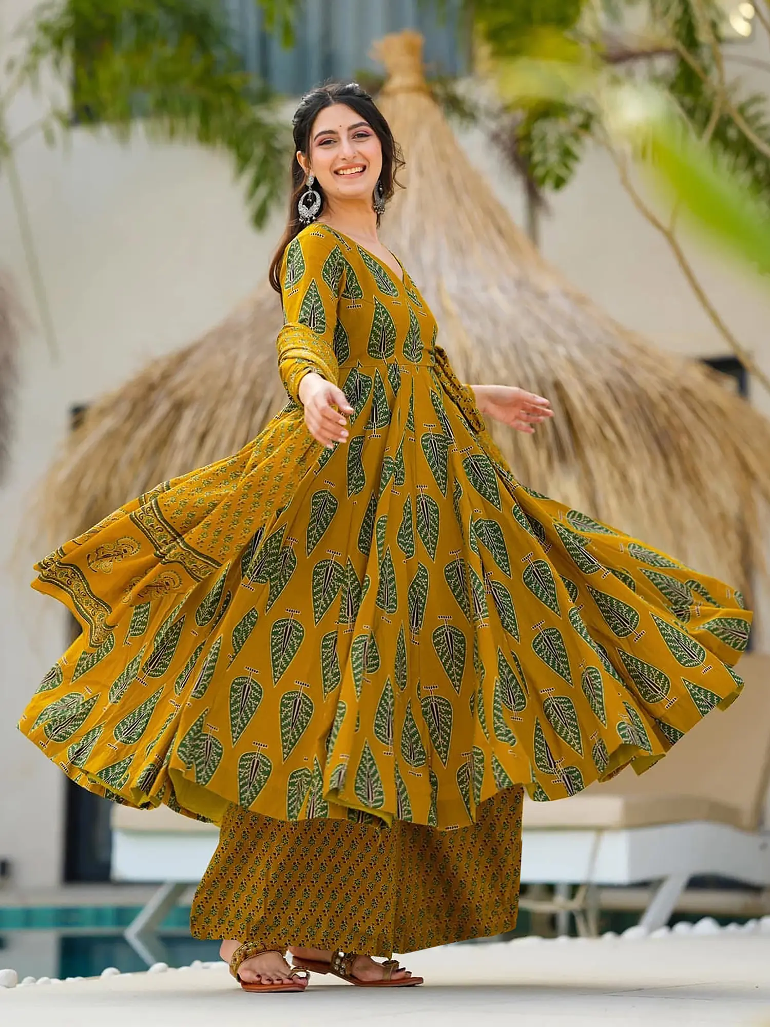 Step into a world of effortless elegance with this stunning Anarkali suit set. This ensemble is a harmonious blend of traditional design and contemporary style, perfect for adding a touch of bohemian flair to your wardrobe. The breathable pure muslin fabric ensures maximum comfort, making it ideal for warm weather occasions and festive celebrations. The vibrant mustard-yellow backdrop creates a warm, inviting canvas for the eye-catching floral leaf digital print. The green foliage pattern infuses a sense of nature and tranquility into the design, making it both visually striking and soothing to the eye. This unique print offers a modern twist on classic ethnic motifs, ensuring you stand out from the crowd.