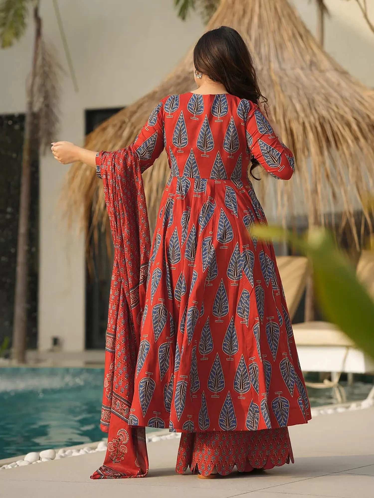 The Anarkali kurta features a flattering fully flared silhouette, creating a graceful and flowing effect with every movement. The generous flare not only adds to the overall aesthetic appeal but also enhances comfort and breathability. The long sleeves provide a touch of modesty and sophistication, making it suitable for various occasions. This ensemble includes a perfectly coordinated bottom and dupatta, both featuring complementary patterns. The carefully chosen designs create a cohesive and polished look, highlighting your impeccable sense of style. The lightweight dupatta can be draped in various ways, allowing you to personalize your look and express your individuality. Currently available in size 34 (XS).