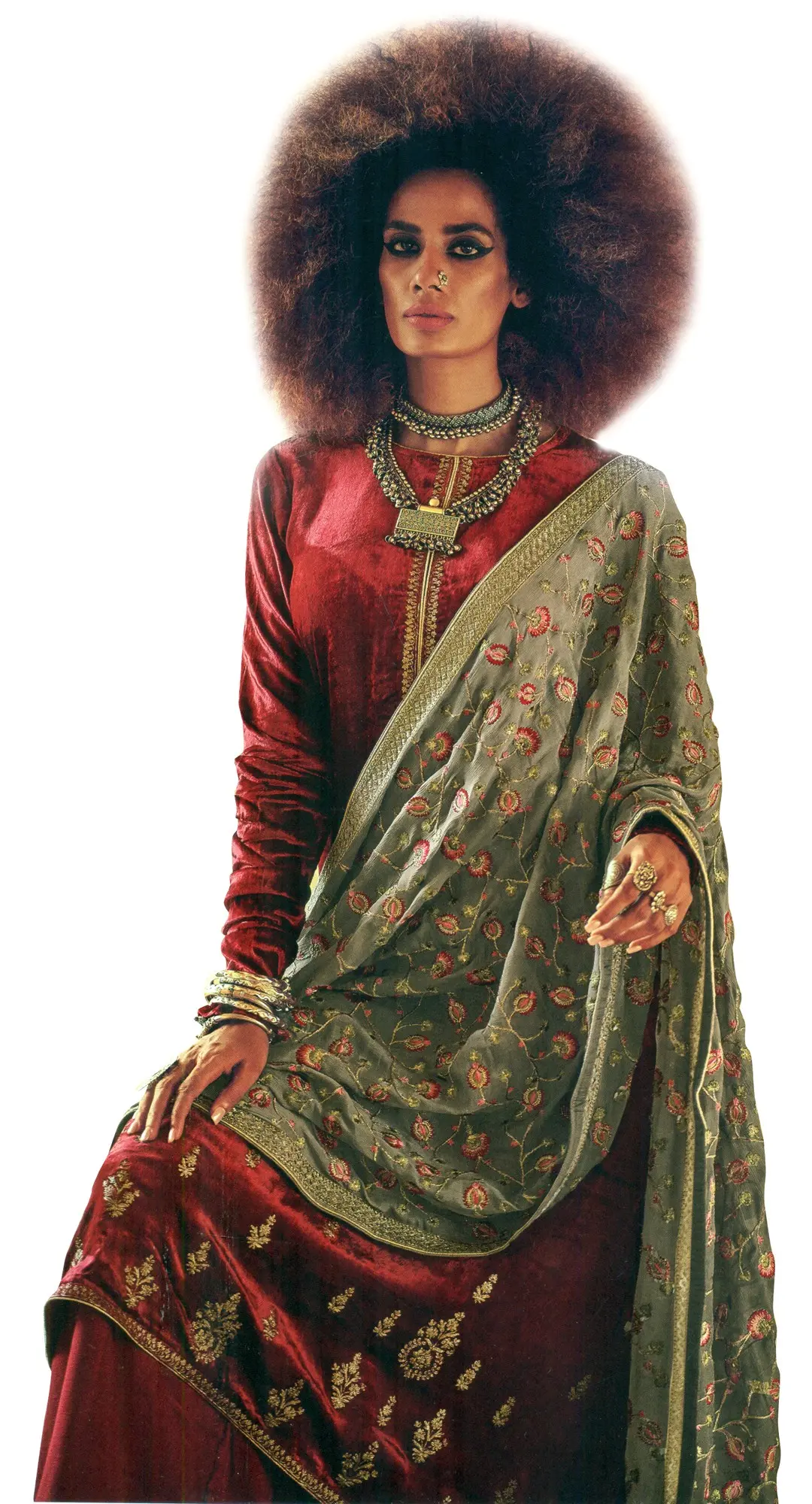 A deep and pleasing shade of red on the luxurious art silk fabric, this salwar kameez is for the queen in you, waiting for the perfect royal statement. The kurta and palazzo style pants are tailored to fit and flow beautifully, with floral embroidery to add on a lovely charm. The dupatta, a contrasting green is enriched with bustling vine embroidered all over, amplifying the regalia of this traditional Indian wear.