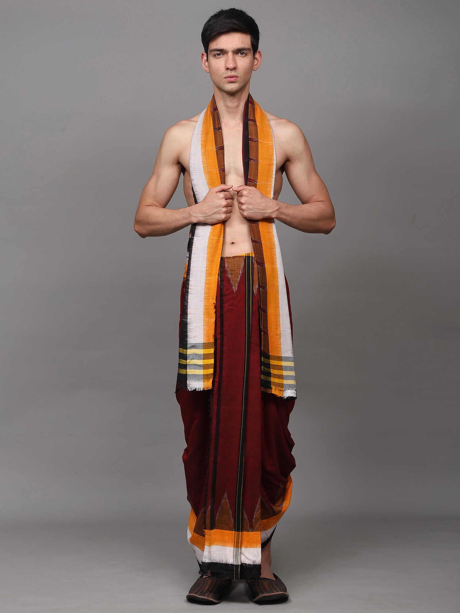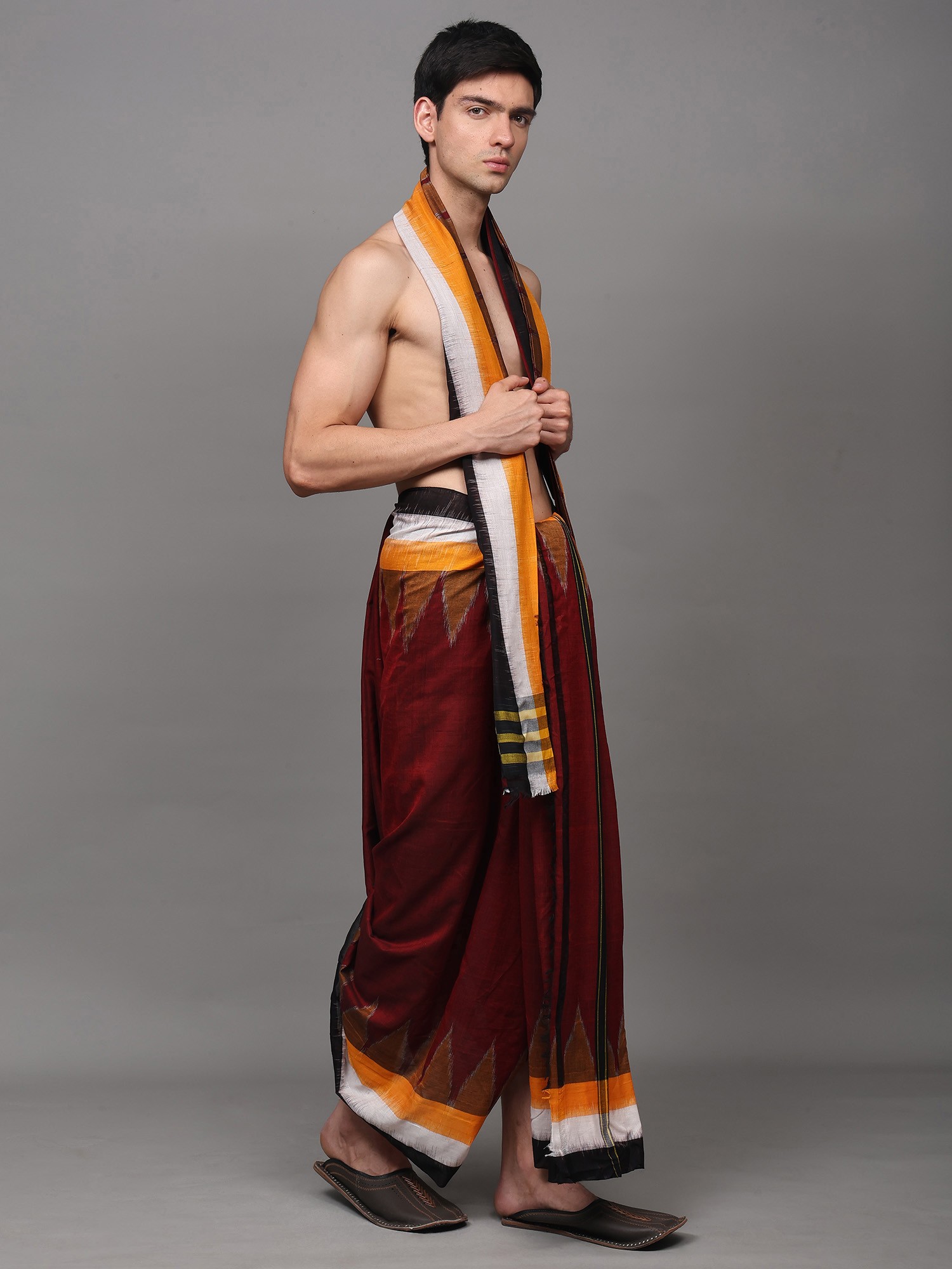 Experience the enduring appeal of Indian heritage with this meticulously crafted dhoti and angavastram set. This traditional ensemble, a symbol of grace and cultural pride, is perfect for festive occasions, religious ceremonies, or simply embracing a classic look. The rich color and intricate detailing make this set a true statement of refined style.