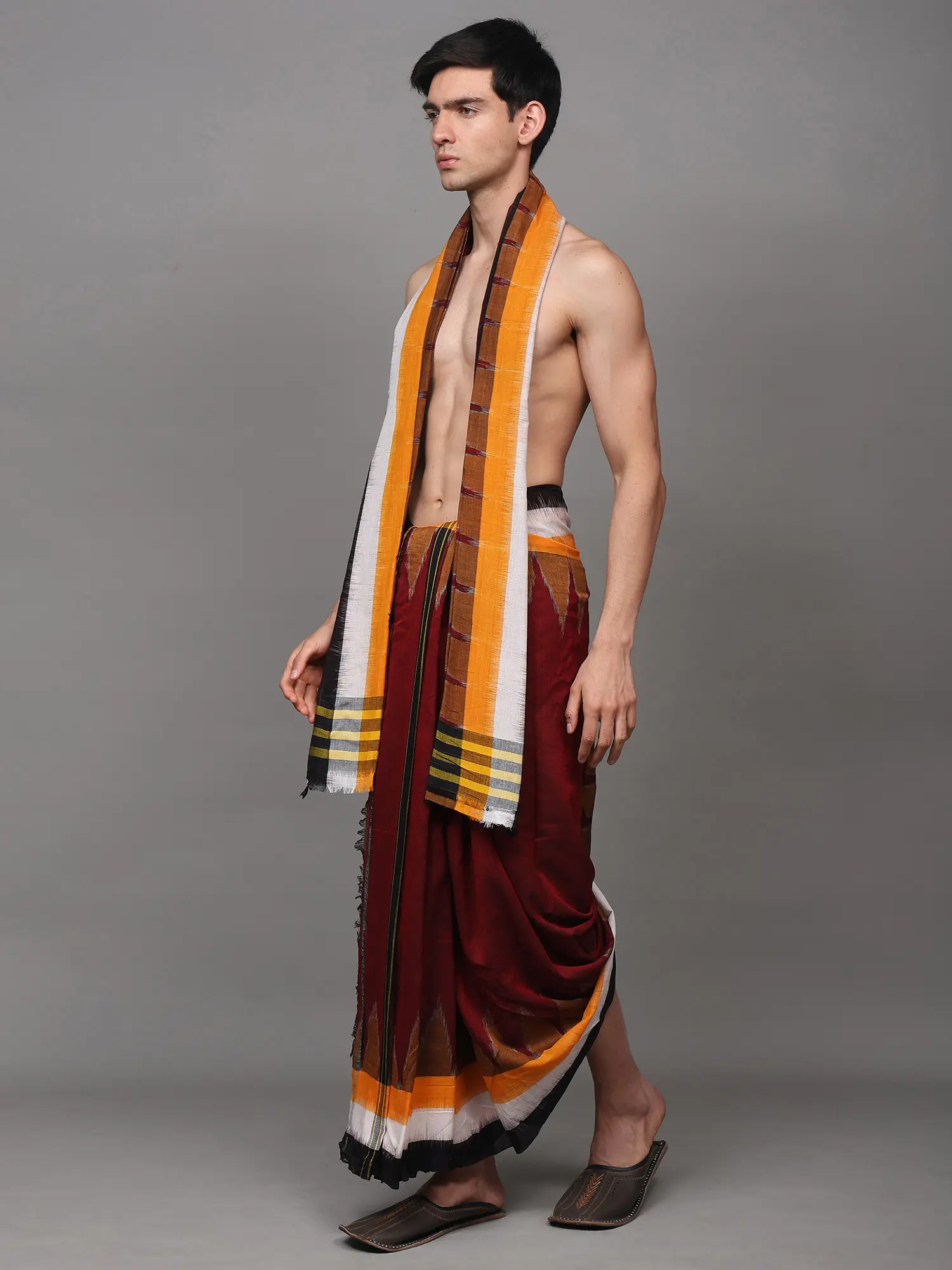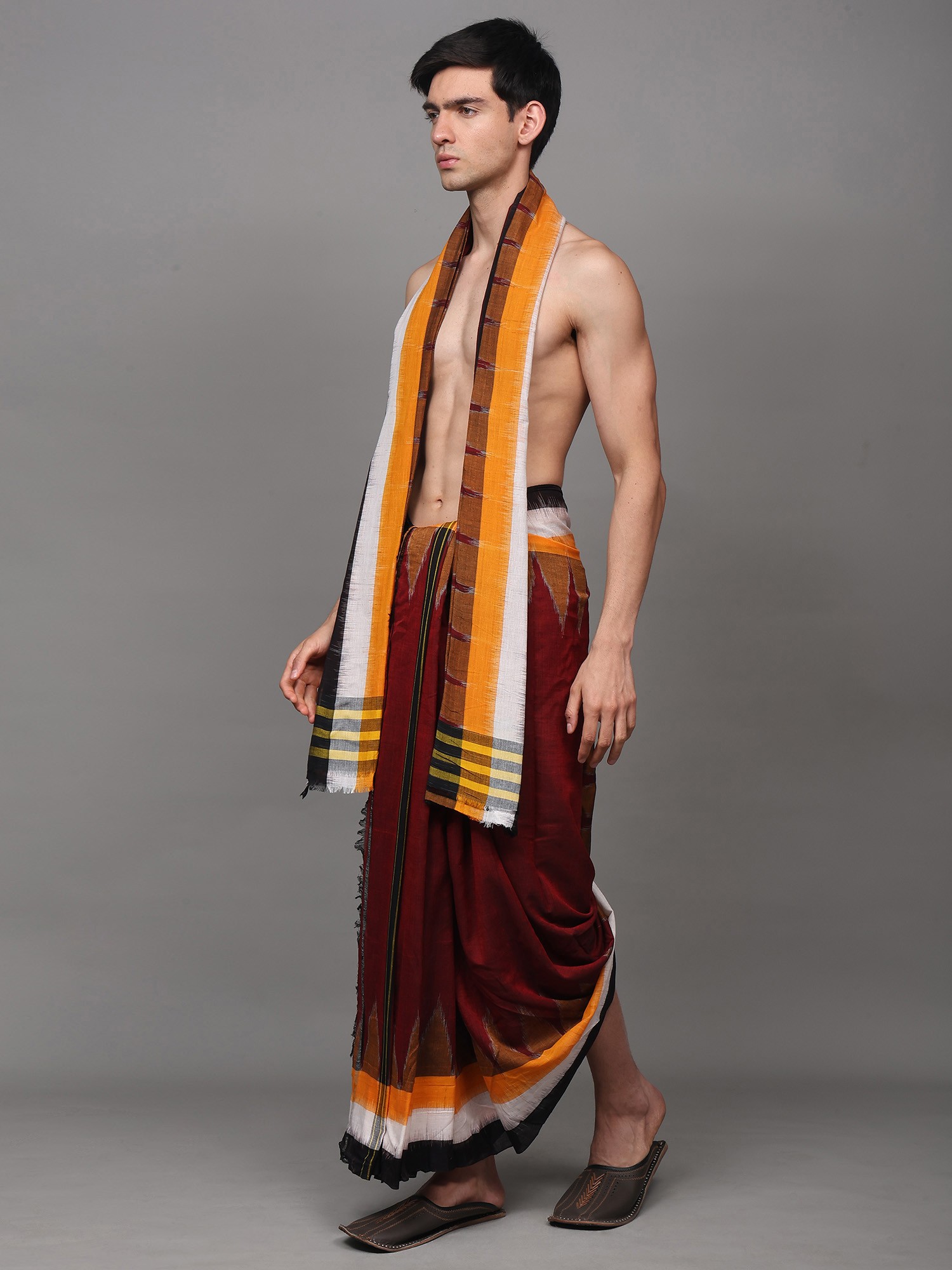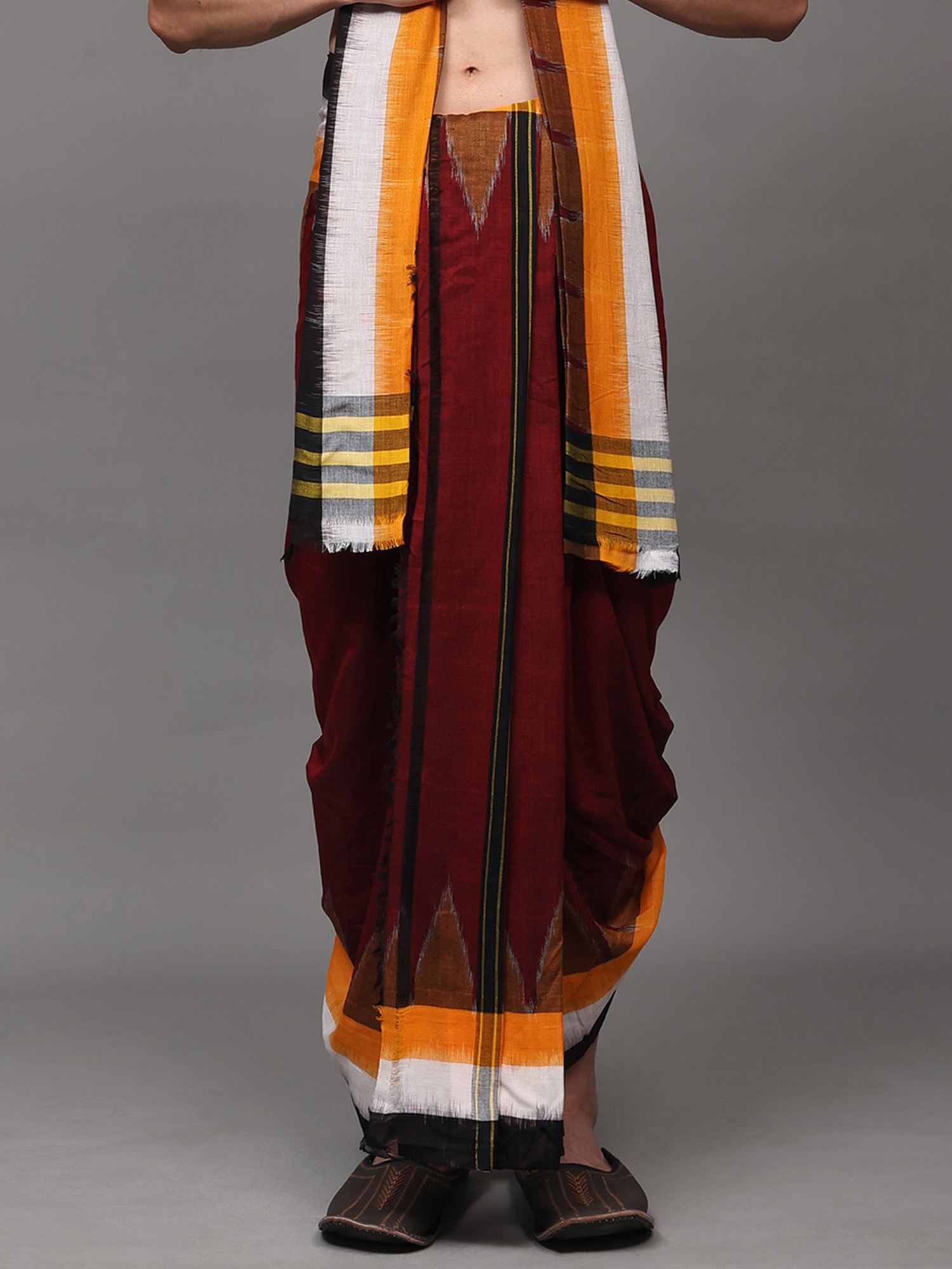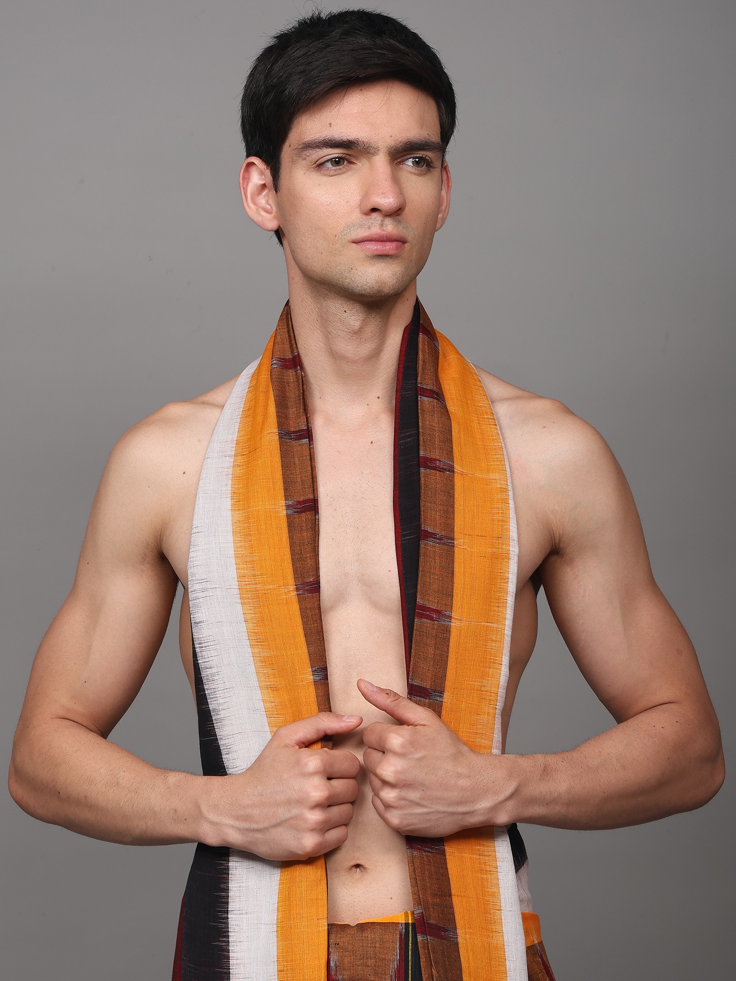Spectra-Yellow Drape Dhoti with Angavastram Set with Ikat Woven Temple Border from Sambalpur