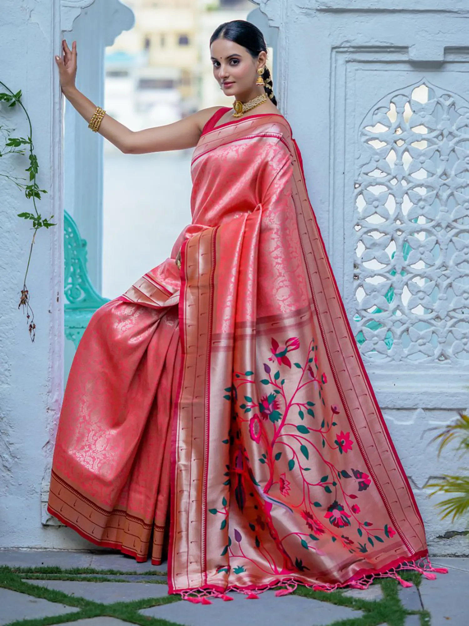 Immerse yourself in the exquisite artistry of this Kanjivaram silk saree, a testament to timeless tradition and unparalleled craftsmanship. Woven from the finest pure silk, this saree boasts a luxurious sheen and a soft, flowing drape that promises to accentuate your grace and elegance. The rich, warm coral hue serves as a captivating canvas for the intricate patterns that adorn its expanse, making it a statement piece for any discerning wardrobe.