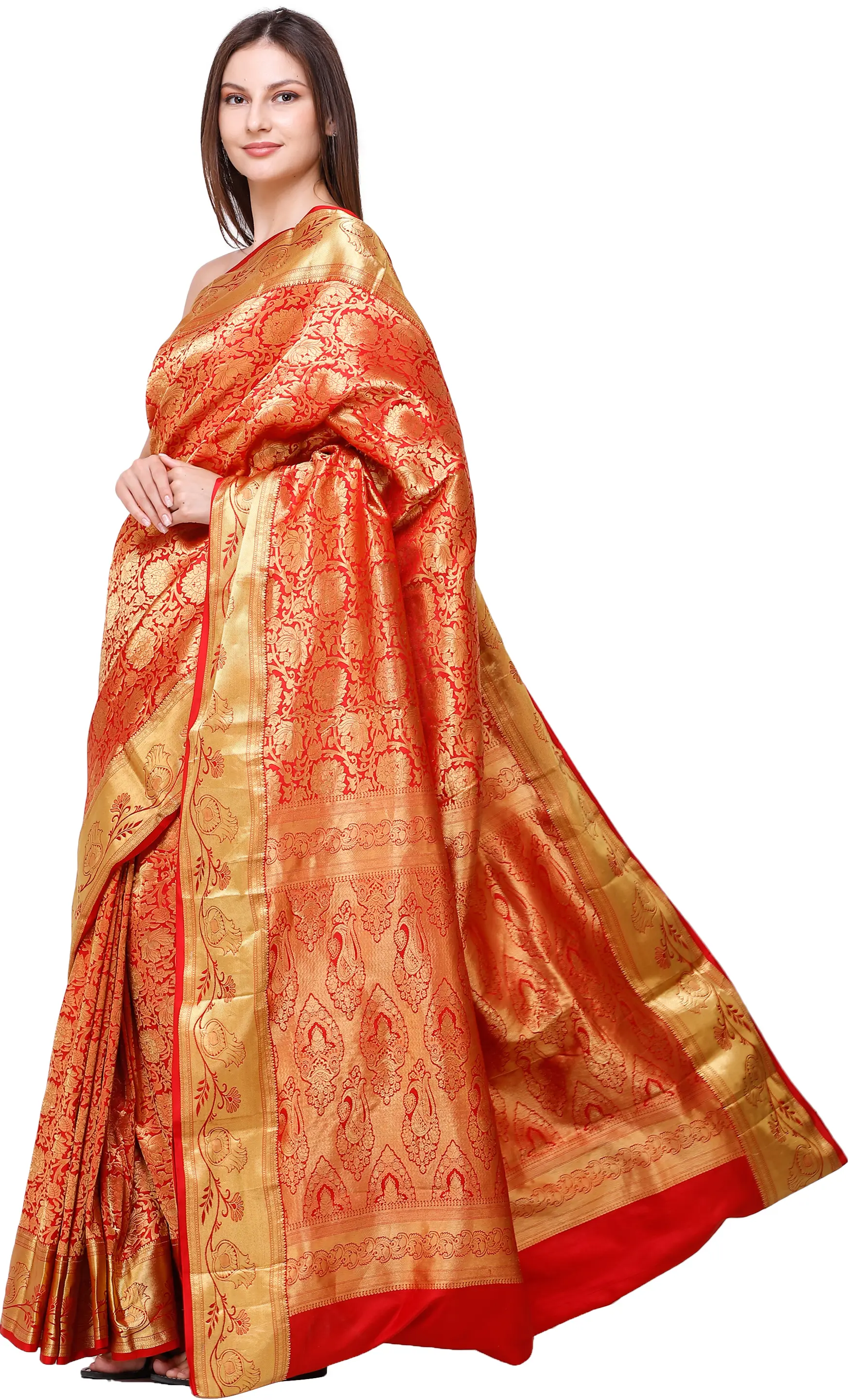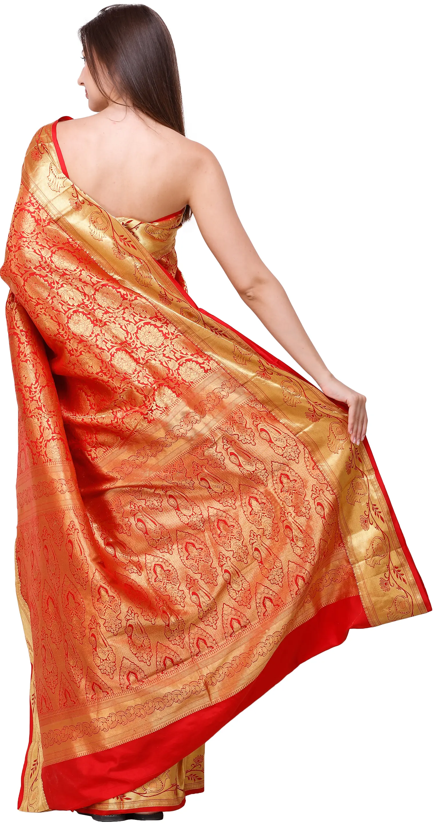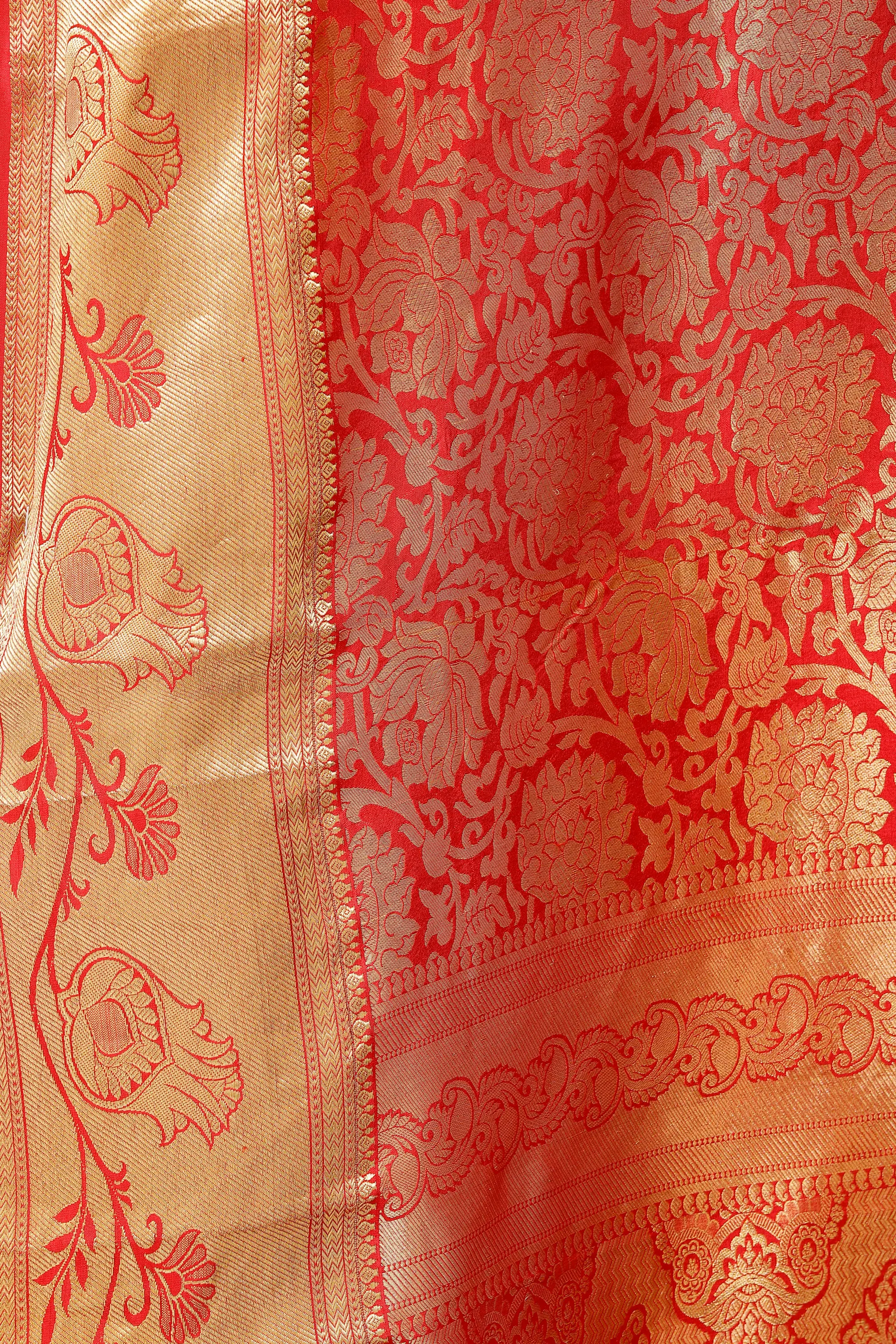 The foundation colour is a youthful, almost fiery red, which is the signature bridal colour prevalent in these parts. The same has been densely superimposed with zari weave, done with lustrous gold thread.