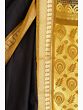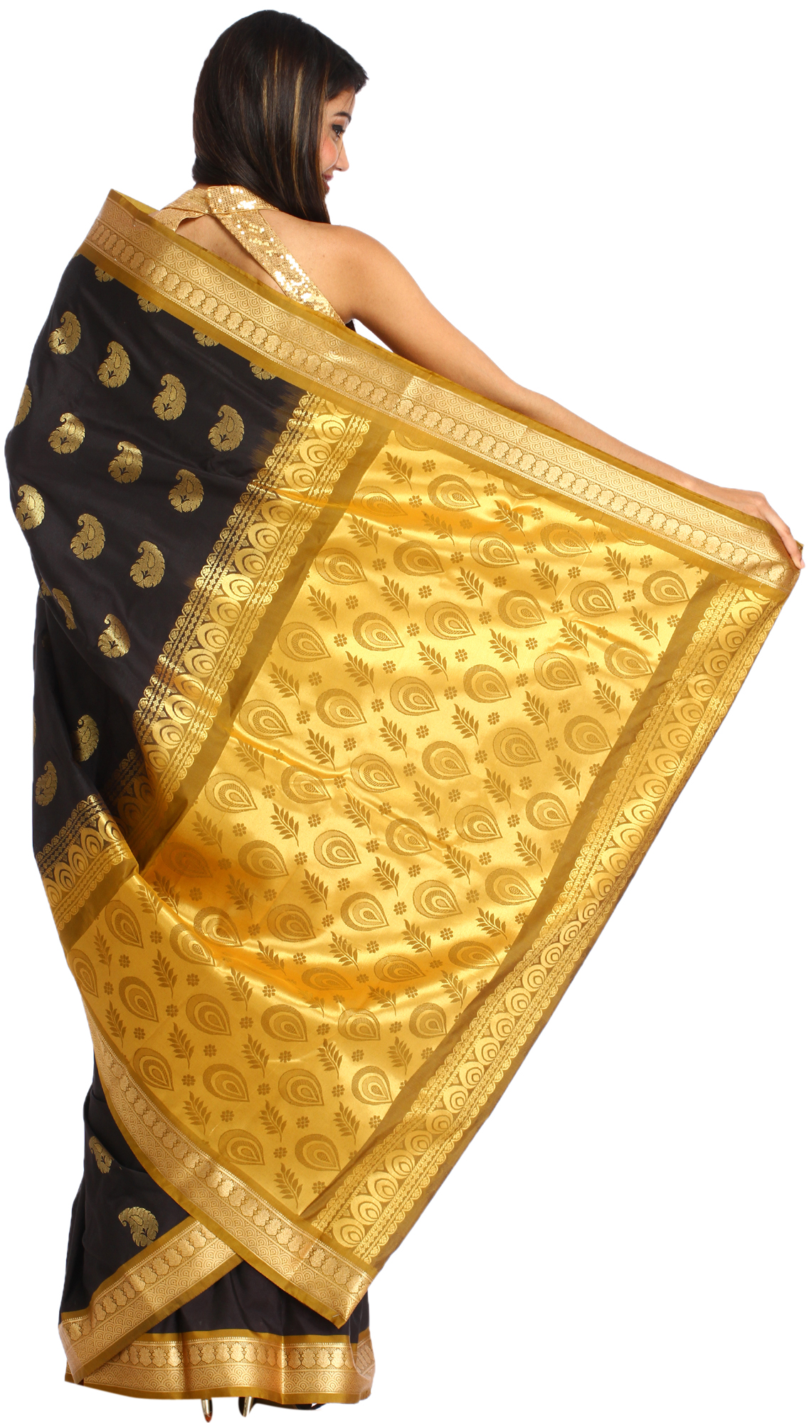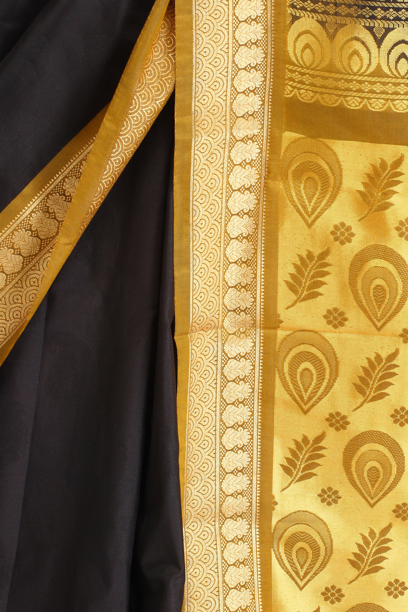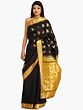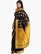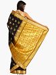 The pièce de résistance of this sari is its stunning brocaded aanchal, or pallu. This broad panel features a more elaborate design, dominated by larger, stylized motifs that are characteristic of traditional Indian textiles. The interplay of gold zari on the deep black base creates a striking contrast, making this section of the sari particularly eye-catching. The detailed brocade work here is designed to make a statement, drawing admiration with its sheer artistry and richness.