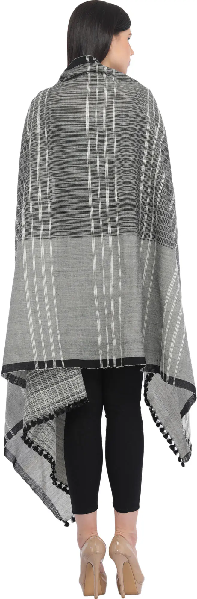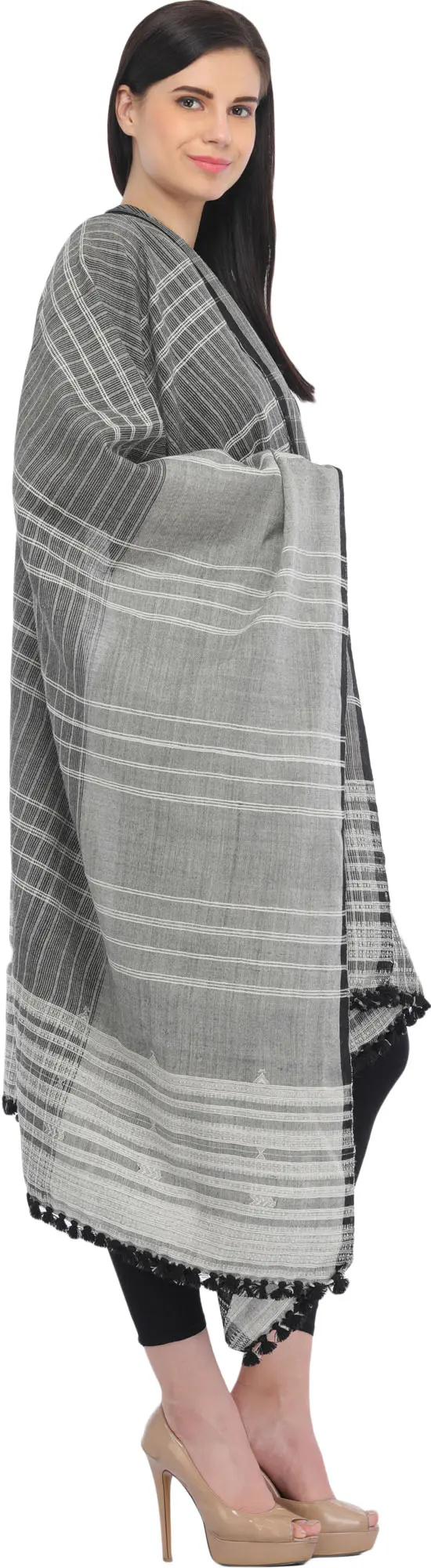 Discover the artistry and comfort of this exquisite Kutch shawl, a testament to traditional Indian weaving techniques. Crafted from pure wool, this piece offers a luxurious feel and exceptional warmth, making it a perfect accessory for any season. Its sophisticated design features a captivating interplay of black and gray, enhanced by a striking pattern of woven stripes. These stripes, varying in thickness and density, create a dynamic visual appeal that is both modern and classic. The shawl is generously sized, allowing for versatile styling. Drape it elegantly over your shoulders for a formal evening event, wrap it around yourself for cozy comfort on a chilly afternoon, or simply let it cascade as a chic statement piece. The fine wool ensures a soft touch against the skin, providing unparalleled comfort and a gentle warmth without being overly heavy. This makes it an ideal companion for transitional weather or for adding an extra layer of style to your everyday outfits.