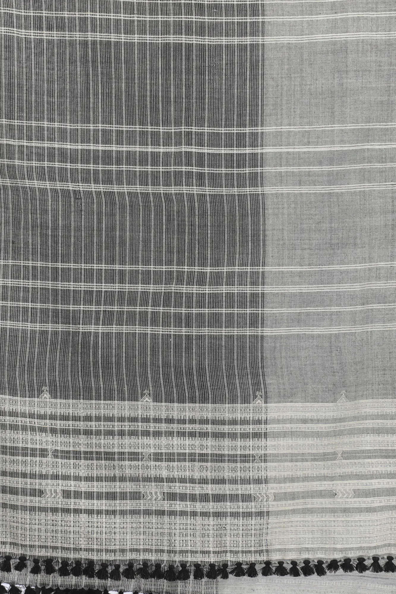 The true beauty of this Kutch shawl lies in its intricate woven stripes. The contrasting black and white threads are expertly woven to form a rhythmic pattern that runs across the entire fabric. Subtle variations in the weave add depth and dimension, giving the shawl a rich texture that begs to be touched. The edges are finished with delicate, coordinated tassels, adding a playful yet refined detail that completes the overall aesthetic. This attention to detail highlights the artisanal craftsmanship involved in its creation, making each shawl a unique work of art.