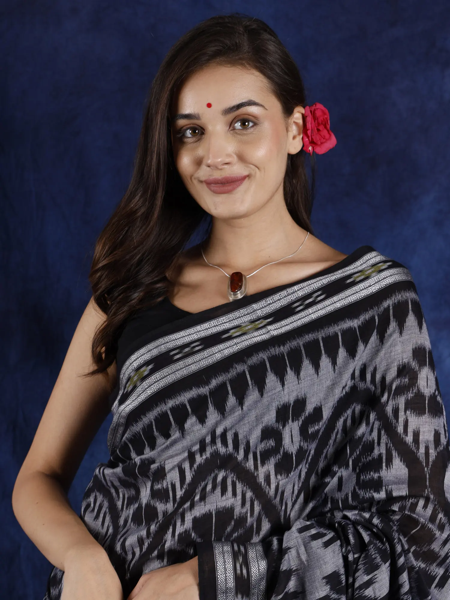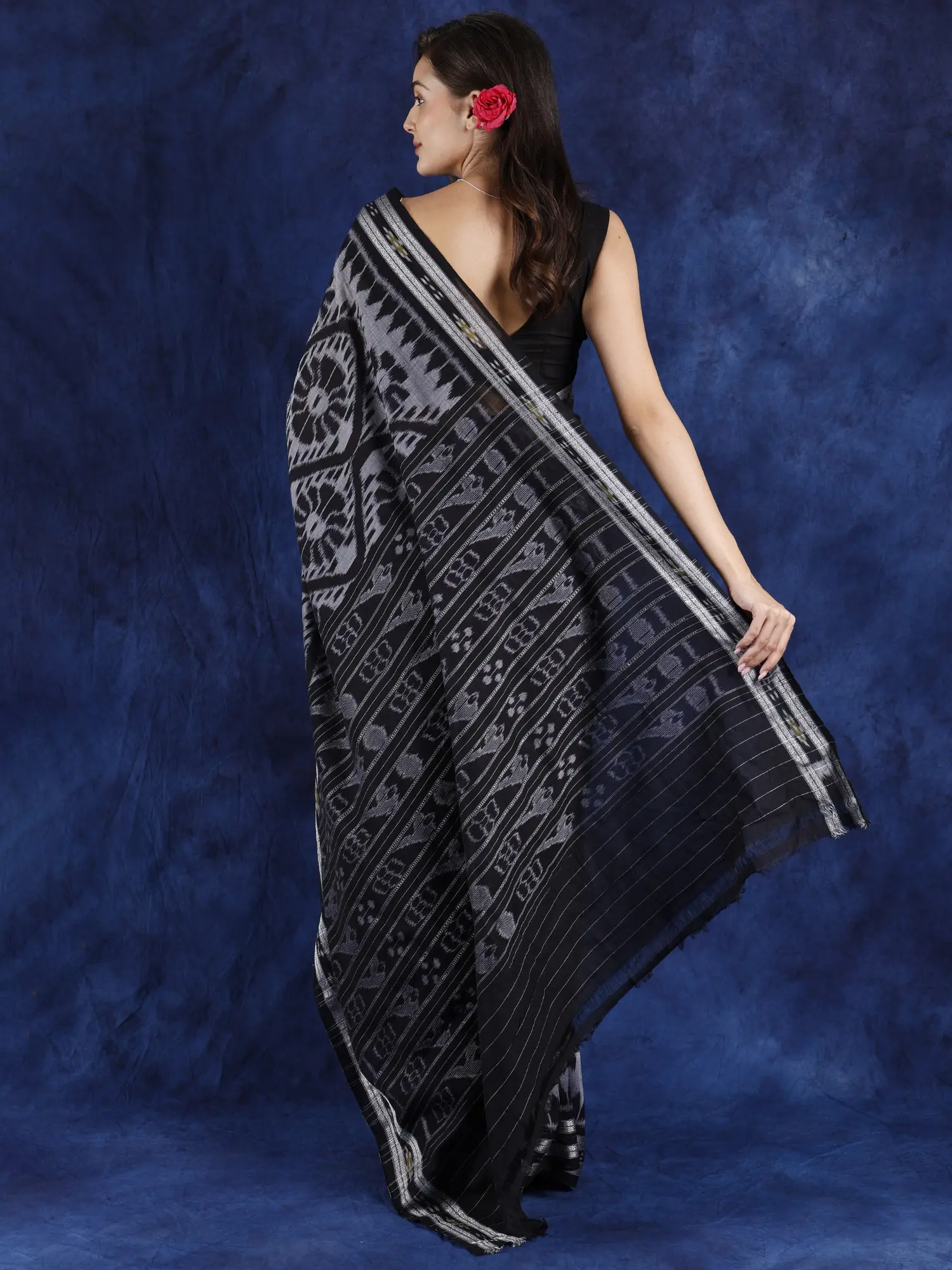 Bring ethnic Indian appeal to your formal fashion with this black and grey Sambalpuri Ikat saree.