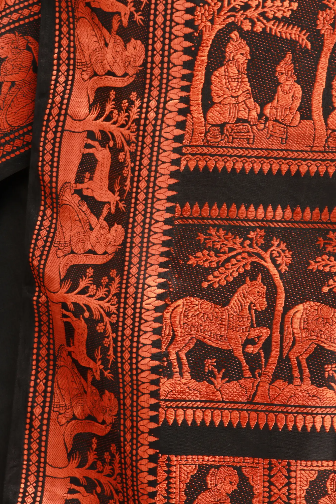 Black-Beauty Baluchari Handloom Sari from Bengal with Hand-woven Courtly Apsaras and Ramayana Episodes on Pallu