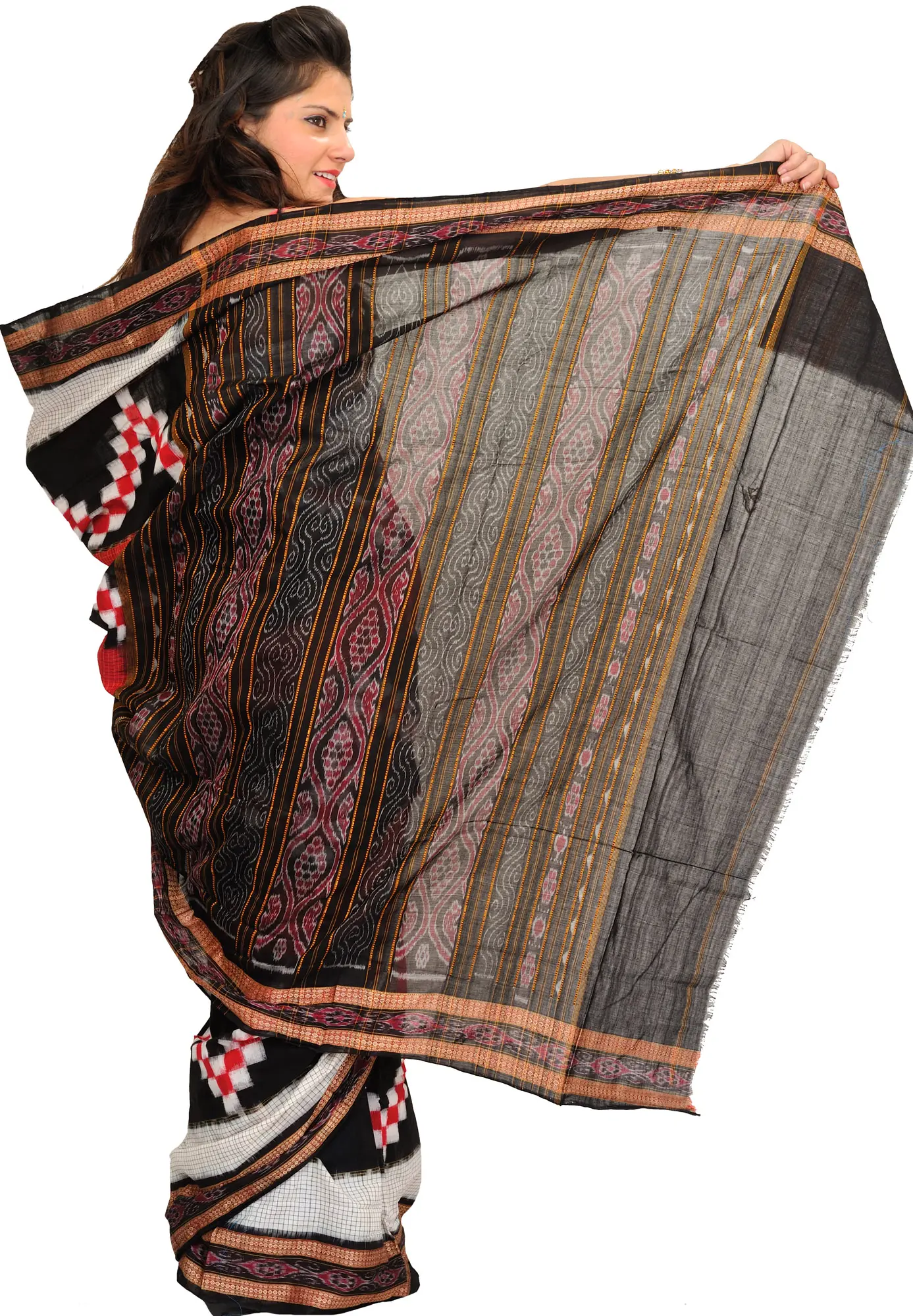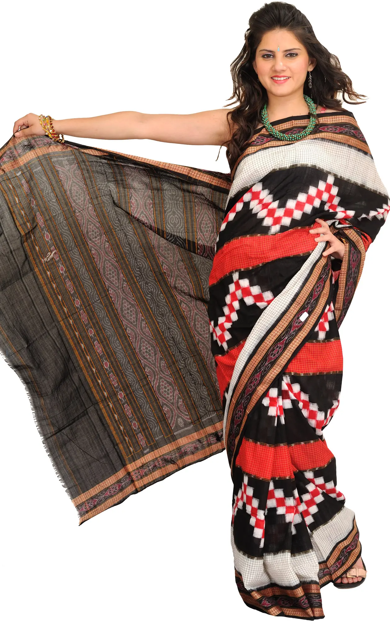Black and Red Ikat Handloom Sari from Pochampally with Woven Checks and Rudraksha Border