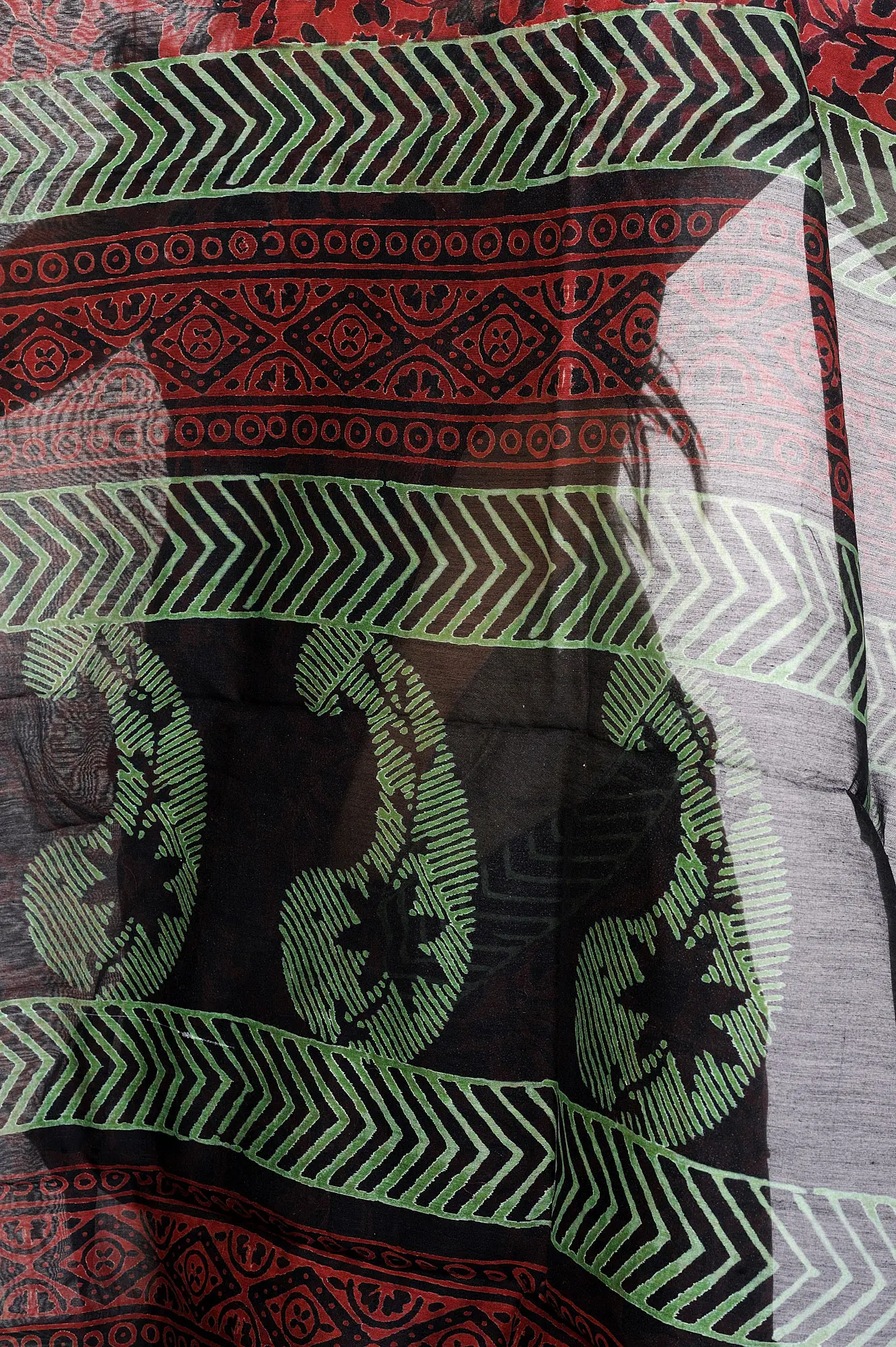 The striking visual appeal of this saree lies in its captivating black and red printed design. The intricate motifs, rendered in a bold black against a deep red base, create a visually arresting pattern that is both classic and contemporary. The design is meticulously applied, showcasing the skill of the block printers who have passed down this craft through generations. Complementing the main body of the saree is a sophisticated border, featuring a series of geometric patterns in shades of green and black, bordered by a subtle golden hue. This contrasting yet harmonious border adds depth and dimension to the overall aesthetic, drawing the eye and enhancing the saree's charm. The pallu, a flowing expanse of the same intricate print, drapes beautifully, creating a graceful and dynamic silhouette.