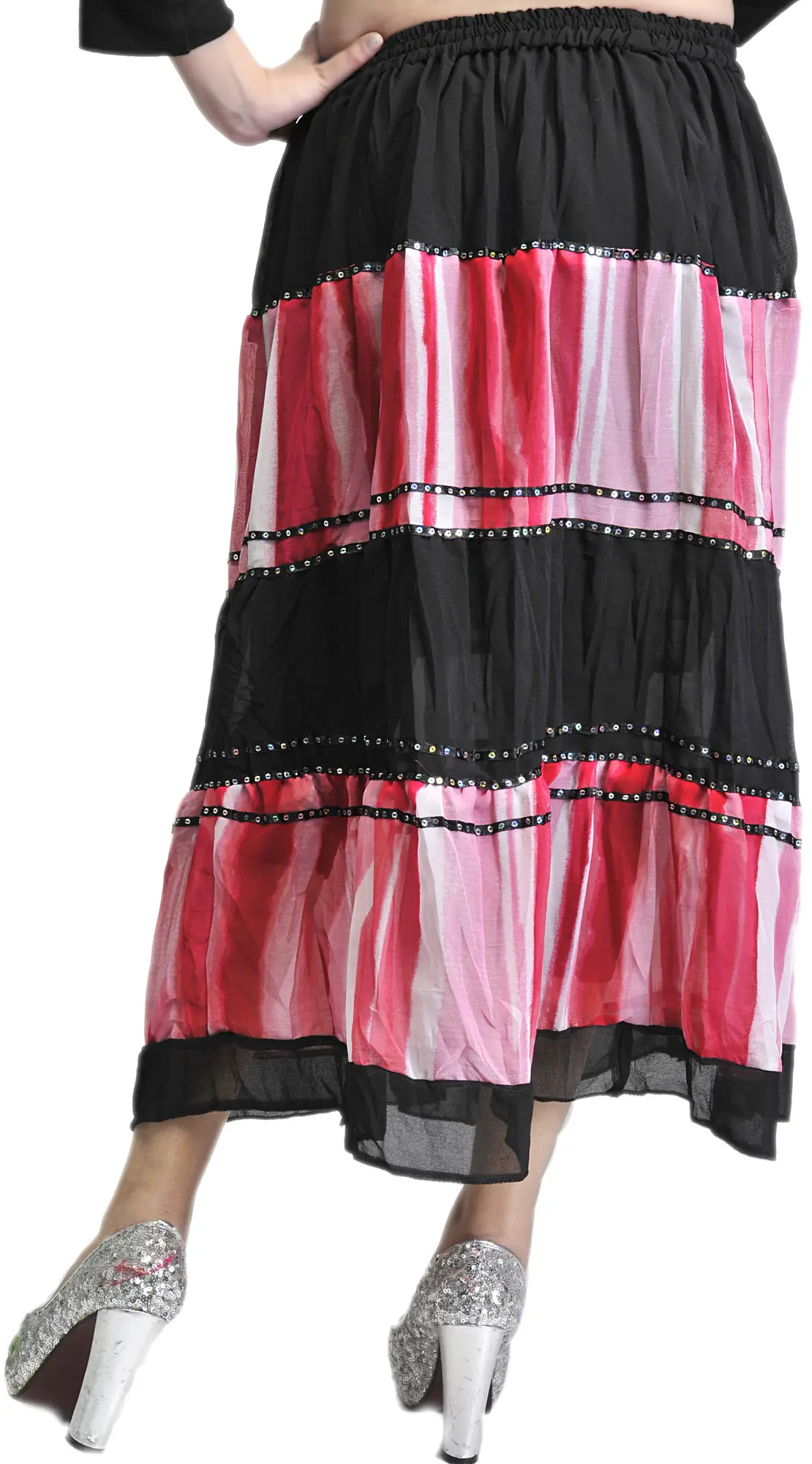 This black and red shaded midi-skirt is a work of chic sophistication that will envelop you in enchantment. Made from rich chiffon, its beautiful drape emphasises every movement, while the elaborately embroidered sequins provide a touch of grandeur. This skirt is more than simply a piece of apparel; it makes a statement. It represents courage, passion, and bold style.