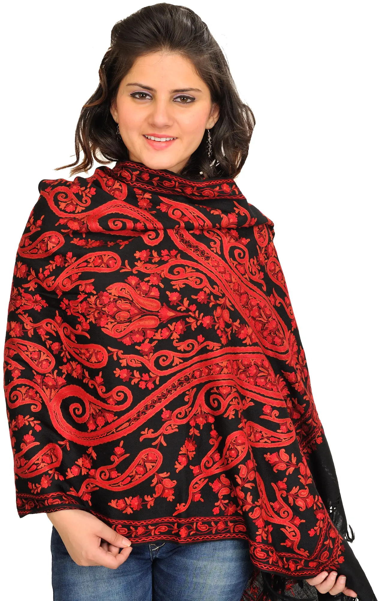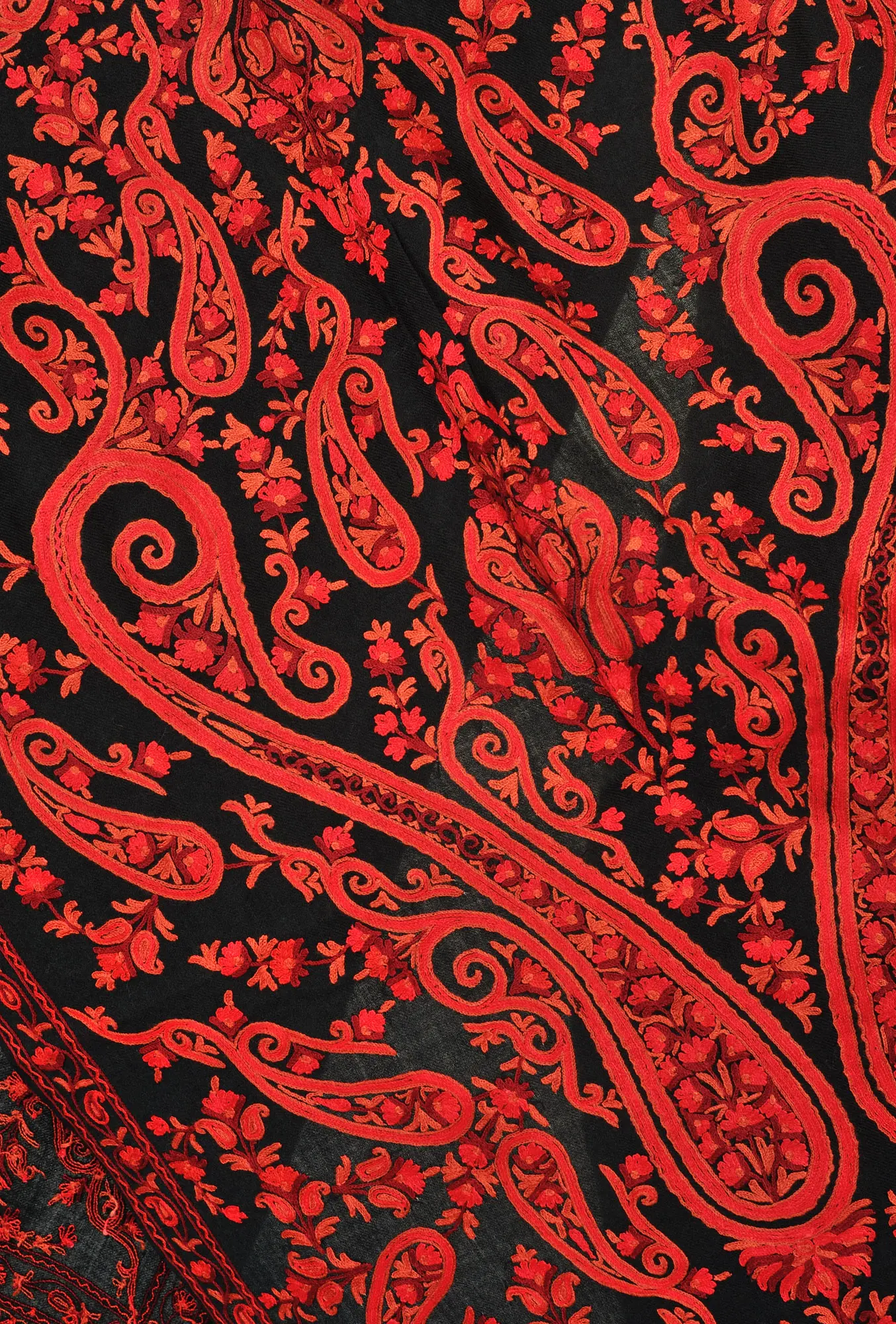 This stole is more than just a garment; it's a statement piece designed to elevate any ensemble. Drape it over your shoulders for a touch of bohemian chic with jeans and a simple top, or add a layer of sophisticated warmth to an evening dress. Its generous size ensures it can be styled in multiple ways, from a classic wrap to a fashionable scarf. The striking contrast of black and red imbues it with a timeless appeal, making it a versatile addition to your wardrobe that transcends fleeting trends. Whether you're attending a formal event, enjoying a casual outing, or simply seeking to add a touch of elegance to your everyday wear, this stole is sure to make a memorable impression. Experience the artistry and warmth of authentic Kashmiri hand embroidery with this stunning woolen stole.