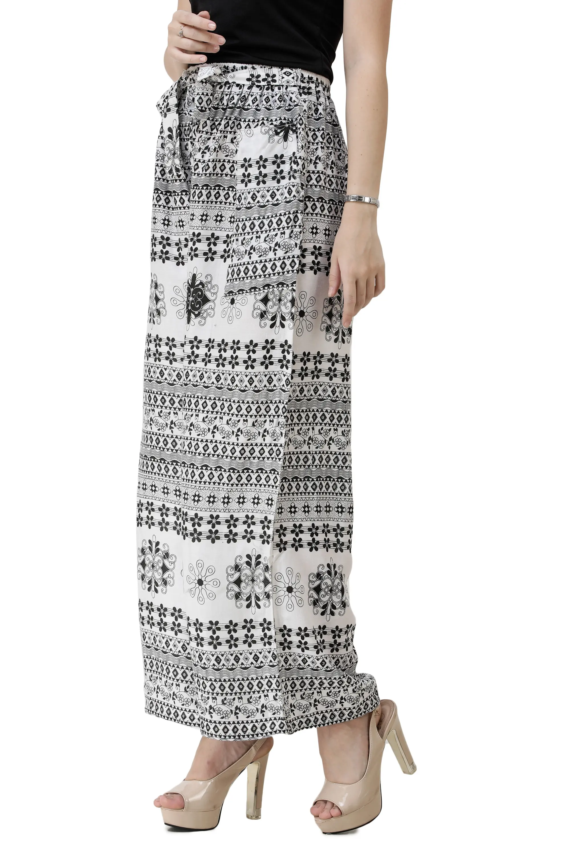 Discover a blend of comfort and chic with these striking palazzo trousers. Crafted from breathable cotton, these trousers are designed to be your go-to for both relaxed days and dressed-up evenings. The classic black and white palette provides a timeless appeal, allowing for endless styling possibilities. The captivating all-over print features delicate floral motifs intertwined with geometric patterns, creating a look that is both bohemian and sophisticated. This intricate design adds a unique visual interest, making these trousers a standout piece in any wardrobe.
