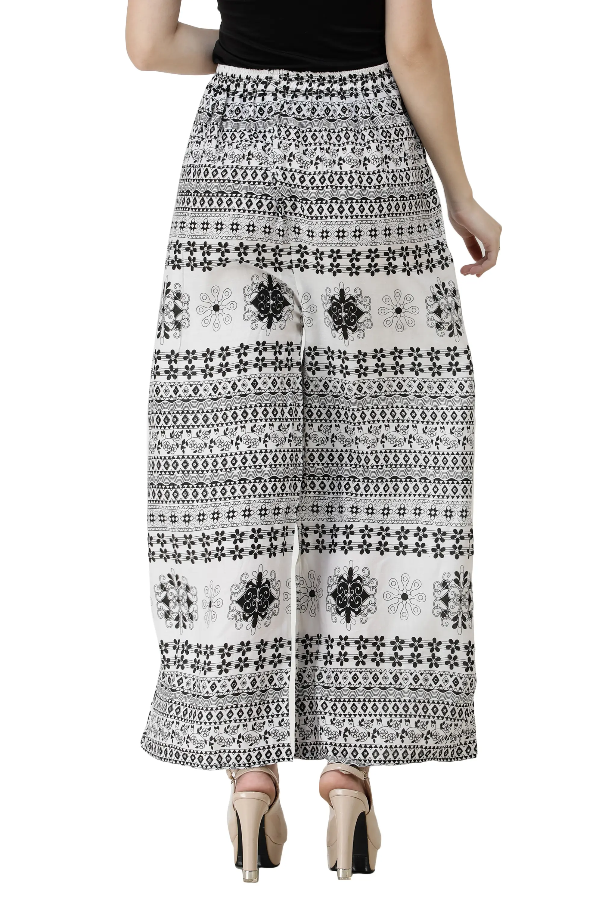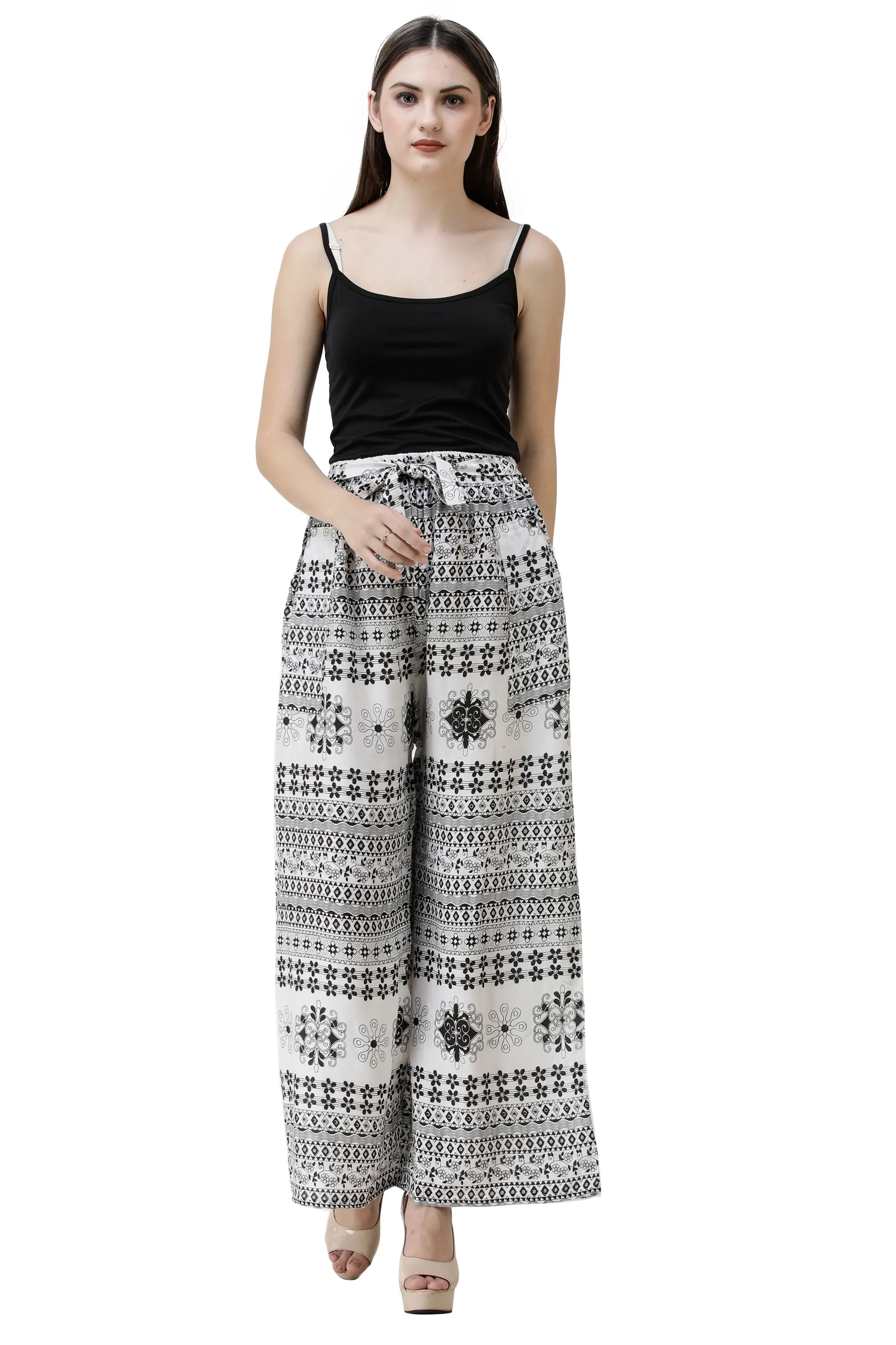 Black and White Palazzo Trousers with Printed Flowers and Side Pockets