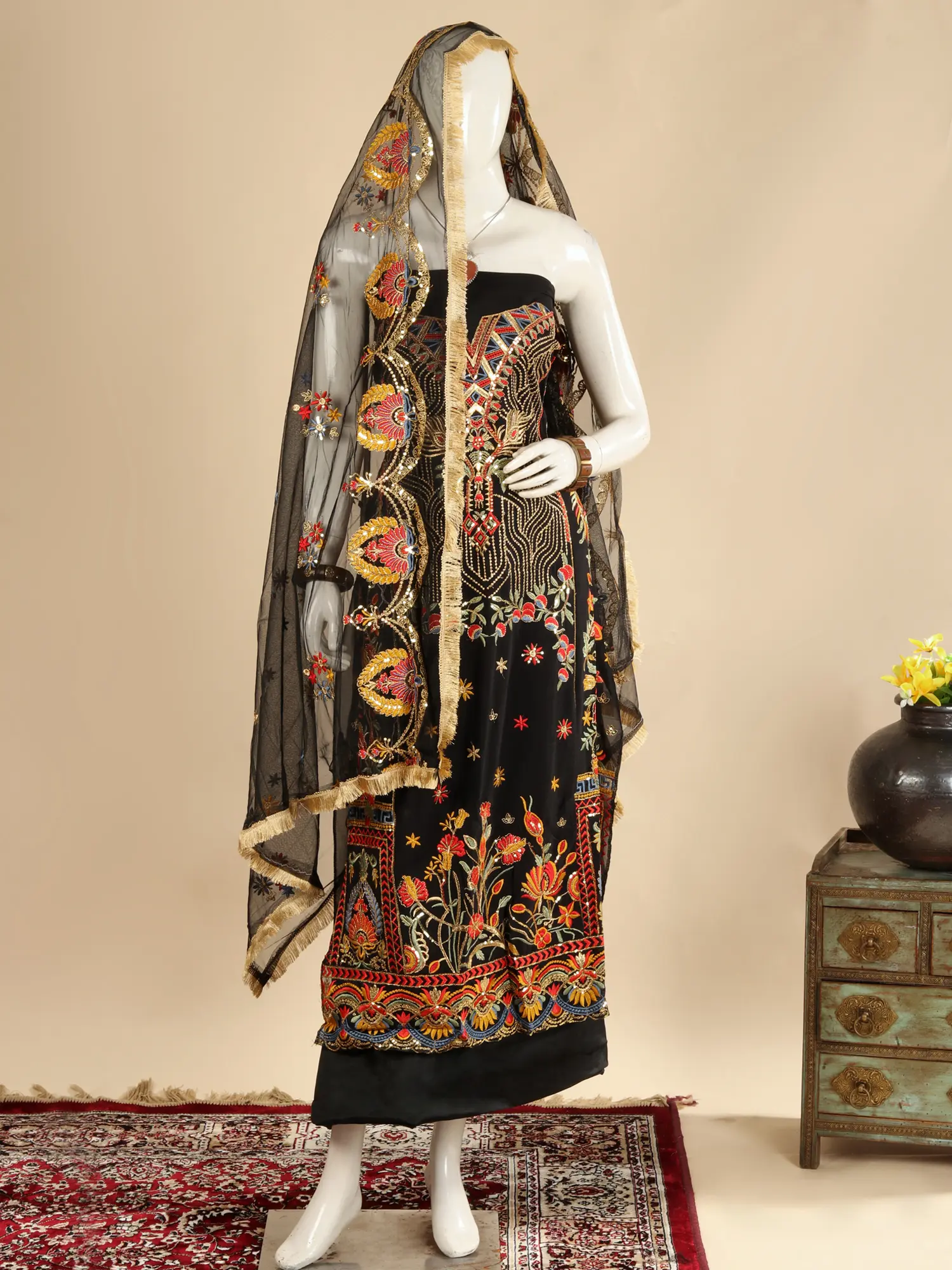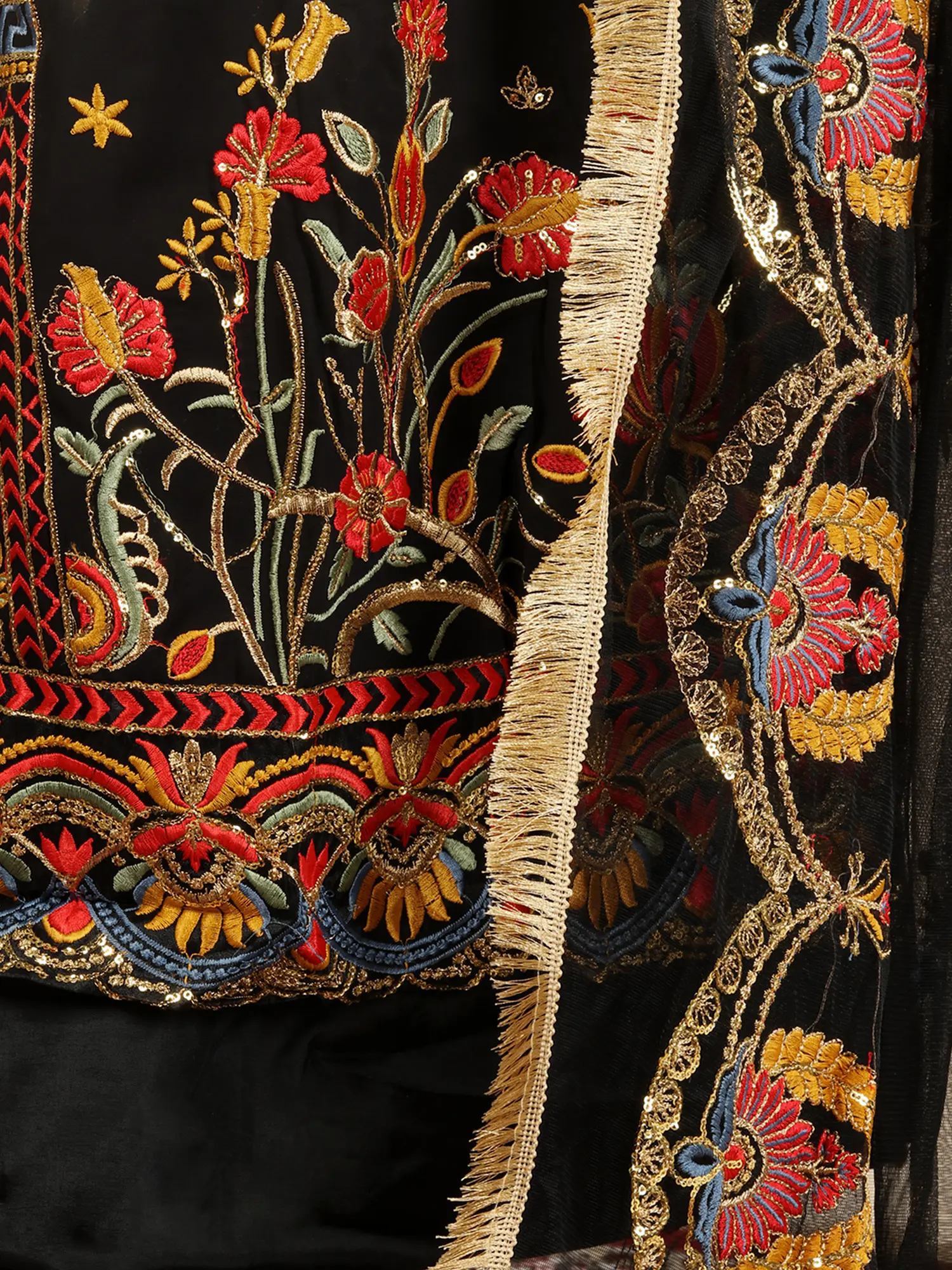 Black Crepe Embroidered Palazzo Suit Set With Plain Dupatta