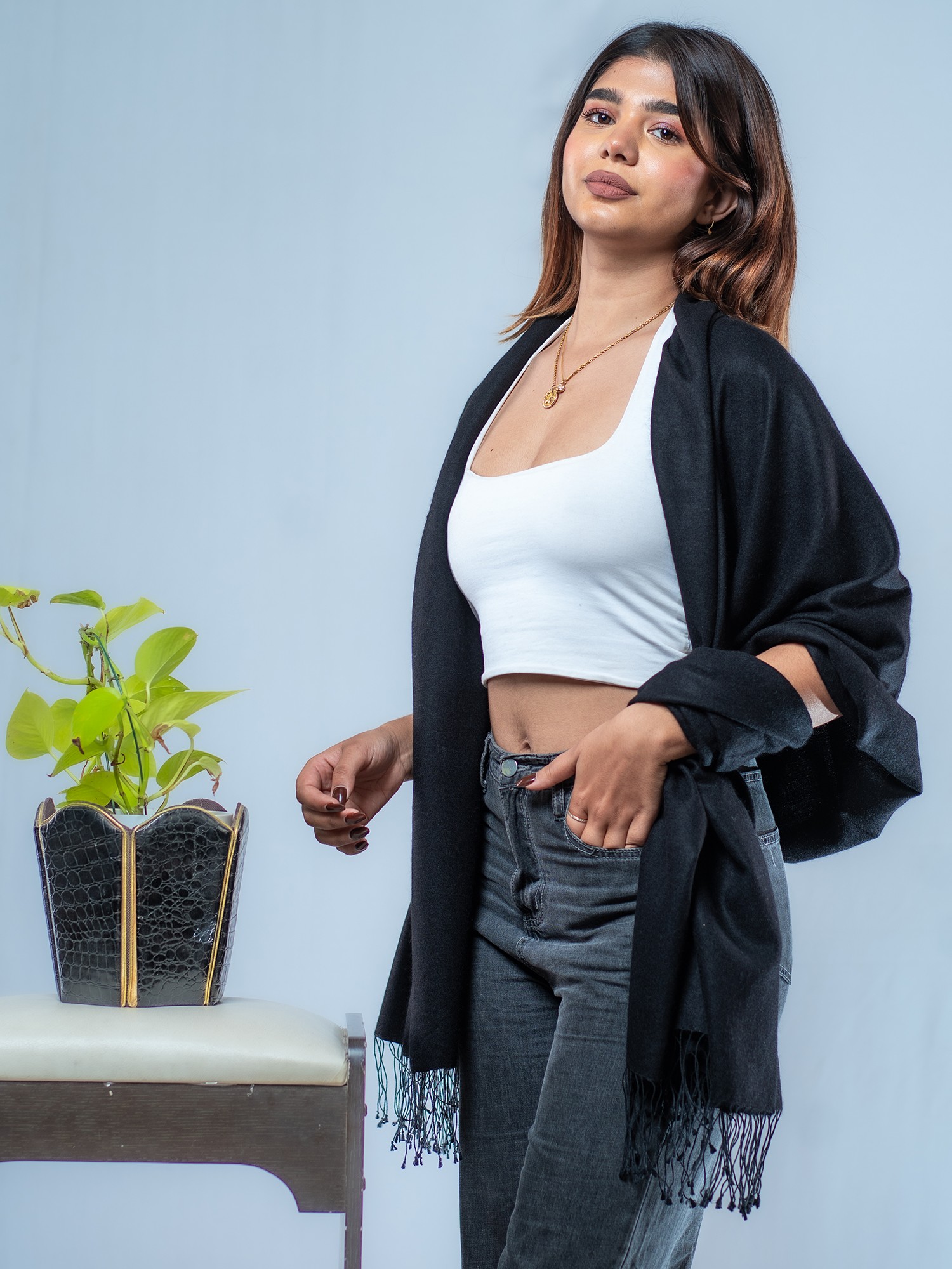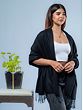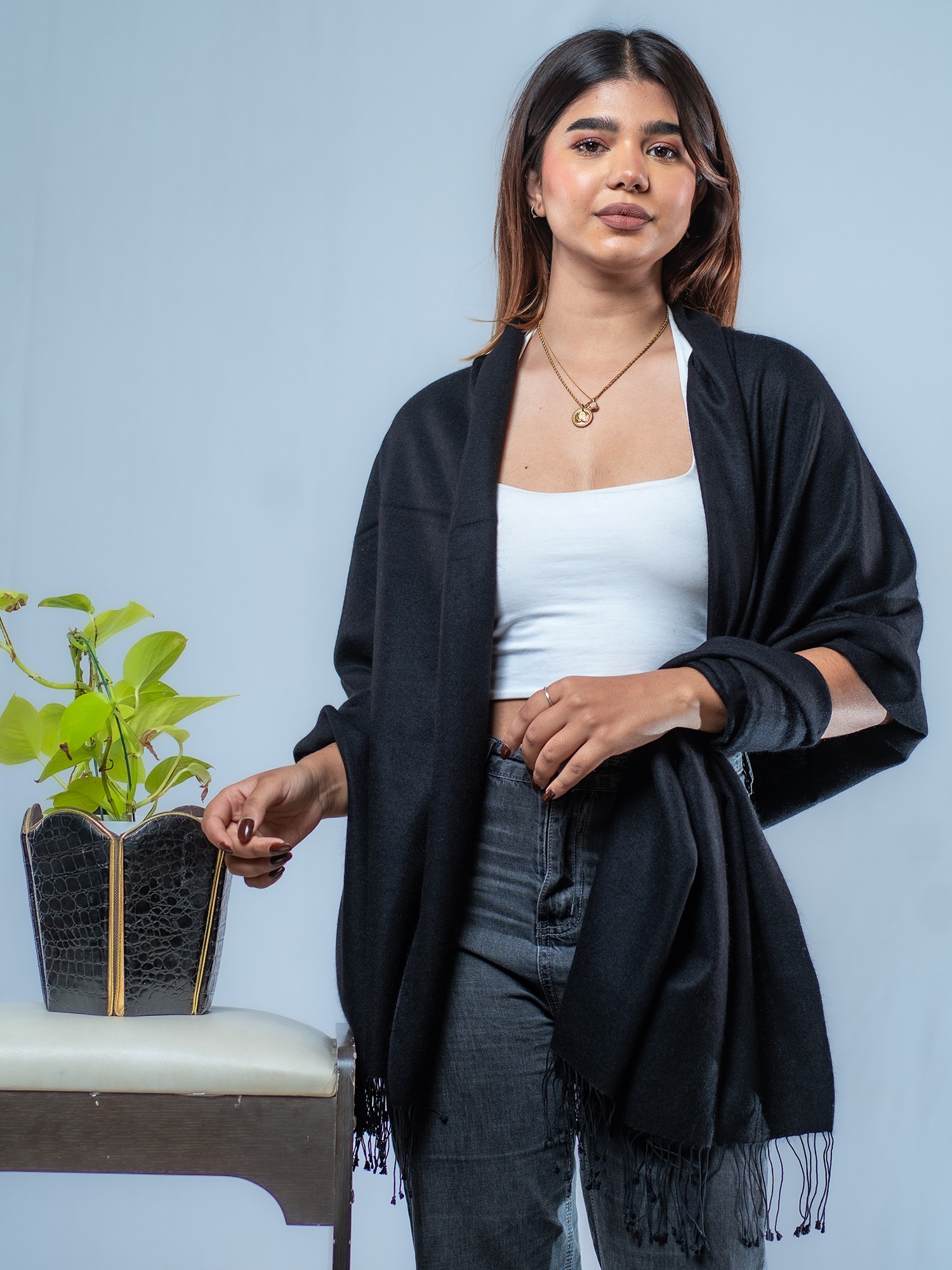 Phantom-Black Kashmiri Pure Pashmina Shawl with Papier Mache Hand-Embroidered Paisleys and Maple Leaves