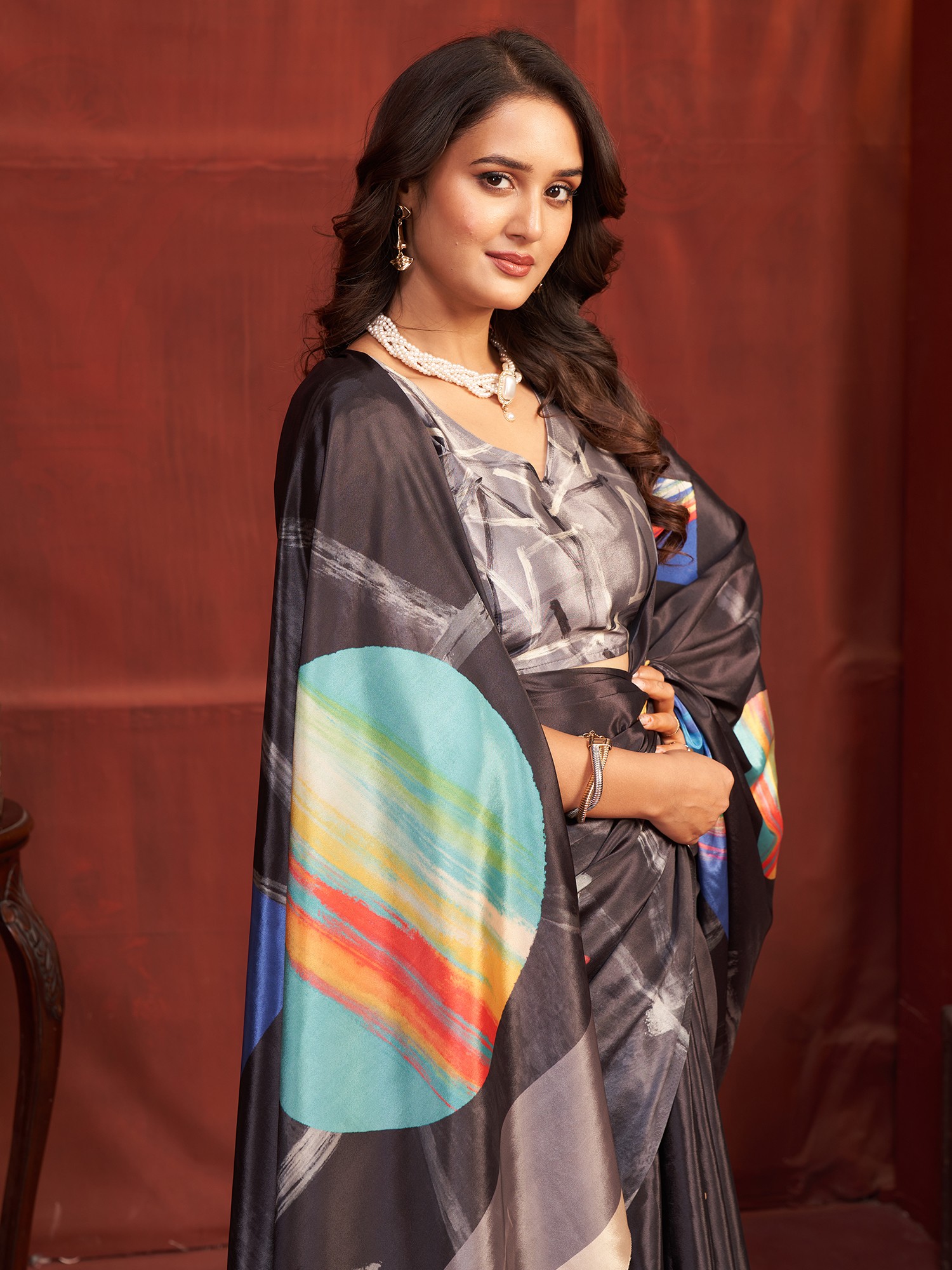 Steel-Grey Crepe Silk Deep Print Saree Contemporary Designer Lightweight Stylish Elegant Partywear Sari