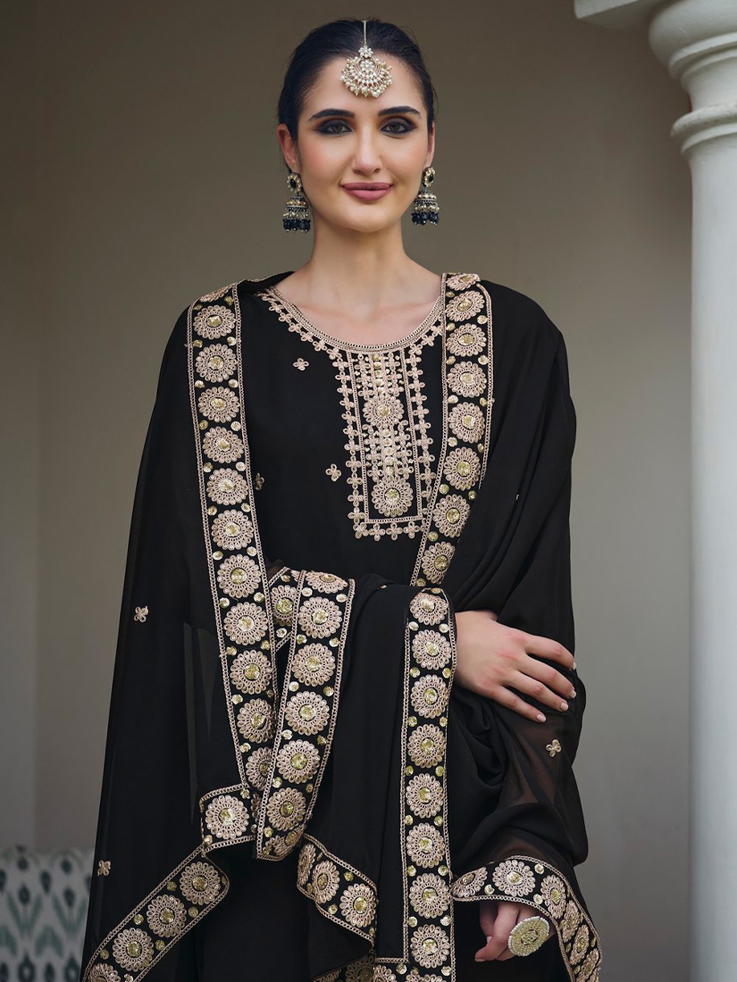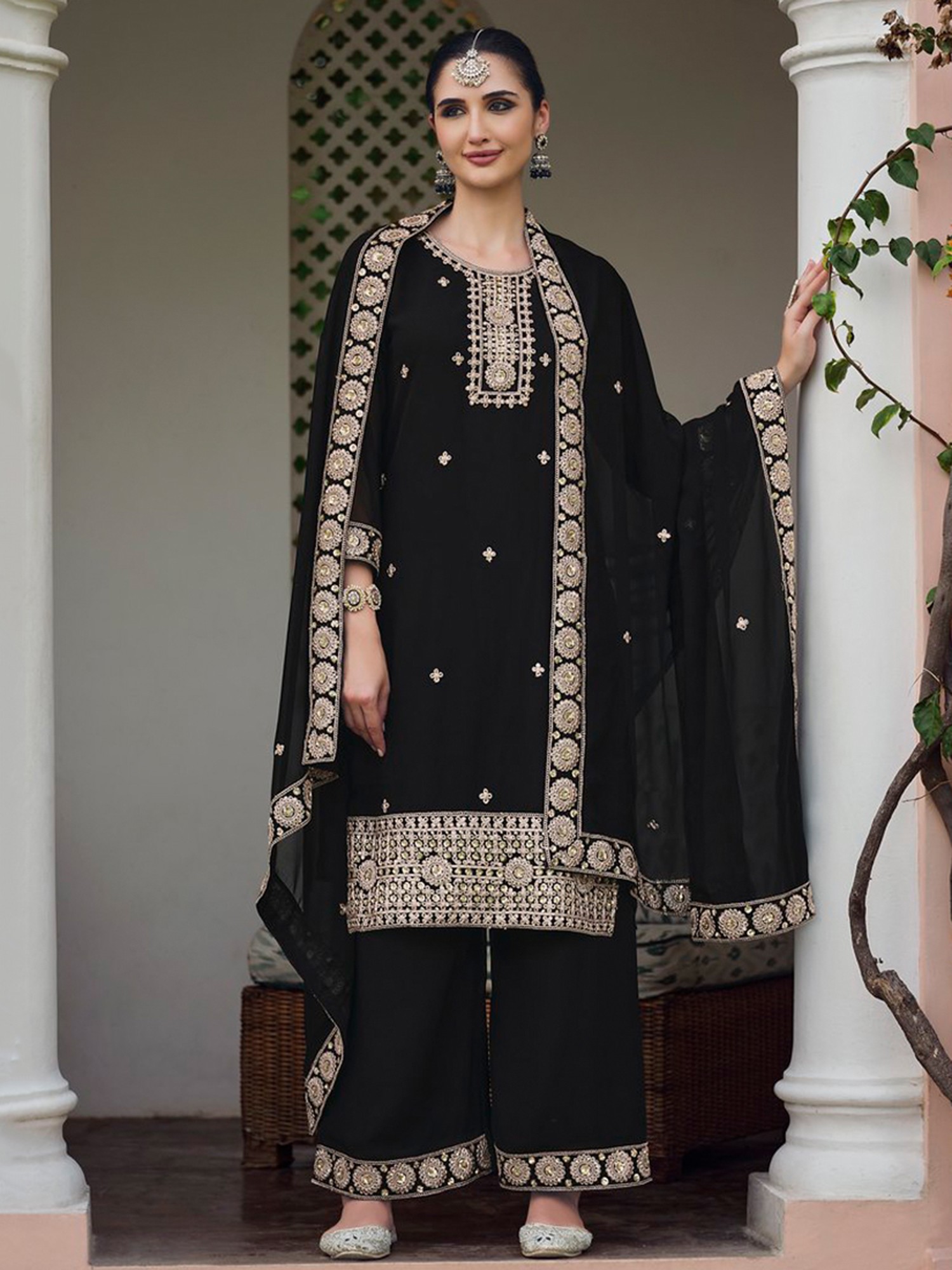 Step into the spotlight with this ensemble that exudes sophisticated charm and festive grace. The rich black canvas serves as the perfect backdrop for the intricate embroidery that adorns this stunning kurta, palazzo, and dupatta set. Crafted for those special occasions where you want to make a lasting impression, this outfit embodies refined style.