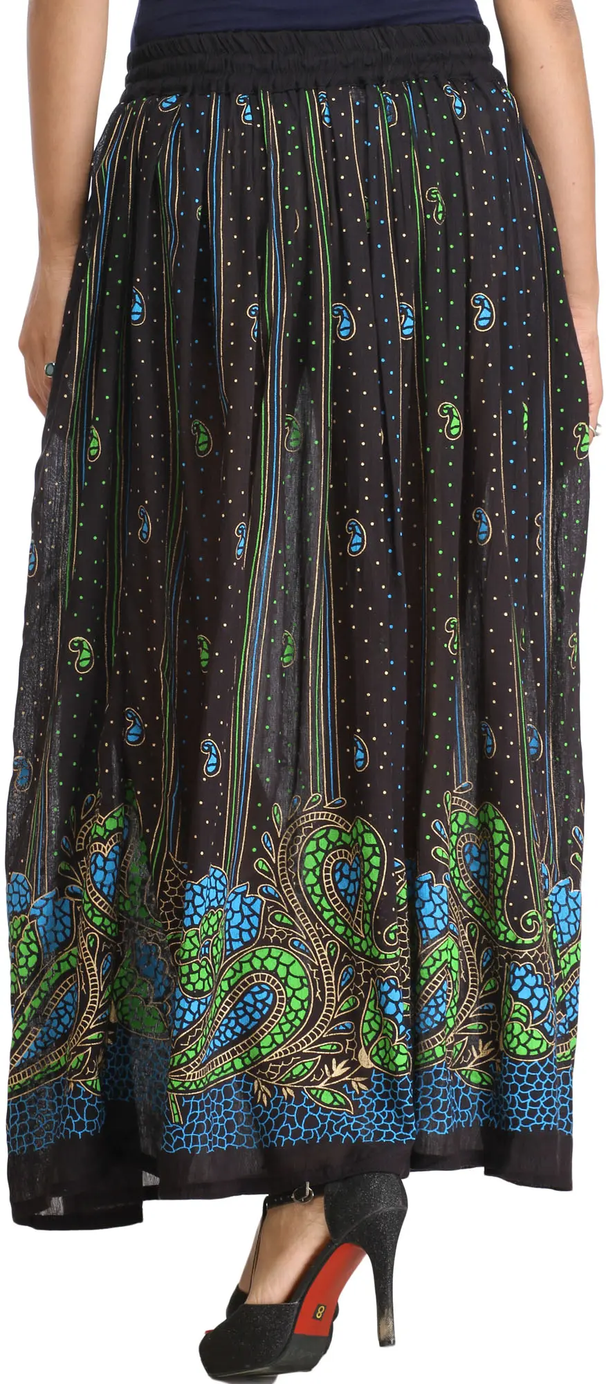 Discover a skirt that blends comfort, style, and a vibrant aesthetic. Crafted from soft and breathable rayon, this long skirt drapes beautifully, offering a flattering silhouette for all body types. The rich black base serves as a canvas for a captivating print, featuring a lively interplay of vertical stripes in blues and greens, punctuated by delicate white polka dots and the iconic paisley motif. This unique design creates a visually dynamic pattern that is both eye-catching and sophisticated.