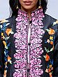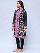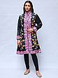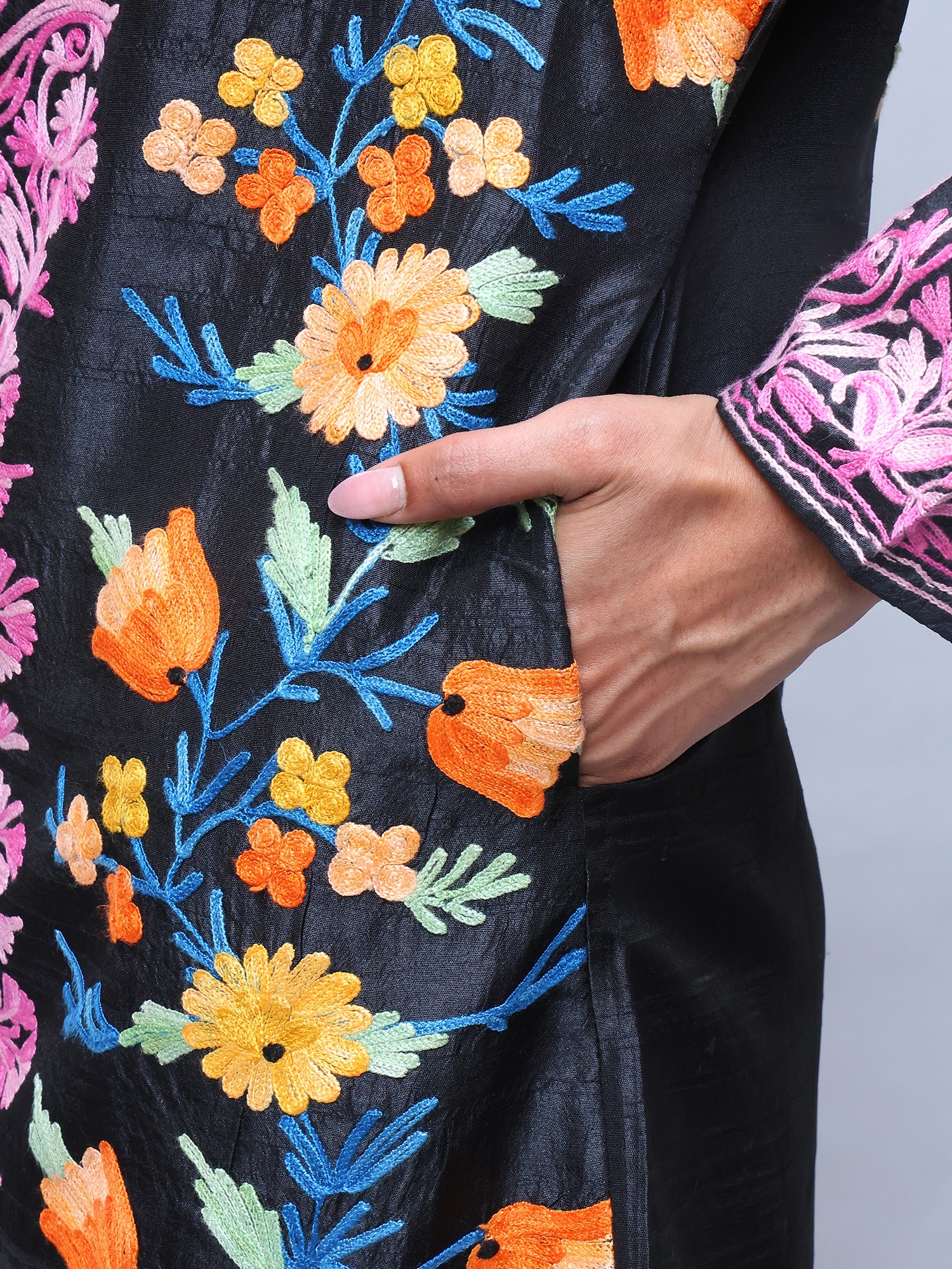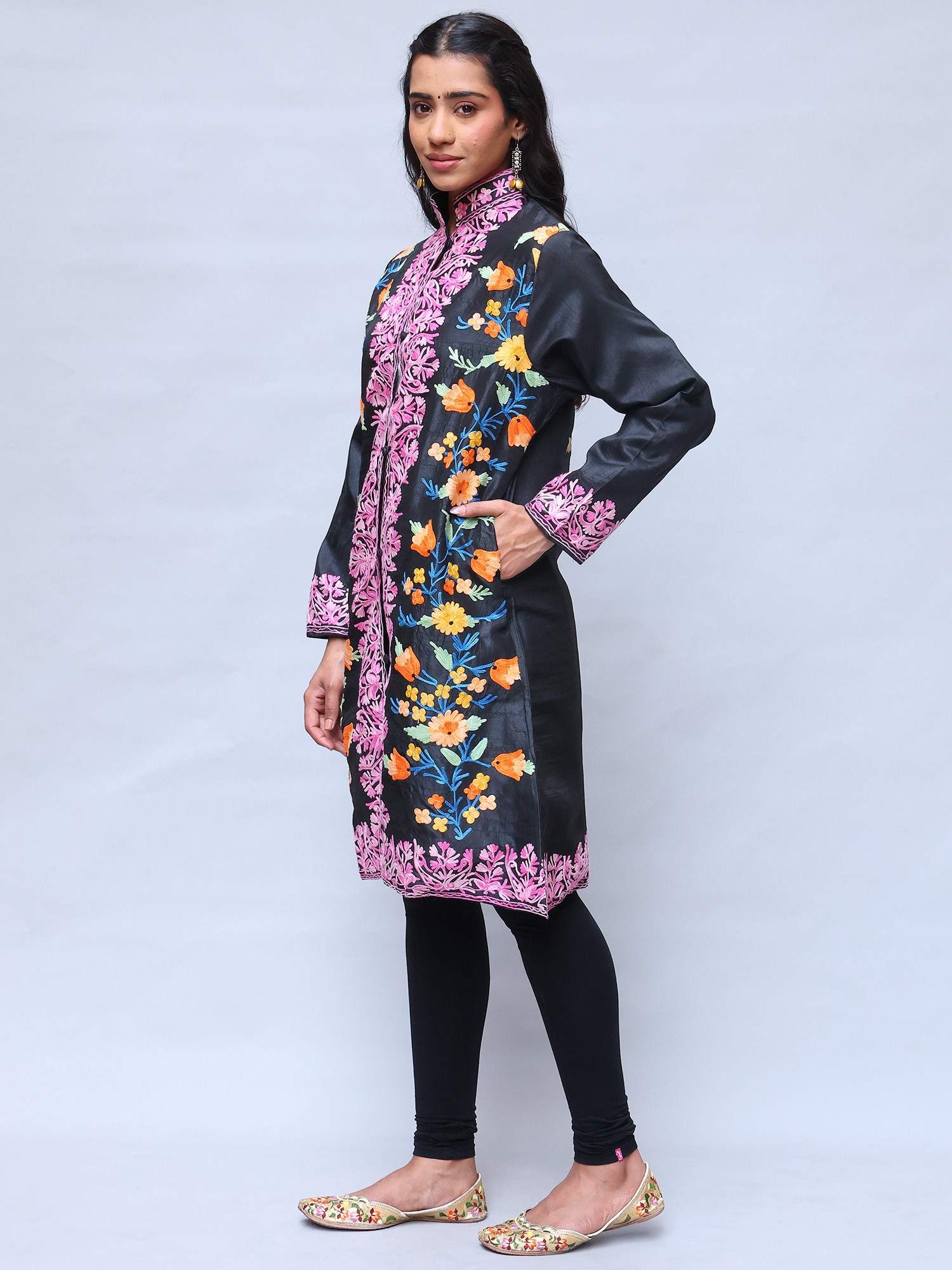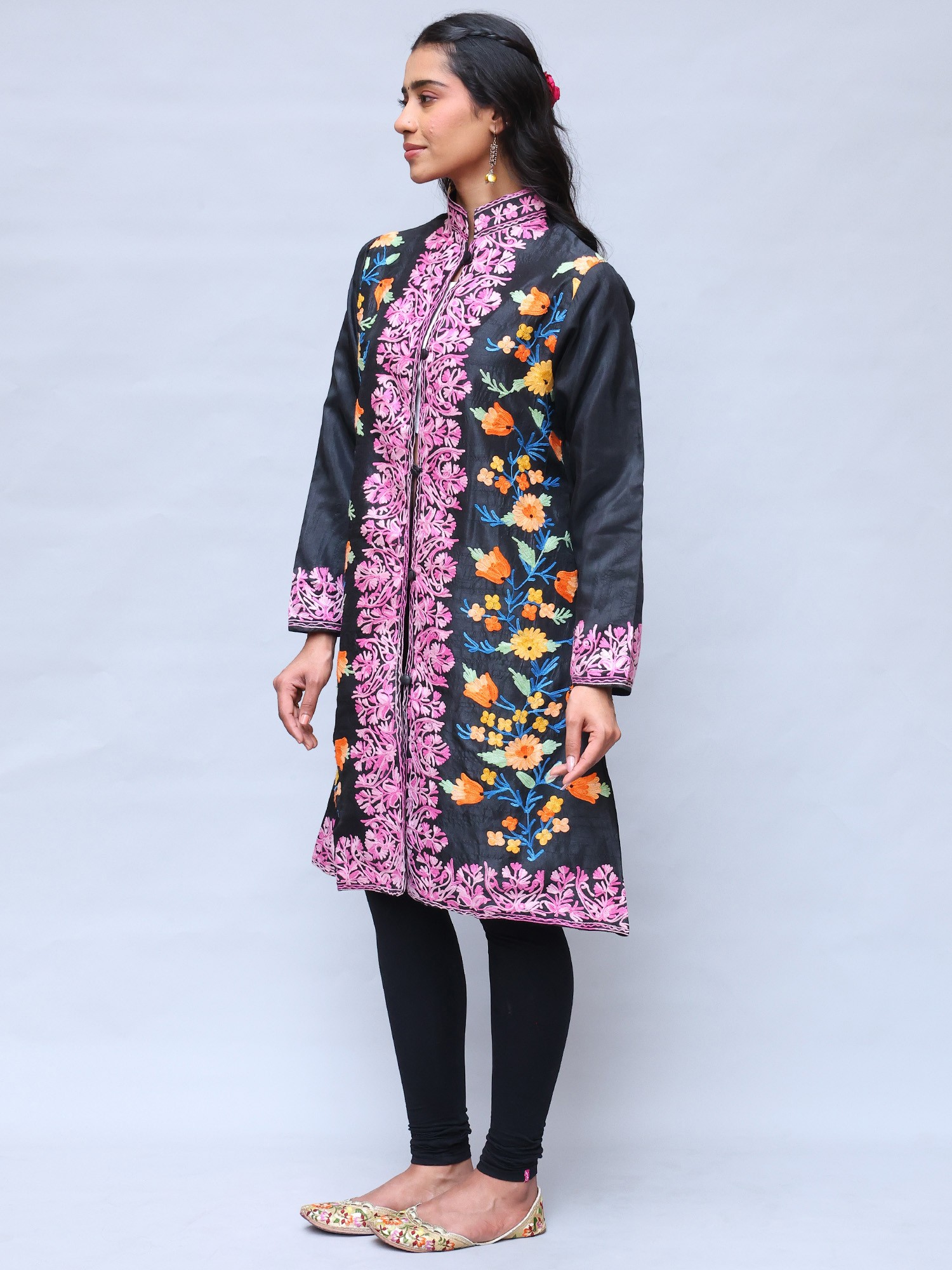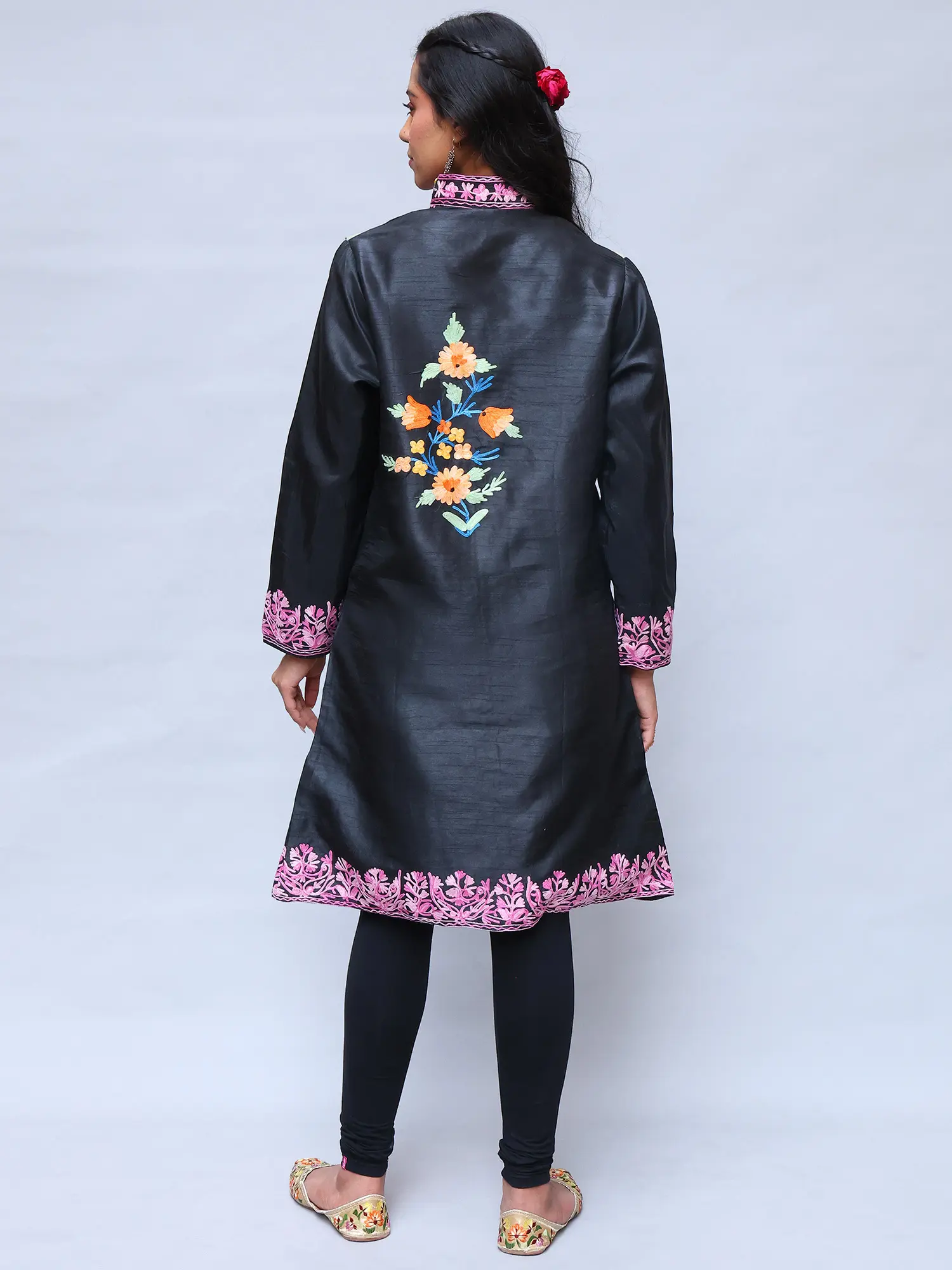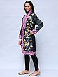 Pirate-Black Wool Long Jacket with All-Over Aari Embroidered Maple Vines from Kashmir