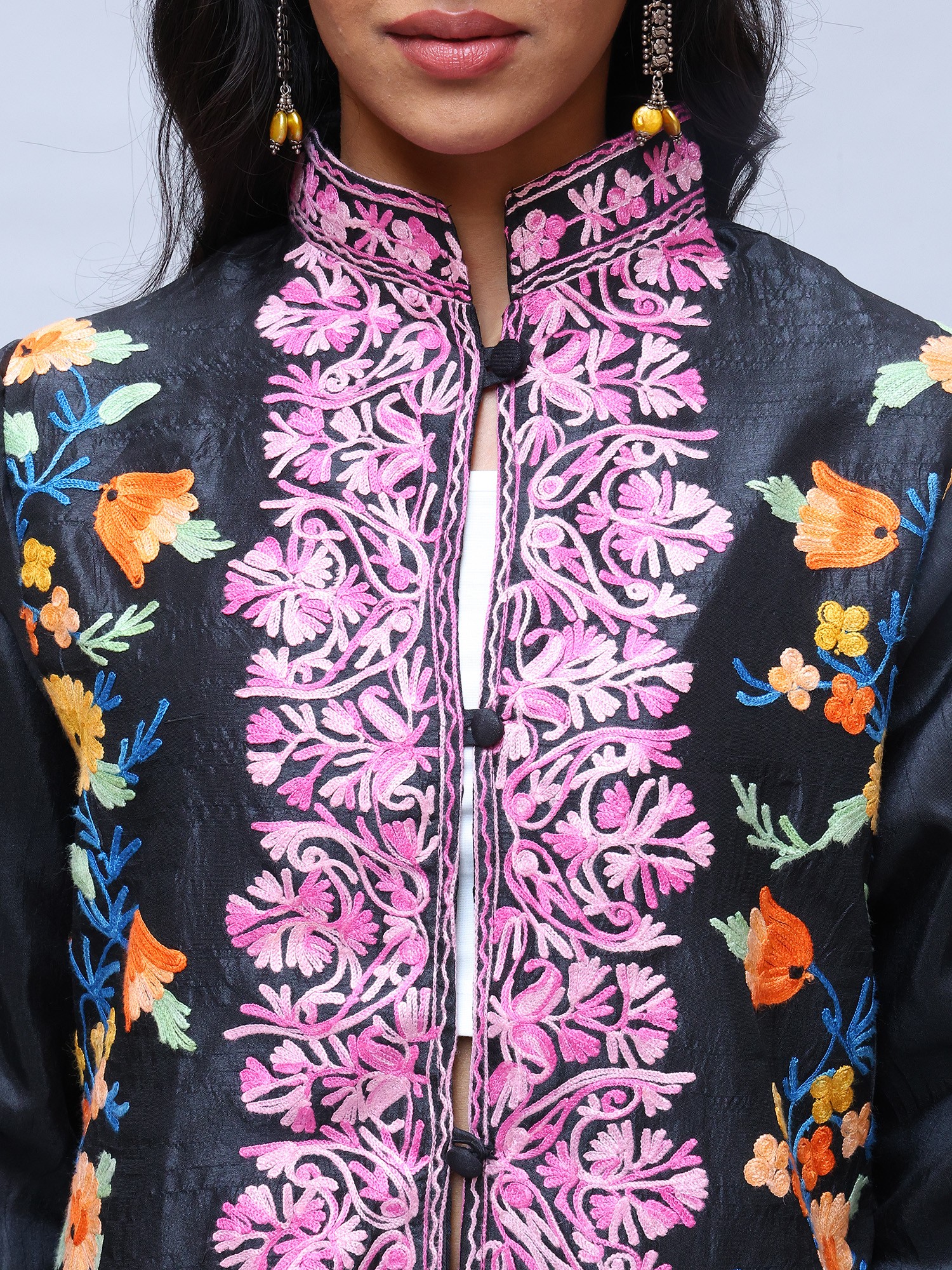 Frosted-Almond Kashmiri Long Jacket with Aari Embroidered Flowers in Multicolor Thread