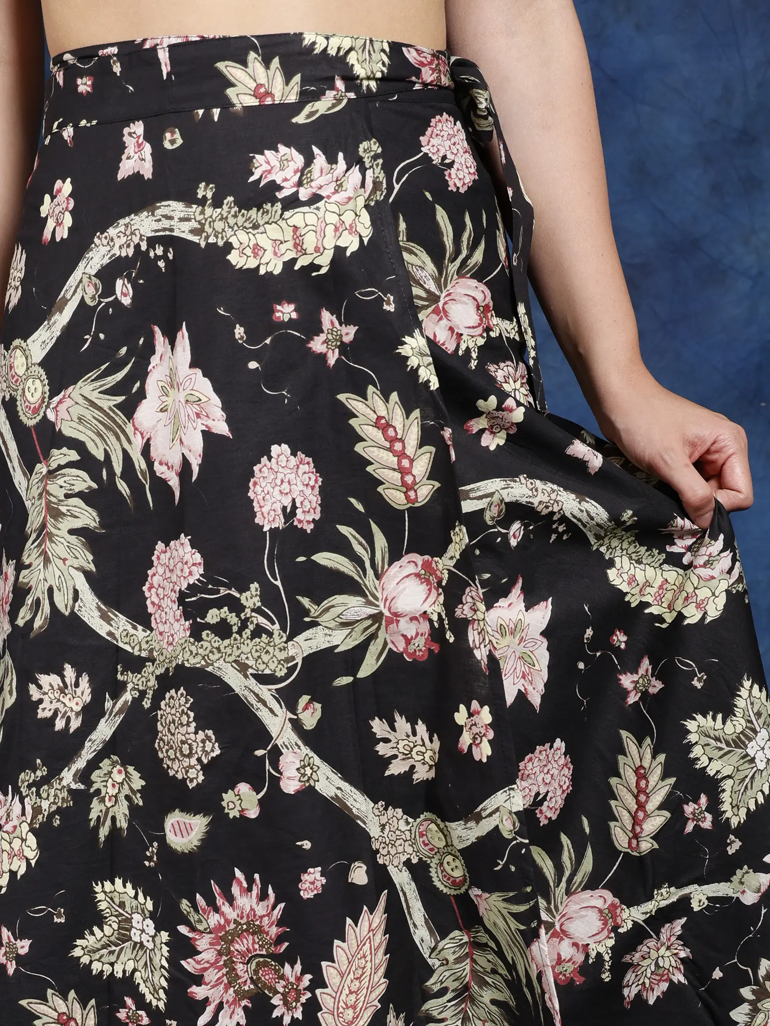 Cotton’s comfort and timeless charm of floral pattern come together in this stunning black-olive wrap-around skirt.