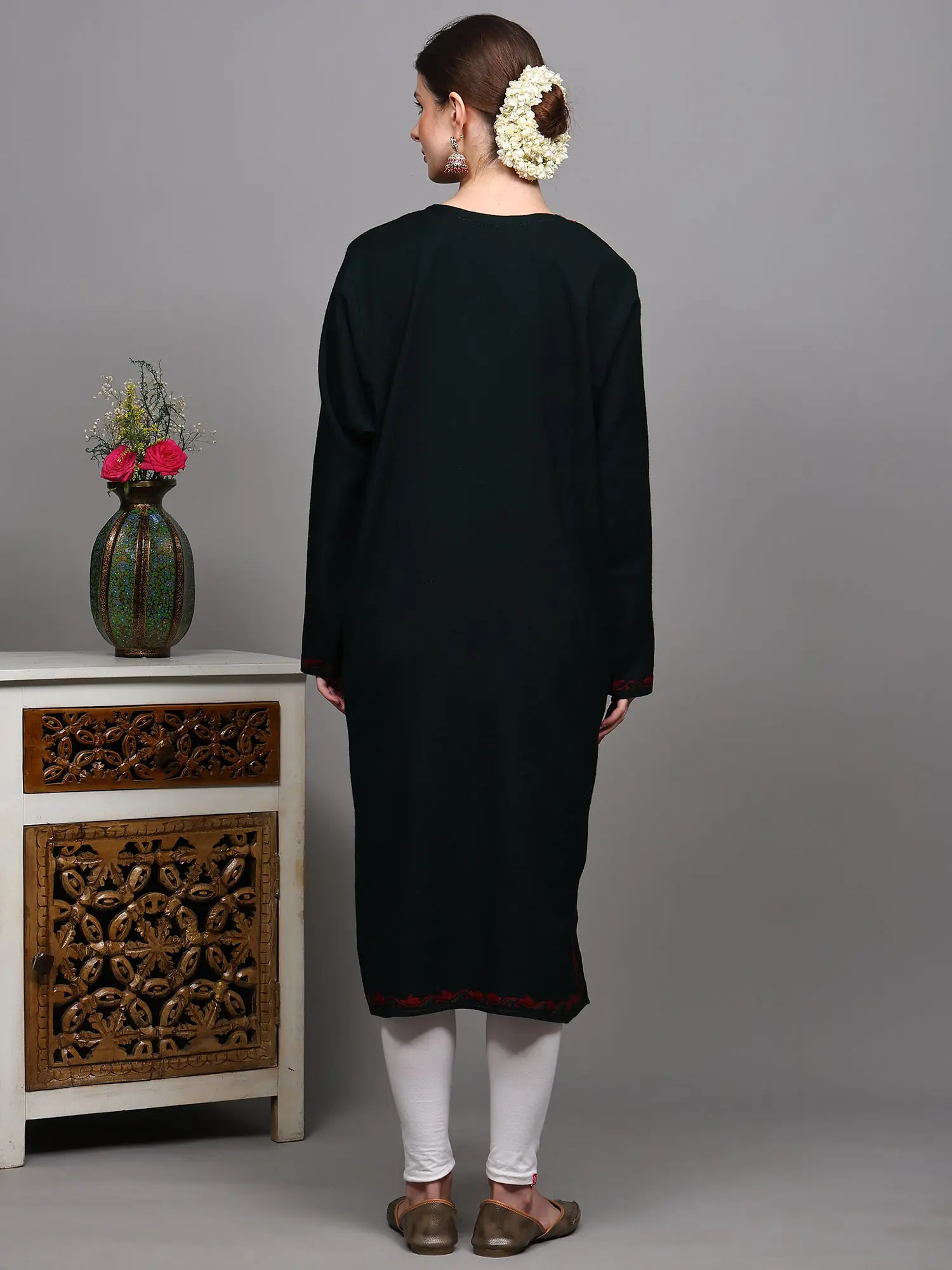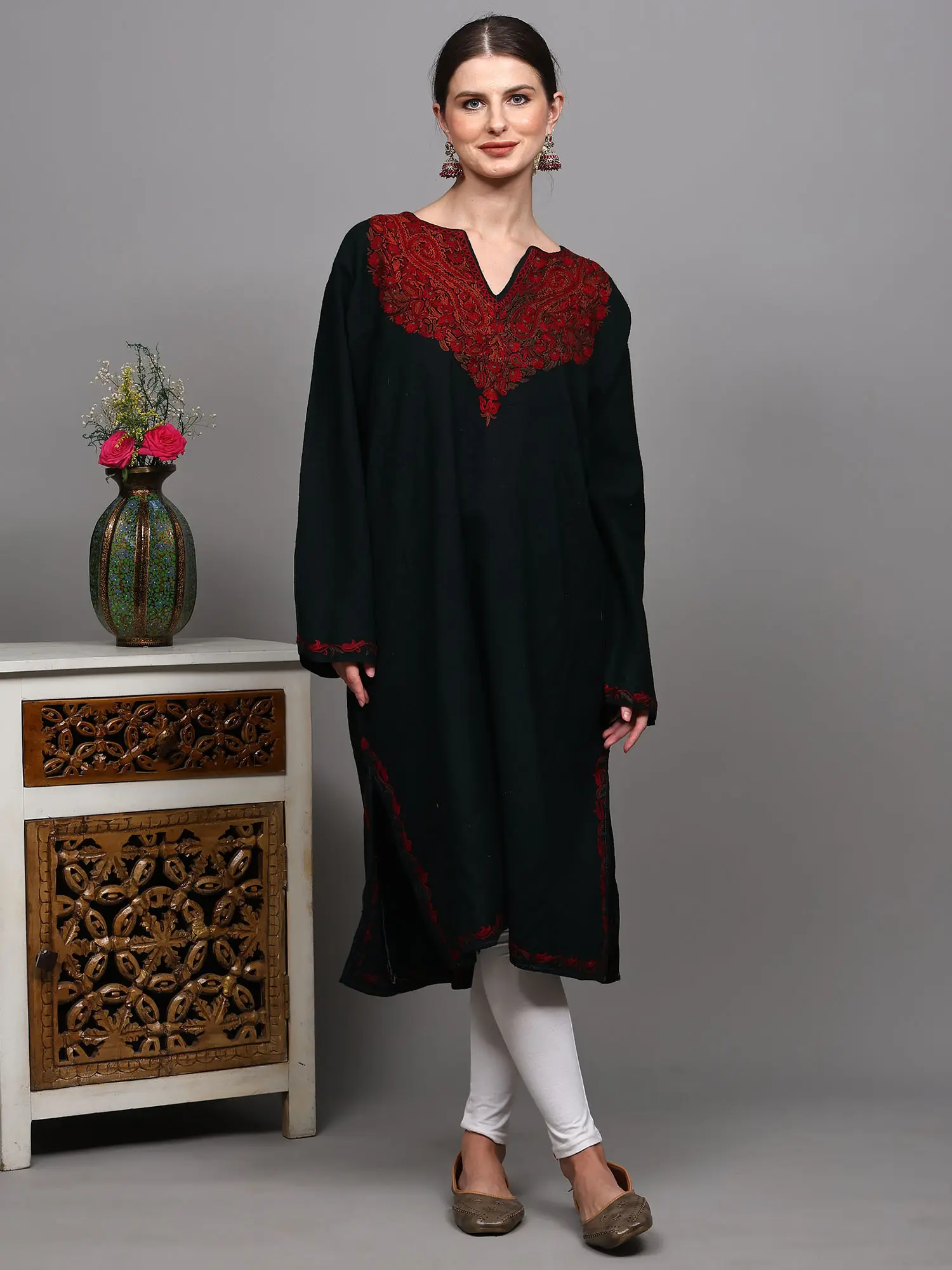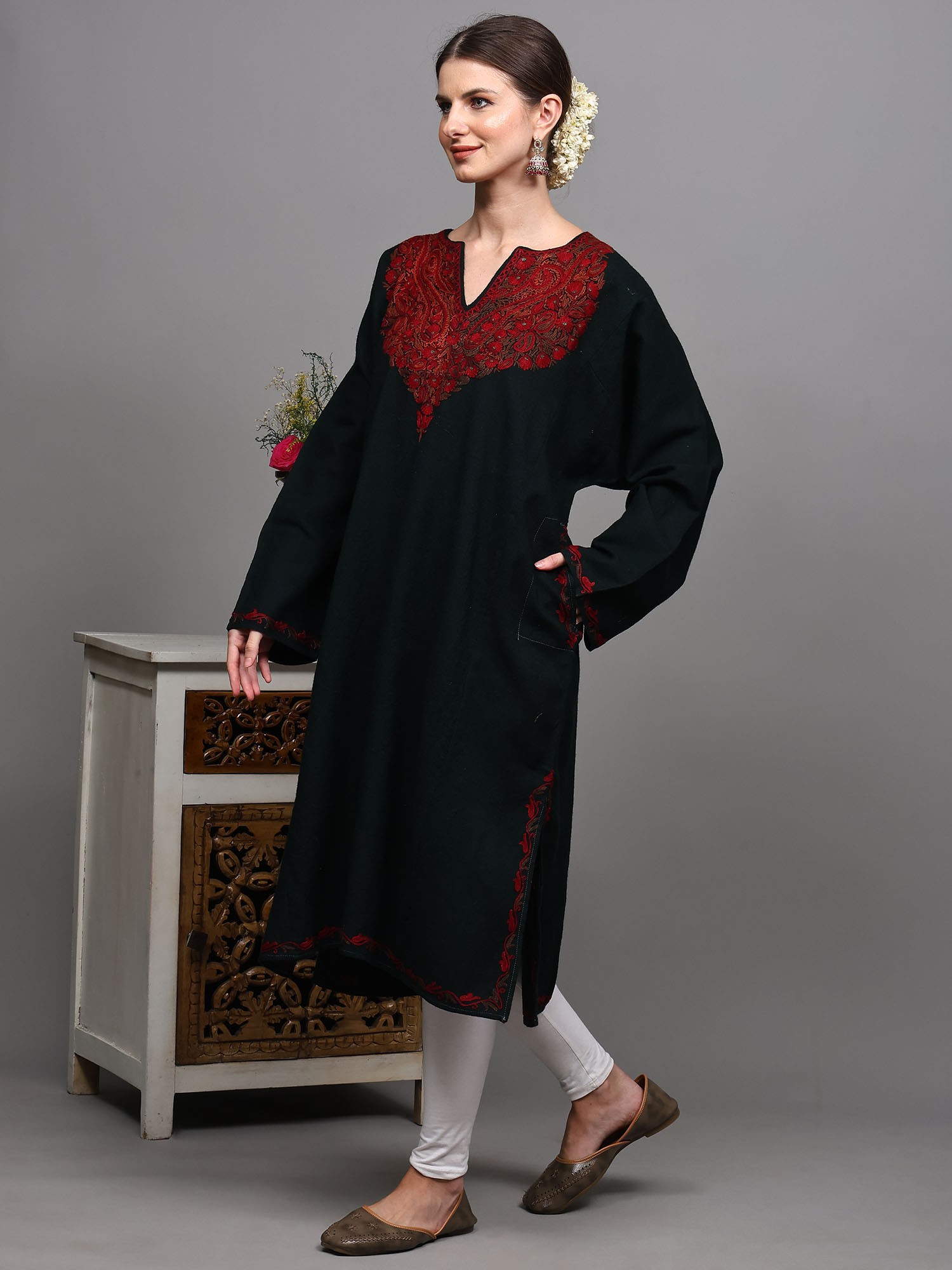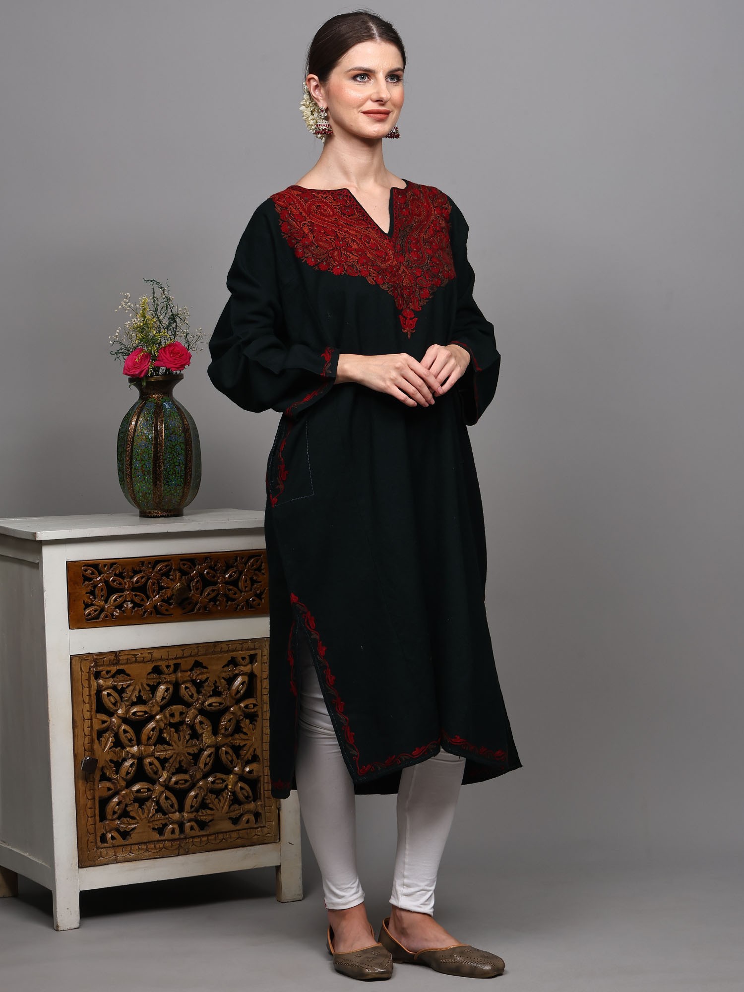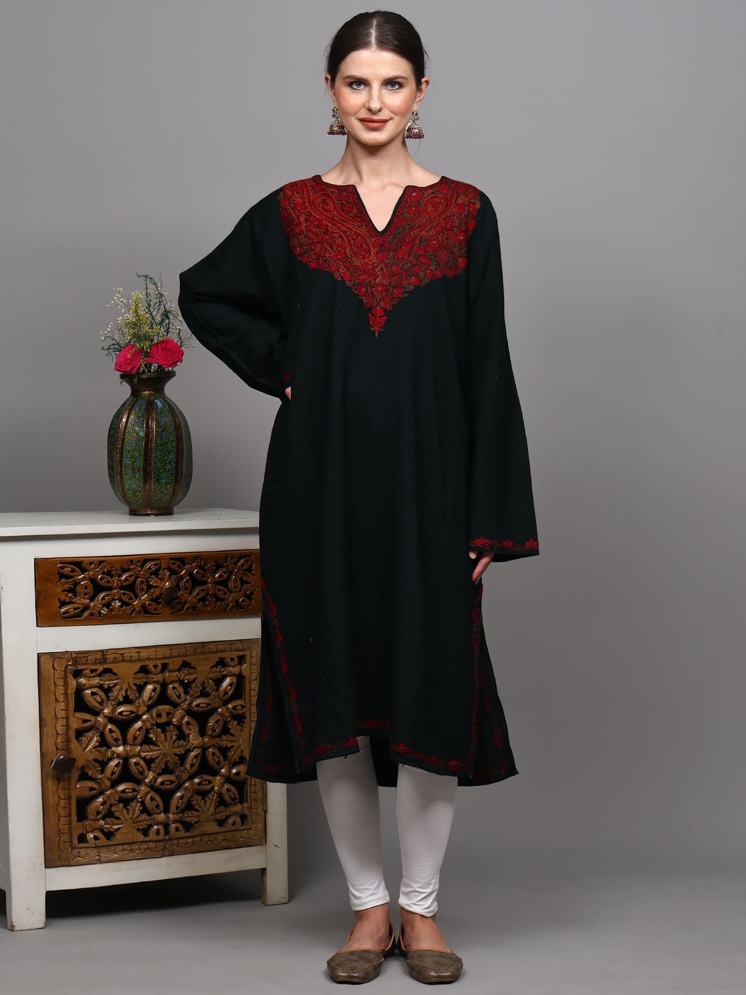 This phiran is more than just a garment; it's an heirloom. Its timeless design and exceptional quality make it suitable for a variety of occasions. Dress it up for festive gatherings, cultural events, or elegant evenings out. The rich wool and intricate embroidery create a sense of occasion, while the comfortable design ensures you feel relaxed and confident. For a more casual yet chic look, it can be worn for everyday outings, offering both warmth and undeniable style. This piece is a celebration of Kashmiri heritage, designed to be cherished and worn for years to come.